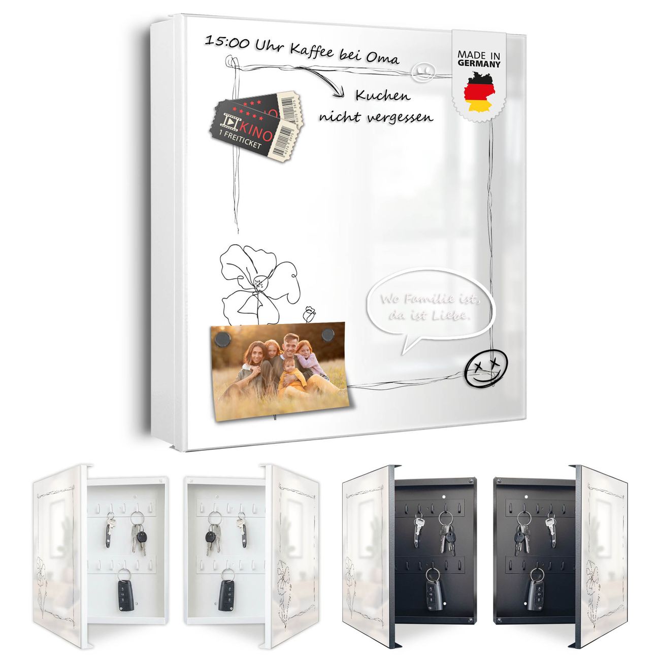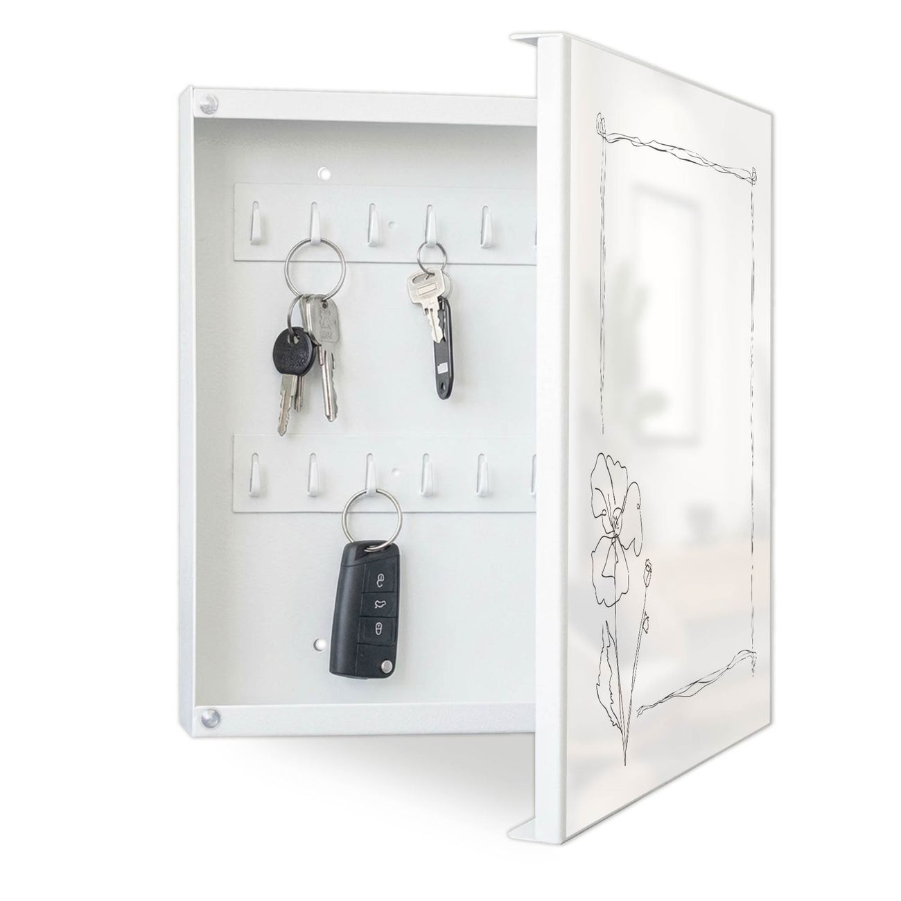 Bringe Ordnung und Eleganz in deinen Eingangsbereich mit dem banjado Schlüsselkasten Motiv Motiv Blumenrahmen Skizze. Die moderne Schlüsselbox kombiniert funktionales Design mit hochwertiger Verarbeitung und wird so zu einem echten Hingucker in Flur, Büro oder Ferienwohnung. ✅ Stilvolle Schlüsselaufbewahrung mit Motiv Motiv Blumenrahmen Skizze Der Design-Schlüsselkasten Motiv Motiv Blumenrahmen Skizze bietet Platz für bis zu 32 Schlüssel, die auf 4 stabilen Reihen mit je 8 Haken übersichtlich verstaut werden. Mit seinen kompakten Maßen von 30 x 30 x 5 cm passt die Schlüsselbox perfekt auch in kleinere Räume. Der weiß lackierte Stahlkorpus mit rechts angeschlagenem Türscharnier harmoniert mit gedruckten Folie auf der Front und fügt sich nahtlos in jedes Wohnambiente ein. Ob als Schlüsselorganizer für Zuhause oder als praktische Lösung für Büros, Praxen und Gewerbe, der banjado Schlüsselkasten sorgt für Ordnung und Übersicht. Dank der magnetischen, mit Kreidestiften beschreibbaren Folie auf der Front kannst du Notizen anheften oder Termine direkt auf der Oberfläche festhalten. Die Schlüsselbox Motiv Motiv Blumenrahmen Skizze zur Wandmontage wird inklusive Befestigungsmaterial geliefert und ist schnell angebracht. So hast du deine Schlüssel jederzeit griffbereit und zugleich stilvoll verstaut. Mit diesem banjado Schlüsselkasten Motiv Motiv Blumenrahmen Skizze kombinierst du praktische Aufbewahrung mit stilvollem Wohndesign. Ob privat oder geschäftlich, die Schlüsselbox sorgt für mehr Ordnung, Übersicht und ein wohnliches Ambiente.Vorteile im Überblick