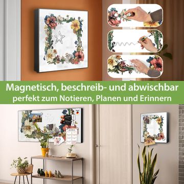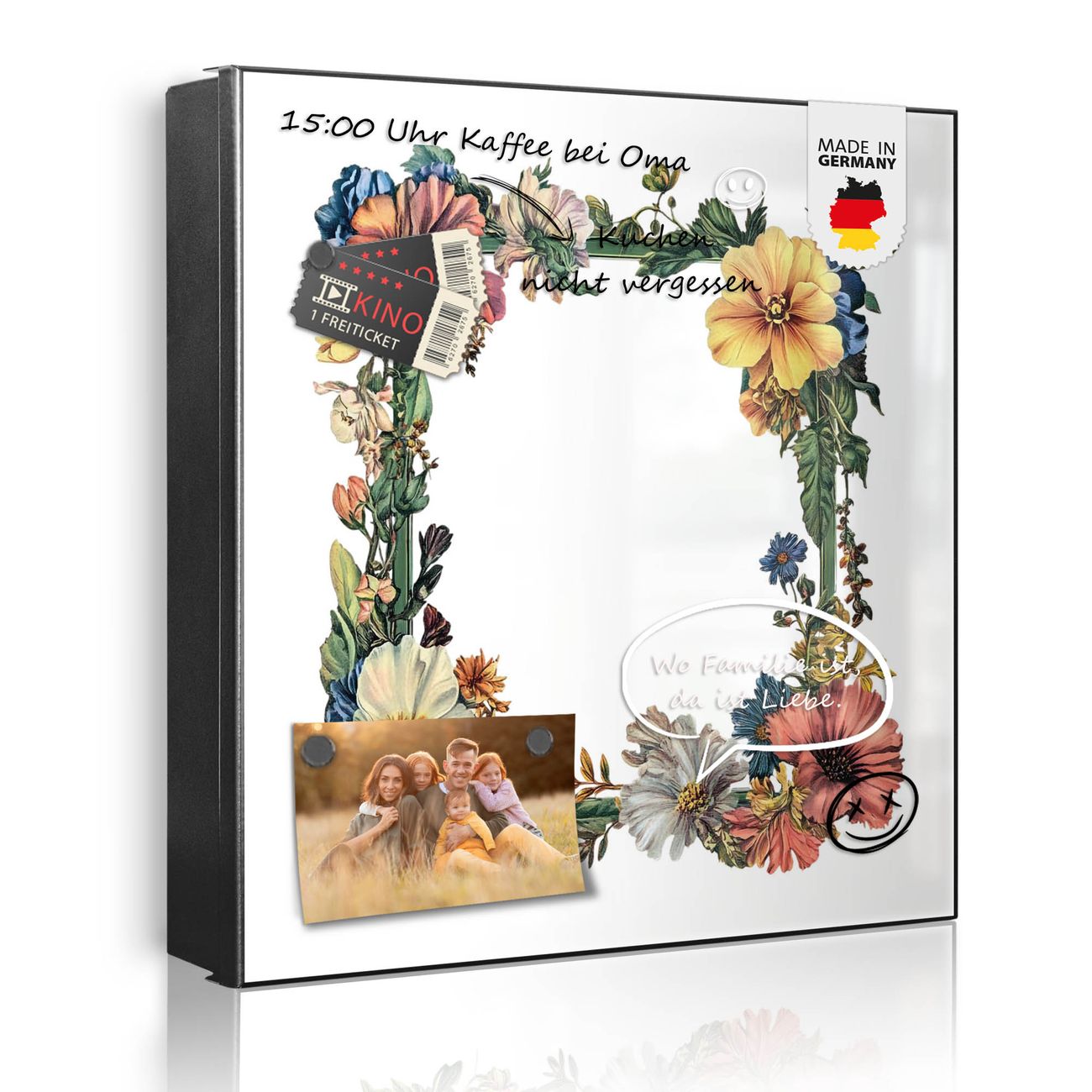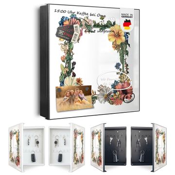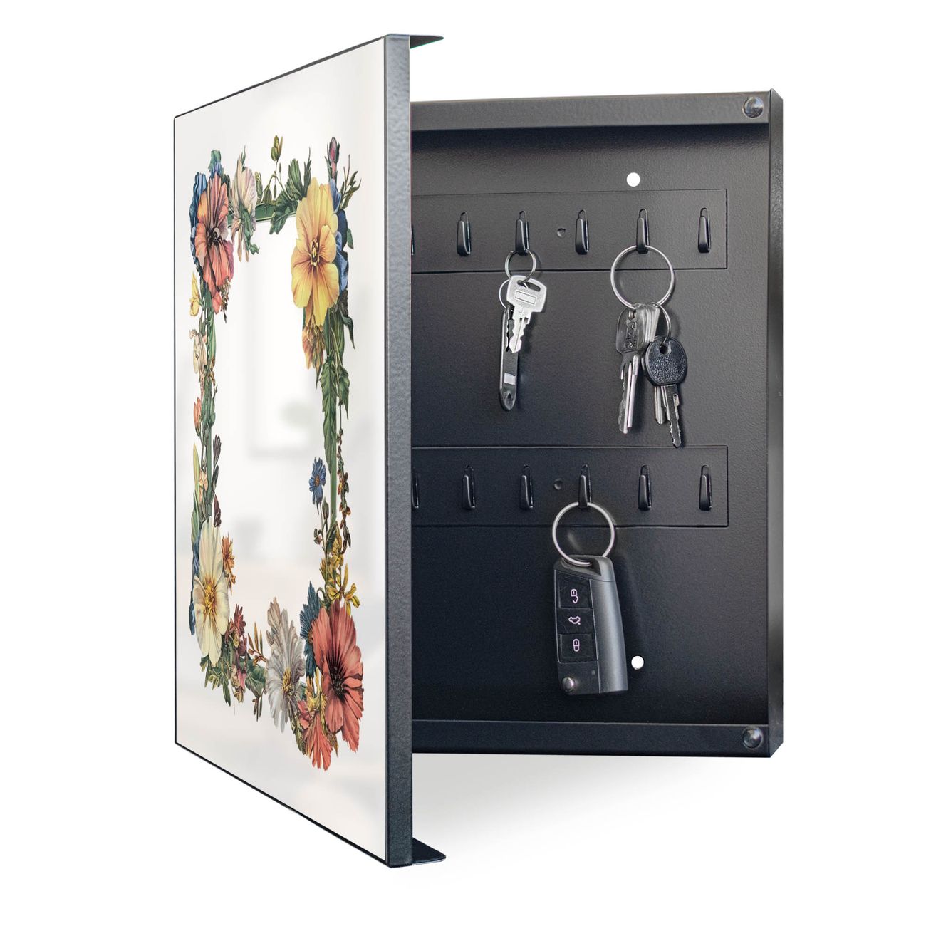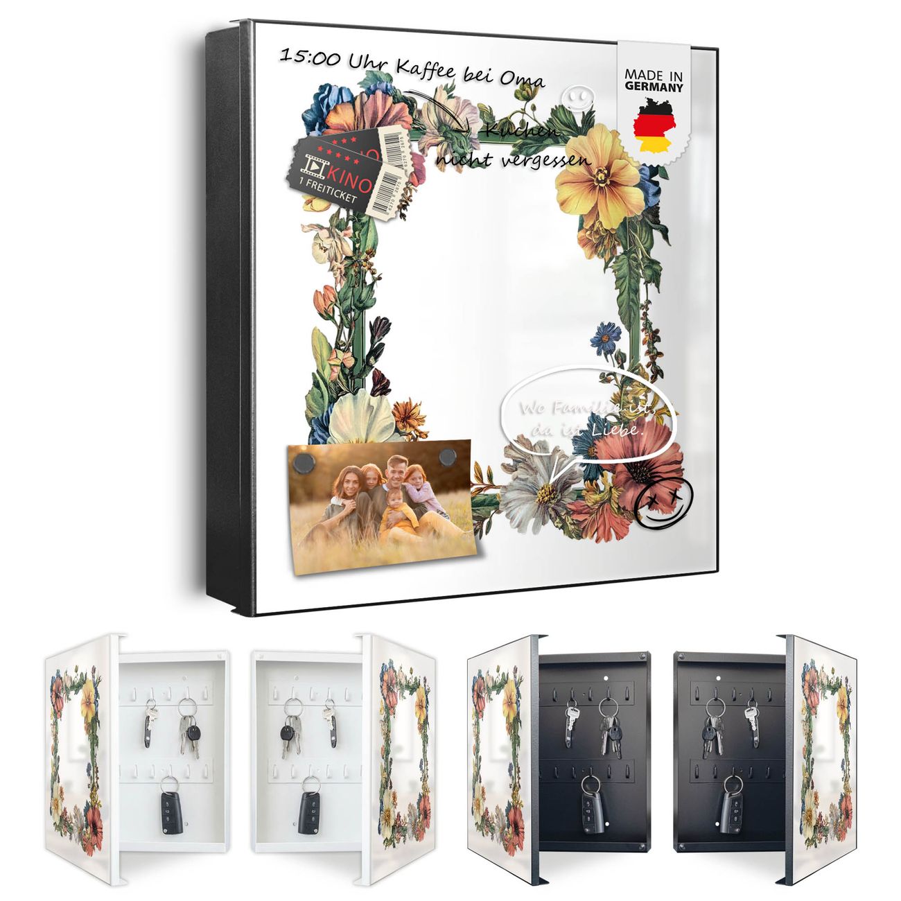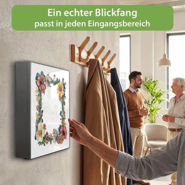 Bringe Ordnung und Eleganz in deinen Eingangsbereich mit dem banjado Schlüsselkasten Motiv Motiv Blumenrahmen. Die moderne Schlüsselbox kombiniert funktionales Design mit hochwertiger Verarbeitung und wird so zu einem echten Hingucker in Flur, Büro oder Ferienwohnung. ✅ Stilvolle Schlüsselaufbewahrung mit Motiv Motiv Blumenrahmen Der Design-Schlüsselkasten Motiv Motiv Blumenrahmen bietet Platz für bis zu 32 Schlüssel, die auf 4 stabilen Reihen mit je 8 Haken übersichtlich verstaut werden. Mit seinen kompakten Maßen von 30 x 30 x 5 cm passt die Schlüsselbox perfekt auch in kleinere Räume. Der schwarz lackierte Stahlkorpus mit links angeschlagenem Türscharnier harmoniert mit gedruckten Folie auf der Front und fügt sich nahtlos in jedes Wohnambiente ein. Ob als Schlüsselorganizer für Zuhause oder als praktische Lösung für Büros, Praxen und Gewerbe, der banjado Schlüsselkasten sorgt für Ordnung und Übersicht. Dank der magnetischen, mit Kreidestiften beschreibbaren Folie auf der Front kannst du Notizen anheften oder Termine direkt auf der Oberfläche festhalten. Die Schlüsselbox Motiv Motiv Blumenrahmen zur Wandmontage wird inklusive Befestigungsmaterial geliefert und ist schnell angebracht. So hast du deine Schlüssel jederzeit griffbereit und zugleich stilvoll verstaut. Mit diesem banjado Schlüsselkasten Motiv Motiv Blumenrahmen kombinierst du praktische Aufbewahrung mit stilvollem Wohndesign. Ob privat oder geschäftlich, die Schlüsselbox sorgt für mehr Ordnung, Übersicht und ein wohnliches Ambiente.Vorteile im Überblick