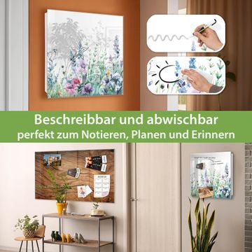 Bringe Ordnung und Eleganz in deinen Eingangsbereich mit dem banjado Schlüsselkasten Motiv Motiv Blumenwiese in Aquarell. Die moderne Schlüsselbox kombiniert funktionales Design mit hochwertiger Verarbeitung und wird so zu einem echten Hingucker in Flur, Büro oder Ferienwohnung. ✅ Stilvolle Schlüsselaufbewahrung mit Glasfront im Motiv Motiv Blumenwiese in Aquarell Der Design-Schlüsselkasten Motiv Motiv Blumenwiese in Aquarell bietet Platz für bis zu 50 Schlüssel, die auf 5 stabilen Reihen mit je 10 Haken übersichtlich verstaut werden. Mit seinen kompakten Maßen von 30 x 30 x 5 cm passt die Schlüsselbox perfekt auch in kleinere Räume. Der weiß lackierte Stahlkorpus mit rechts angeschlagenem Türscharnier harmoniert mit der Glasfront und fügt sich nahtlos in jedes Wohnambiente ein. Ob als Schlüsselorganizer für Zuhause oder als praktische Lösung für Büros, Praxen und Gewerbe, der banjado Schlüsselkasten sorgt für Ordnung und Übersicht. Dank der magnetischen, mit Kreidestiften beschreibbaren Glasfront kannst du Notizen anheften oder Termine direkt auf der Oberfläche festhalten. Die Schlüsselbox Motiv Motiv Blumenwiese in Aquarell zur Wandmontage wird inklusive Befestigungsmaterial geliefert und ist schnell angebracht. So hast du deine Schlüssel jederzeit griffbereit und zugleich stilvoll verstaut. Mit diesem banjado Schlüsselkasten Motiv Motiv Blumenwiese in Aquarell kombinierst du praktische Aufbewahrung mit stilvollem Wohndesign. Ob privat oder geschäftlich, die Schlüsselbox sorgt für mehr Ordnung, Übersicht und ein wohnliches Ambiente.Vorteile im Überblick