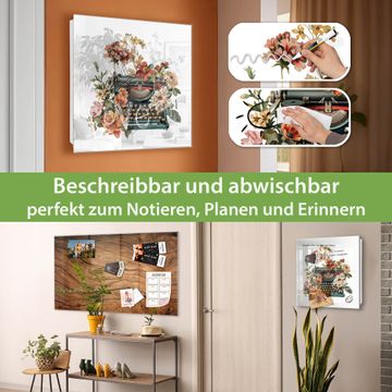 Bringe Ordnung und Eleganz in deinen Eingangsbereich mit dem banjado Schlüsselkasten Motiv Motiv Blumige Schreibmaschine. Die moderne Schlüsselbox kombiniert funktionales Design mit hochwertiger Verarbeitung und wird so zu einem echten Hingucker in Flur, Büro oder Ferienwohnung. ✅ Stilvolle Schlüsselaufbewahrung mit Glasfront im Motiv Motiv Blumige Schreibmaschine Der Design-Schlüsselkasten Motiv Motiv Blumige Schreibmaschine bietet Platz für bis zu 50 Schlüssel, die auf 5 stabilen Reihen mit je 10 Haken übersichtlich verstaut werden. Mit seinen kompakten Maßen von 30 x 30 x 5 cm passt die Schlüsselbox perfekt auch in kleinere Räume. Der weiß lackierte Stahlkorpus mit rechts angeschlagenem Türscharnier harmoniert mit der Glasfront und fügt sich nahtlos in jedes Wohnambiente ein. Ob als Schlüsselorganizer für Zuhause oder als praktische Lösung für Büros, Praxen und Gewerbe, der banjado Schlüsselkasten sorgt für Ordnung und Übersicht. Dank der magnetischen, mit Kreidestiften beschreibbaren Glasfront kannst du Notizen anheften oder Termine direkt auf der Oberfläche festhalten. Die Schlüsselbox Motiv Motiv Blumige Schreibmaschine zur Wandmontage wird inklusive Befestigungsmaterial geliefert und ist schnell angebracht. So hast du deine Schlüssel jederzeit griffbereit und zugleich stilvoll verstaut. Mit diesem banjado Schlüsselkasten Motiv Motiv Blumige Schreibmaschine kombinierst du praktische Aufbewahrung mit stilvollem Wohndesign. Ob privat oder geschäftlich, die Schlüsselbox sorgt für mehr Ordnung, Übersicht und ein wohnliches Ambiente.Vorteile im Überblick