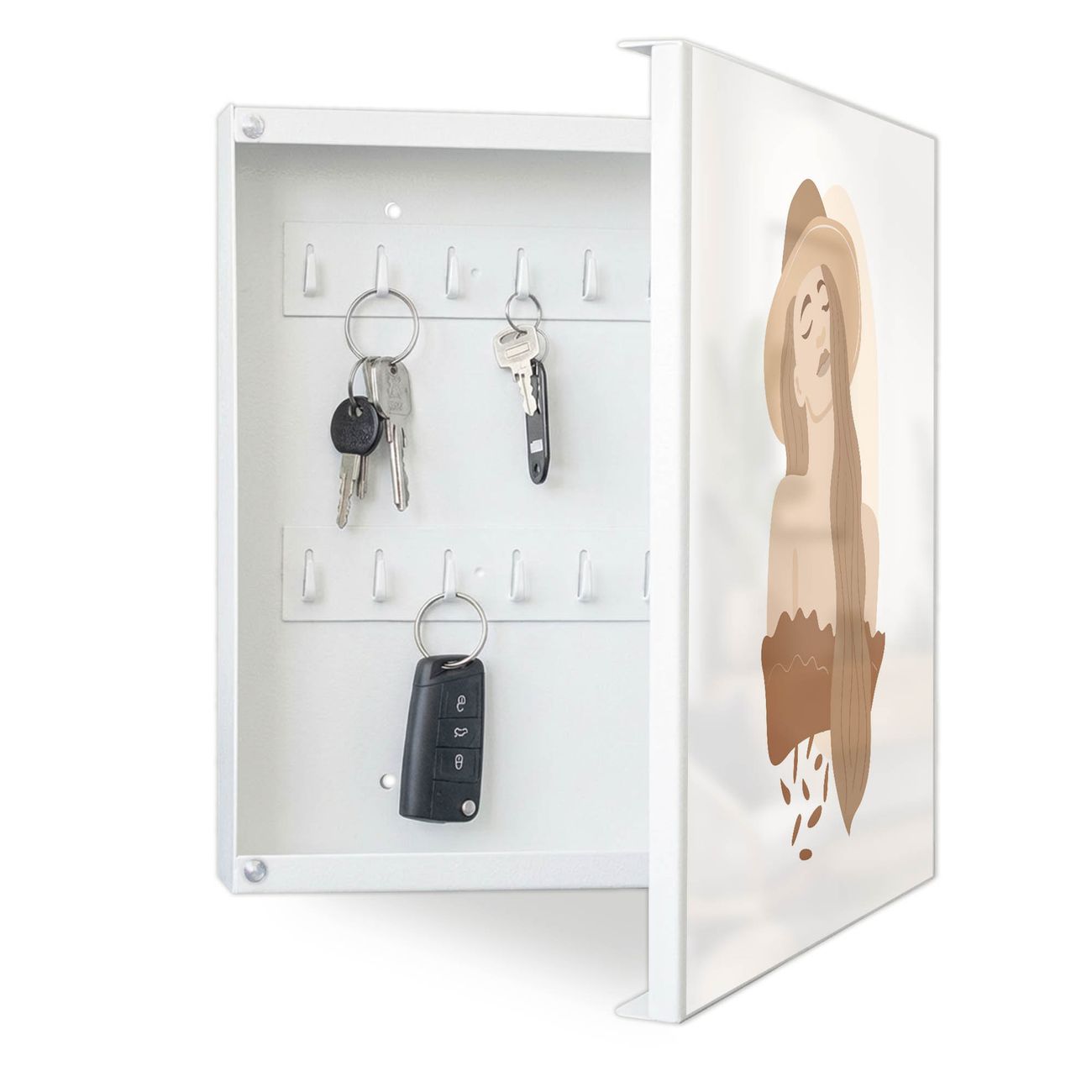 Bringe Ordnung und Eleganz in deinen Eingangsbereich mit dem banjado Schlüsselkasten Motiv Motiv Boho Frau. Die moderne Schlüsselbox kombiniert funktionales Design mit hochwertiger Verarbeitung und wird so zu einem echten Hingucker in Flur, Büro oder Ferienwohnung. ✅ Stilvolle Schlüsselaufbewahrung mit Motiv Motiv Boho Frau Der Design-Schlüsselkasten Motiv Motiv Boho Frau bietet Platz für bis zu 32 Schlüssel, die auf 4 stabilen Reihen mit je 8 Haken übersichtlich verstaut werden. Mit seinen kompakten Maßen von 30 x 30 x 5 cm passt die Schlüsselbox perfekt auch in kleinere Räume. Der weiß lackierte Stahlkorpus mit rechts angeschlagenem Türscharnier harmoniert mit gedruckten Folie auf der Front und fügt sich nahtlos in jedes Wohnambiente ein. Ob als Schlüsselorganizer für Zuhause oder als praktische Lösung für Büros, Praxen und Gewerbe, der banjado Schlüsselkasten sorgt für Ordnung und Übersicht. Dank der magnetischen, mit Kreidestiften beschreibbaren Folie auf der Front kannst du Notizen anheften oder Termine direkt auf der Oberfläche festhalten. Die Schlüsselbox Motiv Motiv Boho Frau zur Wandmontage wird inklusive Befestigungsmaterial geliefert und ist schnell angebracht. So hast du deine Schlüssel jederzeit griffbereit und zugleich stilvoll verstaut. Mit diesem banjado Schlüsselkasten Motiv Motiv Boho Frau kombinierst du praktische Aufbewahrung mit stilvollem Wohndesign. Ob privat oder geschäftlich, die Schlüsselbox sorgt für mehr Ordnung, Übersicht und ein wohnliches Ambiente.Vorteile im Überblick