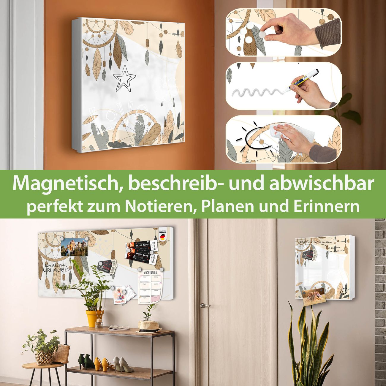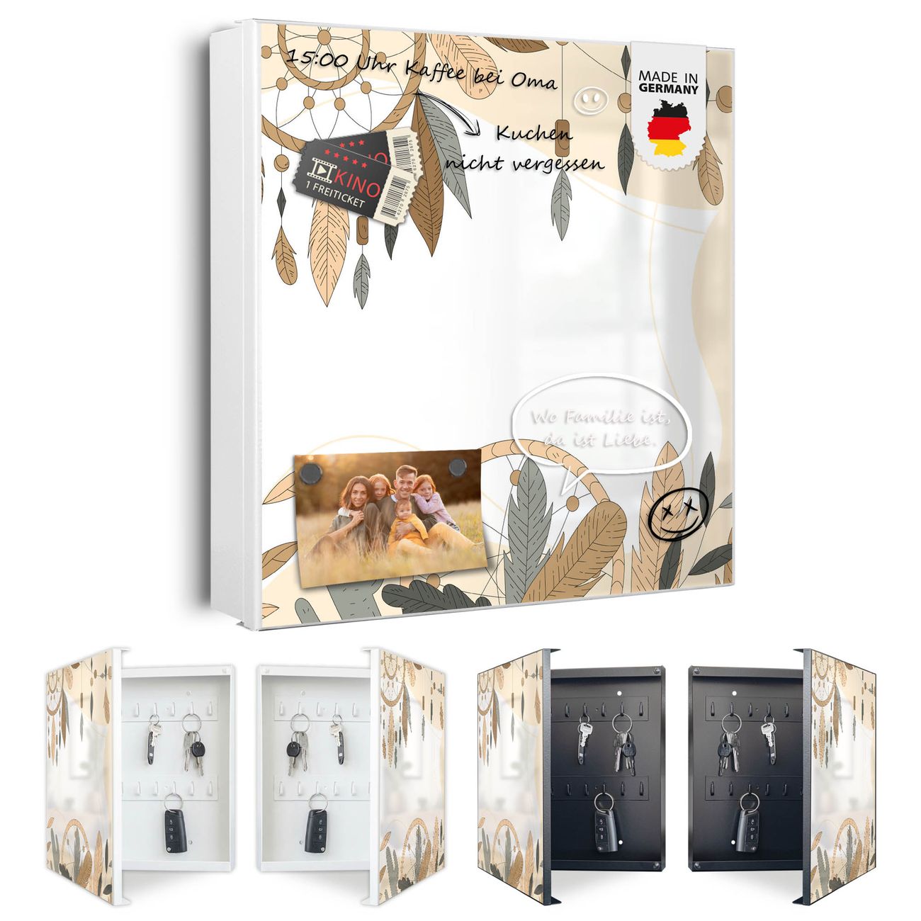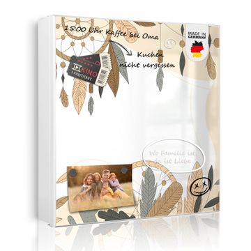Bringe Ordnung und Eleganz in deinen Eingangsbereich mit dem banjado Schlüsselkasten Motiv Motiv Boho Traumfänger. Die moderne Schlüsselbox kombiniert funktionales Design mit hochwertiger Verarbeitung und wird so zu einem echten Hingucker in Flur, Büro oder Ferienwohnung. ✅ Stilvolle Schlüsselaufbewahrung mit Motiv Motiv Boho Traumfänger Der Design-Schlüsselkasten Motiv Motiv Boho Traumfänger bietet Platz für bis zu 32 Schlüssel, die auf 4 stabilen Reihen mit je 8 Haken übersichtlich verstaut werden. Mit seinen kompakten Maßen von 30 x 30 x 5 cm passt die Schlüsselbox perfekt auch in kleinere Räume. Der weiß lackierte Stahlkorpus mit links angeschlagenem Türscharnier harmoniert mit gedruckten Folie auf der Front und fügt sich nahtlos in jedes Wohnambiente ein. Ob als Schlüsselorganizer für Zuhause oder als praktische Lösung für Büros, Praxen und Gewerbe, der banjado Schlüsselkasten sorgt für Ordnung und Übersicht. Dank der magnetischen, mit Kreidestiften beschreibbaren Folie auf der Front kannst du Notizen anheften oder Termine direkt auf der Oberfläche festhalten. Die Schlüsselbox Motiv Motiv Boho Traumfänger zur Wandmontage wird inklusive Befestigungsmaterial geliefert und ist schnell angebracht. So hast du deine Schlüssel jederzeit griffbereit und zugleich stilvoll verstaut. Mit diesem banjado Schlüsselkasten Motiv Motiv Boho Traumfänger kombinierst du praktische Aufbewahrung mit stilvollem Wohndesign. Ob privat oder geschäftlich, die Schlüsselbox sorgt für mehr Ordnung, Übersicht und ein wohnliches Ambiente.Vorteile im Überblick