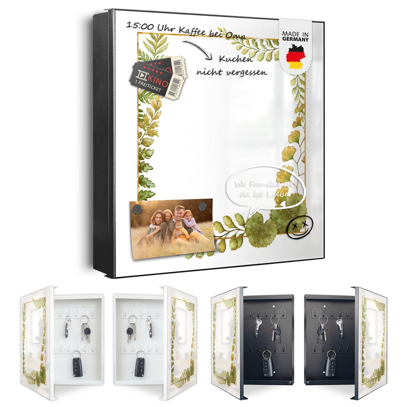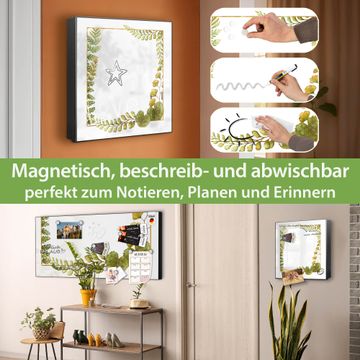 Bringe Ordnung und Eleganz in deinen Eingangsbereich mit dem banjado Schlüsselkasten Motiv Motiv Botanischer Rahmen 2. Die moderne Schlüsselbox kombiniert funktionales Design mit hochwertiger Verarbeitung und wird so zu einem echten Hingucker in Flur, Büro oder Ferienwohnung. ✅ Stilvolle Schlüsselaufbewahrung mit Motiv Motiv Botanischer Rahmen 2 Der Design-Schlüsselkasten Motiv Motiv Botanischer Rahmen 2 bietet Platz für bis zu 32 Schlüssel, die auf 4 stabilen Reihen mit je 8 Haken übersichtlich verstaut werden. Mit seinen kompakten Maßen von 30 x 30 x 5 cm passt die Schlüsselbox perfekt auch in kleinere Räume. Der schwarz lackierte Stahlkorpus mit links angeschlagenem Türscharnier harmoniert mit gedruckten Folie auf der Front und fügt sich nahtlos in jedes Wohnambiente ein. Ob als Schlüsselorganizer für Zuhause oder als praktische Lösung für Büros, Praxen und Gewerbe, der banjado Schlüsselkasten sorgt für Ordnung und Übersicht. Dank der magnetischen, mit Kreidestiften beschreibbaren Folie auf der Front kannst du Notizen anheften oder Termine direkt auf der Oberfläche festhalten. Die Schlüsselbox Motiv Motiv Botanischer Rahmen 2 zur Wandmontage wird inklusive Befestigungsmaterial geliefert und ist schnell angebracht. So hast du deine Schlüssel jederzeit griffbereit und zugleich stilvoll verstaut. Mit diesem banjado Schlüsselkasten Motiv Motiv Botanischer Rahmen 2 kombinierst du praktische Aufbewahrung mit stilvollem Wohndesign. Ob privat oder geschäftlich, die Schlüsselbox sorgt für mehr Ordnung, Übersicht und ein wohnliches Ambiente.Vorteile im Überblick