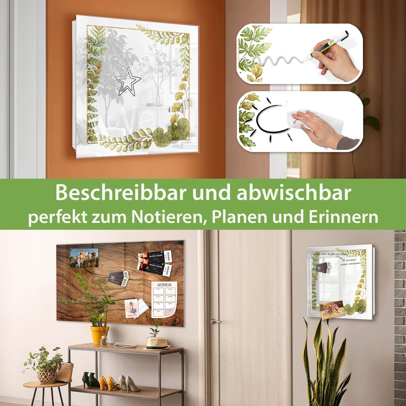 Bringe Ordnung und Eleganz in deinen Eingangsbereich mit dem banjado Schlüsselkasten Motiv Motiv Botanischer Rahmen 2. Die moderne Schlüsselbox kombiniert funktionales Design mit hochwertiger Verarbeitung und wird so zu einem echten Hingucker in Flur, Büro oder Ferienwohnung. ✅ Stilvolle Schlüsselaufbewahrung mit Glasfront im Motiv Motiv Botanischer Rahmen 2 Der Design-Schlüsselkasten Motiv Motiv Botanischer Rahmen 2 bietet Platz für bis zu 50 Schlüssel, die auf 5 stabilen Reihen mit je 10 Haken übersichtlich verstaut werden. Mit seinen kompakten Maßen von 30 x 30 x 5 cm passt die Schlüsselbox perfekt auch in kleinere Räume. Der weiß lackierte Stahlkorpus mit rechts angeschlagenem Türscharnier harmoniert mit der Glasfront und fügt sich nahtlos in jedes Wohnambiente ein. Ob als Schlüsselorganizer für Zuhause oder als praktische Lösung für Büros, Praxen und Gewerbe, der banjado Schlüsselkasten sorgt für Ordnung und Übersicht. Dank der magnetischen, mit Kreidestiften beschreibbaren Glasfront kannst du Notizen anheften oder Termine direkt auf der Oberfläche festhalten. Die Schlüsselbox Motiv Motiv Botanischer Rahmen 2 zur Wandmontage wird inklusive Befestigungsmaterial geliefert und ist schnell angebracht. So hast du deine Schlüssel jederzeit griffbereit und zugleich stilvoll verstaut. Mit diesem banjado Schlüsselkasten Motiv Motiv Botanischer Rahmen 2 kombinierst du praktische Aufbewahrung mit stilvollem Wohndesign. Ob privat oder geschäftlich, die Schlüsselbox sorgt für mehr Ordnung, Übersicht und ein wohnliches Ambiente.Vorteile im Überblick