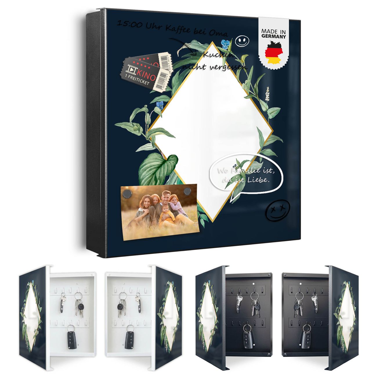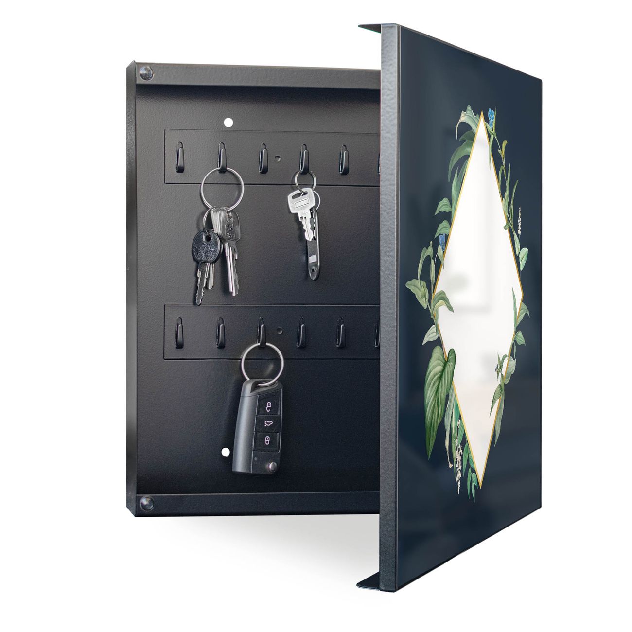 Bringe Ordnung und Eleganz in deinen Eingangsbereich mit dem banjado Schlüsselkasten Motiv Motiv Botanischer Rahmen. Die moderne Schlüsselbox kombiniert funktionales Design mit hochwertiger Verarbeitung und wird so zu einem echten Hingucker in Flur, Büro oder Ferienwohnung. ✅ Stilvolle Schlüsselaufbewahrung mit Motiv Motiv Botanischer Rahmen Der Design-Schlüsselkasten Motiv Motiv Botanischer Rahmen bietet Platz für bis zu 32 Schlüssel, die auf 4 stabilen Reihen mit je 8 Haken übersichtlich verstaut werden. Mit seinen kompakten Maßen von 30 x 30 x 5 cm passt die Schlüsselbox perfekt auch in kleinere Räume. Der schwarz lackierte Stahlkorpus mit rechts angeschlagenem Türscharnier harmoniert mit gedruckten Folie auf der Front und fügt sich nahtlos in jedes Wohnambiente ein. Ob als Schlüsselorganizer für Zuhause oder als praktische Lösung für Büros, Praxen und Gewerbe, der banjado Schlüsselkasten sorgt für Ordnung und Übersicht. Dank der magnetischen, mit Kreidestiften beschreibbaren Folie auf der Front kannst du Notizen anheften oder Termine direkt auf der Oberfläche festhalten. Die Schlüsselbox Motiv Motiv Botanischer Rahmen zur Wandmontage wird inklusive Befestigungsmaterial geliefert und ist schnell angebracht. So hast du deine Schlüssel jederzeit griffbereit und zugleich stilvoll verstaut. Mit diesem banjado Schlüsselkasten Motiv Motiv Botanischer Rahmen kombinierst du praktische Aufbewahrung mit stilvollem Wohndesign. Ob privat oder geschäftlich, die Schlüsselbox sorgt für mehr Ordnung, Übersicht und ein wohnliches Ambiente.Vorteile im Überblick