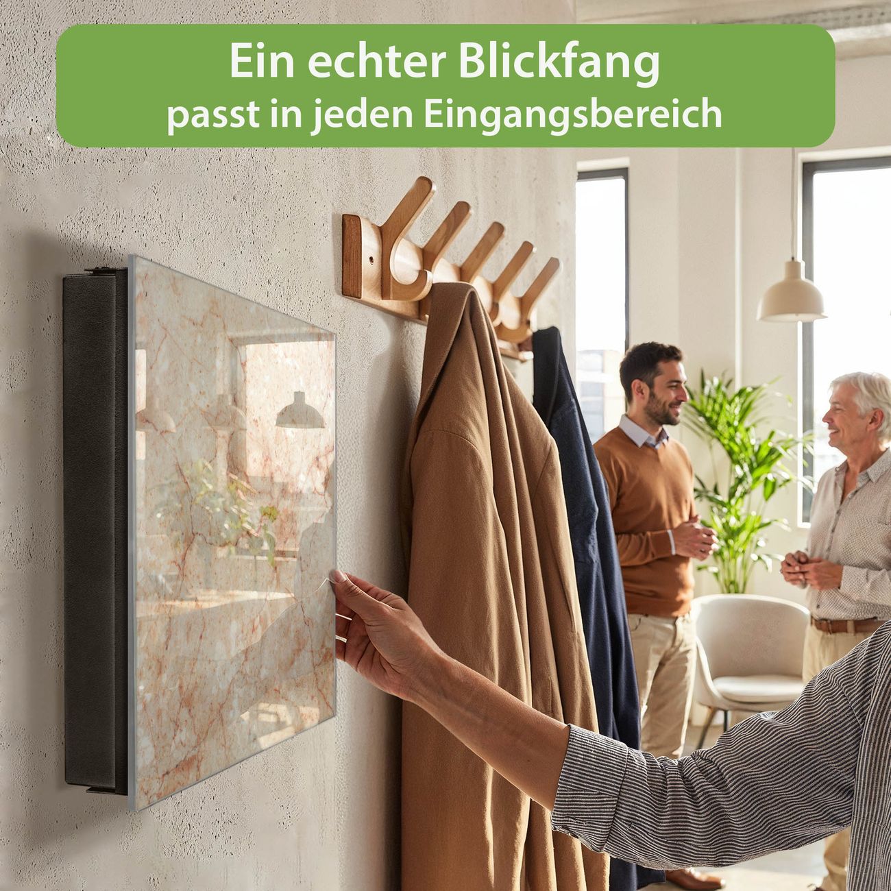Bringe Ordnung und Eleganz in deinen Eingangsbereich mit dem banjado Schlüsselkasten Motiv Brauner Marmor Struktur. Die moderne Schlüsselbox kombiniert funktionales Design mit hochwertiger Verarbeitung und wird so zu einem echten Hingucker in Flur, Büro oder Ferienwohnung. ✅ Stilvolle Schlüsselaufbewahrung mit Glasfront im Motiv Motiv Brauner Marmor Struktur Der Design-Schlüsselkasten Motiv Brauner Marmor Struktur bietet Platz für bis zu 50 Schlüssel, die auf 5 stabilen Reihen mit je 10 Haken übersichtlich verstaut werden. Mit seinen kompakten Maßen von 30 x 30 x 5 cm passt die Schlüsselbox perfekt auch in kleinere Räume. Der schwarz lackierte Stahlkorpus mit rechts angeschlagenem Türscharnier harmoniert mit der Glasfront und fügt sich nahtlos in jedes Wohnambiente ein. Ob als Schlüsselorganizer für Zuhause oder als praktische Lösung für Büros, Praxen und Gewerbe, der banjado Schlüsselkasten sorgt für Ordnung und Übersicht. Dank der magnetischen, mit Kreidestiften beschreibbaren Glasfront kannst du Notizen anheften oder Termine direkt auf der Oberfläche festhalten. Die Schlüsselbox Motiv Brauner Marmor Struktur zur Wandmontage wird inklusive Befestigungsmaterial geliefert und ist schnell angebracht. So hast du deine Schlüssel jederzeit griffbereit und zugleich stilvoll verstaut. Mit diesem banjado Schlüsselkasten Motiv Brauner Marmor Struktur kombinierst du praktische Aufbewahrung mit stilvollem Wohndesign. Ob privat oder geschäftlich, die Schlüsselbox sorgt für mehr Ordnung, Übersicht und ein wohnliches Ambiente.Vorteile im Überblick