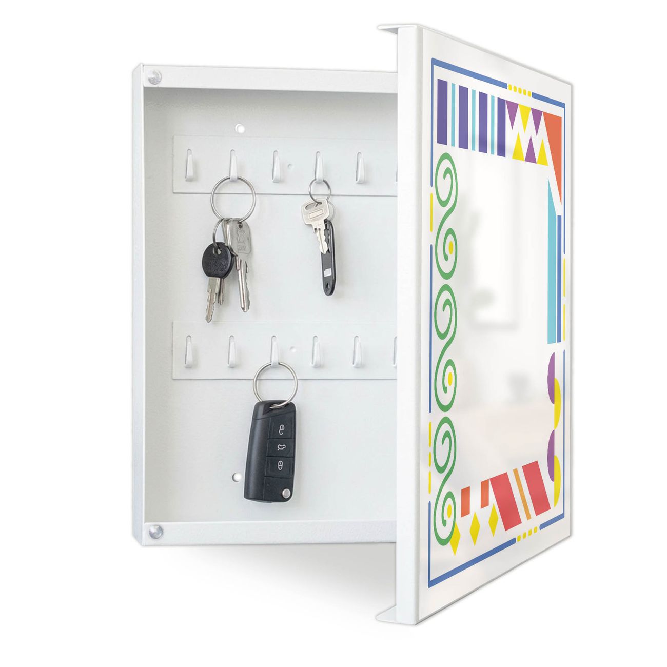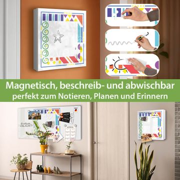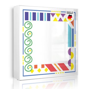 Bringe Ordnung und Eleganz in deinen Eingangsbereich mit dem banjado Schlüsselkasten Motiv Motiv Bunte Ecken. Die moderne Schlüsselbox kombiniert funktionales Design mit hochwertiger Verarbeitung und wird so zu einem echten Hingucker in Flur, Büro oder Ferienwohnung. ✅ Stilvolle Schlüsselaufbewahrung mit Motiv Motiv Bunte Ecken Der Design-Schlüsselkasten Motiv Motiv Bunte Ecken bietet Platz für bis zu 32 Schlüssel, die auf 4 stabilen Reihen mit je 8 Haken übersichtlich verstaut werden. Mit seinen kompakten Maßen von 30 x 30 x 5 cm passt die Schlüsselbox perfekt auch in kleinere Räume. Der weiß lackierte Stahlkorpus mit rechts angeschlagenem Türscharnier harmoniert mit gedruckten Folie auf der Front und fügt sich nahtlos in jedes Wohnambiente ein. Ob als Schlüsselorganizer für Zuhause oder als praktische Lösung für Büros, Praxen und Gewerbe, der banjado Schlüsselkasten sorgt für Ordnung und Übersicht. Dank der magnetischen, mit Kreidestiften beschreibbaren Folie auf der Front kannst du Notizen anheften oder Termine direkt auf der Oberfläche festhalten. Die Schlüsselbox Motiv Motiv Bunte Ecken zur Wandmontage wird inklusive Befestigungsmaterial geliefert und ist schnell angebracht. So hast du deine Schlüssel jederzeit griffbereit und zugleich stilvoll verstaut. Mit diesem banjado Schlüsselkasten Motiv Motiv Bunte Ecken kombinierst du praktische Aufbewahrung mit stilvollem Wohndesign. Ob privat oder geschäftlich, die Schlüsselbox sorgt für mehr Ordnung, Übersicht und ein wohnliches Ambiente.Vorteile im Überblick