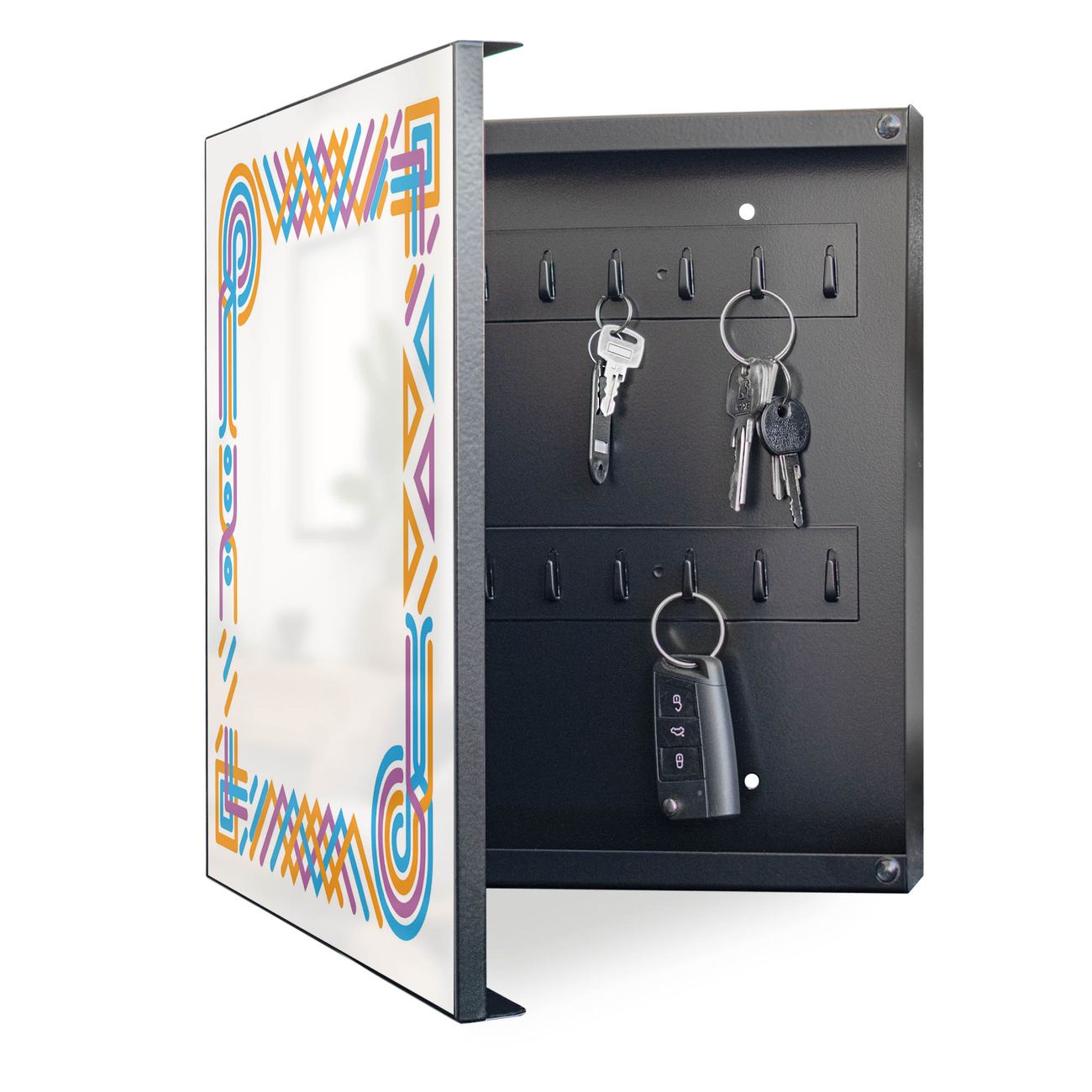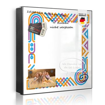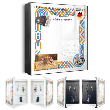 Bringe Ordnung und Eleganz in deinen Eingangsbereich mit dem banjado Schlüsselkasten Motiv Motiv Bunte Eckverzierung. Die moderne Schlüsselbox kombiniert funktionales Design mit hochwertiger Verarbeitung und wird so zu einem echten Hingucker in Flur, Büro oder Ferienwohnung. ✅ Stilvolle Schlüsselaufbewahrung mit Motiv Motiv Bunte Eckverzierung Der Design-Schlüsselkasten Motiv Motiv Bunte Eckverzierung bietet Platz für bis zu 32 Schlüssel, die auf 4 stabilen Reihen mit je 8 Haken übersichtlich verstaut werden. Mit seinen kompakten Maßen von 30 x 30 x 5 cm passt die Schlüsselbox perfekt auch in kleinere Räume. Der schwarz lackierte Stahlkorpus mit links angeschlagenem Türscharnier harmoniert mit gedruckten Folie auf der Front und fügt sich nahtlos in jedes Wohnambiente ein. Ob als Schlüsselorganizer für Zuhause oder als praktische Lösung für Büros, Praxen und Gewerbe, der banjado Schlüsselkasten sorgt für Ordnung und Übersicht. Dank der magnetischen, mit Kreidestiften beschreibbaren Folie auf der Front kannst du Notizen anheften oder Termine direkt auf der Oberfläche festhalten. Die Schlüsselbox Motiv Motiv Bunte Eckverzierung zur Wandmontage wird inklusive Befestigungsmaterial geliefert und ist schnell angebracht. So hast du deine Schlüssel jederzeit griffbereit und zugleich stilvoll verstaut. Mit diesem banjado Schlüsselkasten Motiv Motiv Bunte Eckverzierung kombinierst du praktische Aufbewahrung mit stilvollem Wohndesign. Ob privat oder geschäftlich, die Schlüsselbox sorgt für mehr Ordnung, Übersicht und ein wohnliches Ambiente.Vorteile im Überblick