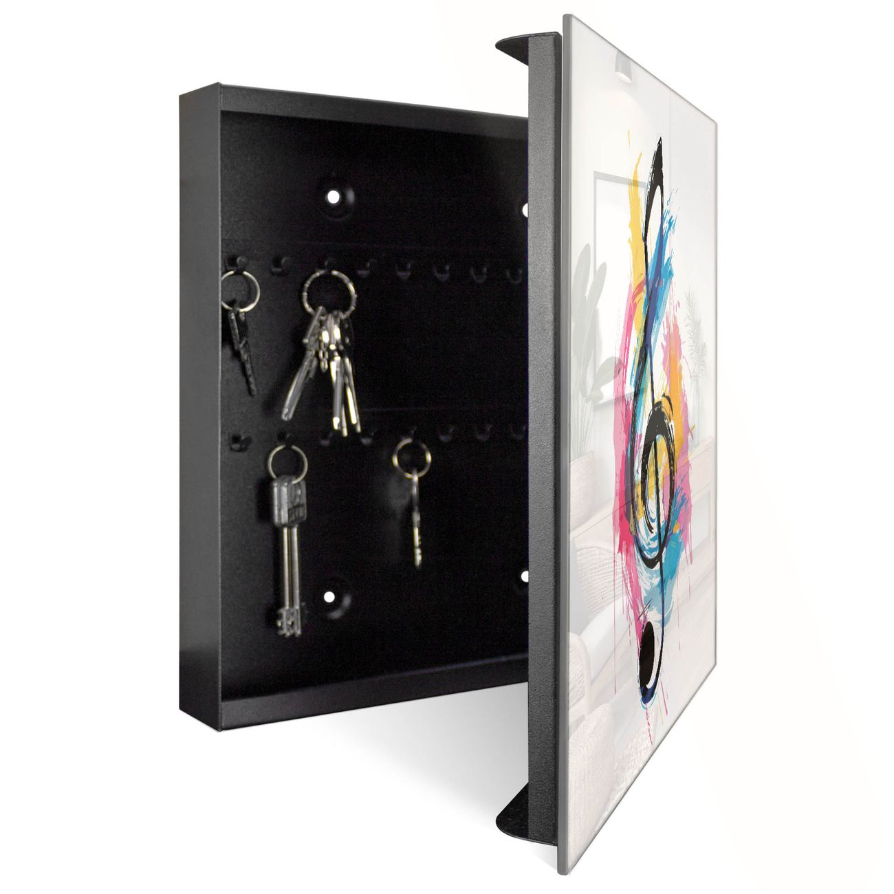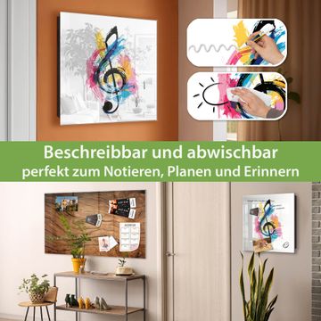 Bringe Ordnung und Eleganz in deinen Eingangsbereich mit dem banjado Schlüsselkasten Motiv Motiv Bunte Notenpalette. Die moderne Schlüsselbox kombiniert funktionales Design mit hochwertiger Verarbeitung und wird so zu einem echten Hingucker in Flur, Büro oder Ferienwohnung. ✅ Stilvolle Schlüsselaufbewahrung mit Glasfront im Motiv Motiv Bunte Notenpalette Der Design-Schlüsselkasten Motiv Motiv Bunte Notenpalette bietet Platz für bis zu 50 Schlüssel, die auf 5 stabilen Reihen mit je 10 Haken übersichtlich verstaut werden. Mit seinen kompakten Maßen von 30 x 30 x 5 cm passt die Schlüsselbox perfekt auch in kleinere Räume. Der schwarz lackierte Stahlkorpus mit rechts angeschlagenem Türscharnier harmoniert mit der Glasfront und fügt sich nahtlos in jedes Wohnambiente ein. Ob als Schlüsselorganizer für Zuhause oder als praktische Lösung für Büros, Praxen und Gewerbe, der banjado Schlüsselkasten sorgt für Ordnung und Übersicht. Dank der magnetischen, mit Kreidestiften beschreibbaren Glasfront kannst du Notizen anheften oder Termine direkt auf der Oberfläche festhalten. Die Schlüsselbox Motiv Motiv Bunte Notenpalette zur Wandmontage wird inklusive Befestigungsmaterial geliefert und ist schnell angebracht. So hast du deine Schlüssel jederzeit griffbereit und zugleich stilvoll verstaut. Mit diesem banjado Schlüsselkasten Motiv Motiv Bunte Notenpalette kombinierst du praktische Aufbewahrung mit stilvollem Wohndesign. Ob privat oder geschäftlich, die Schlüsselbox sorgt für mehr Ordnung, Übersicht und ein wohnliches Ambiente.Vorteile im Überblick