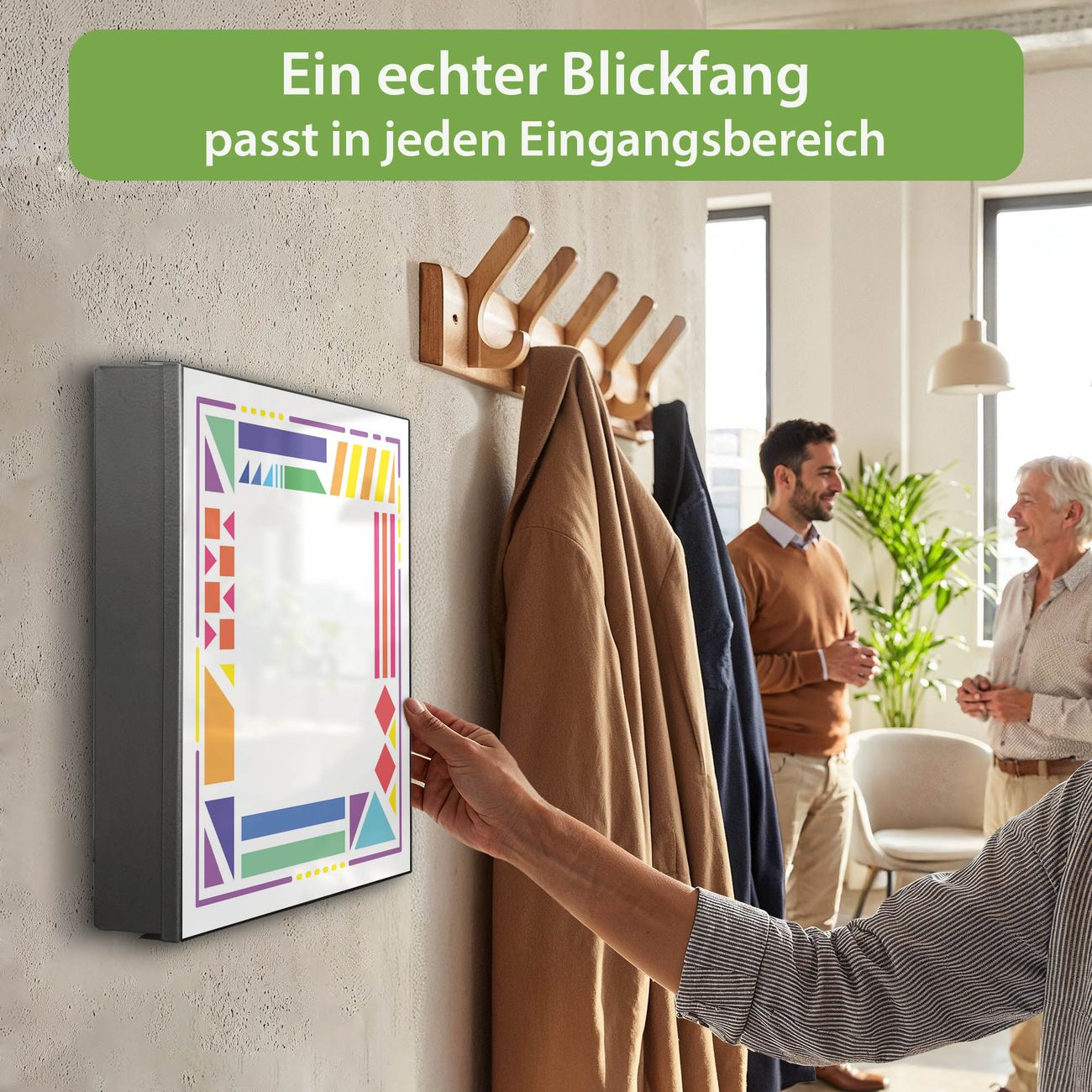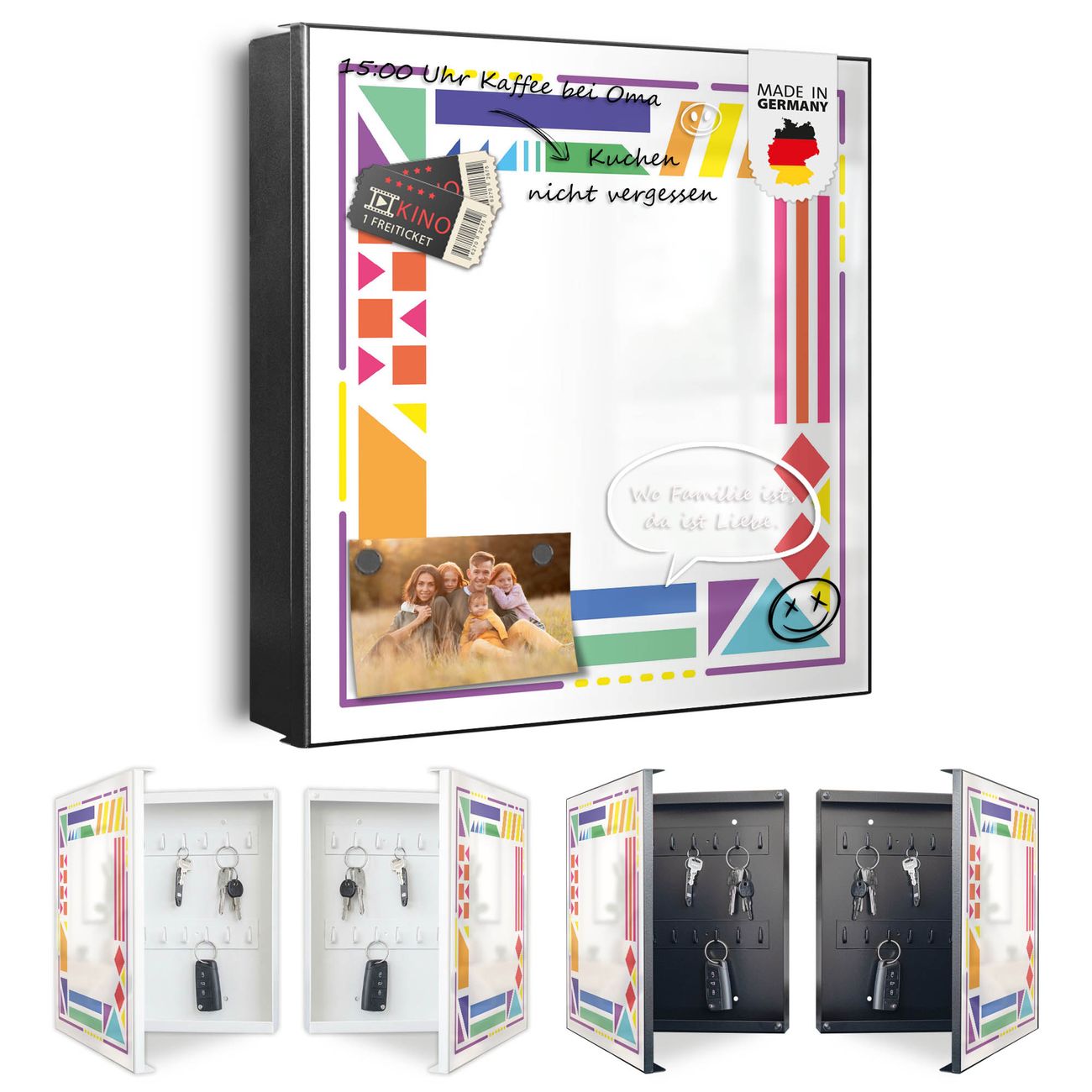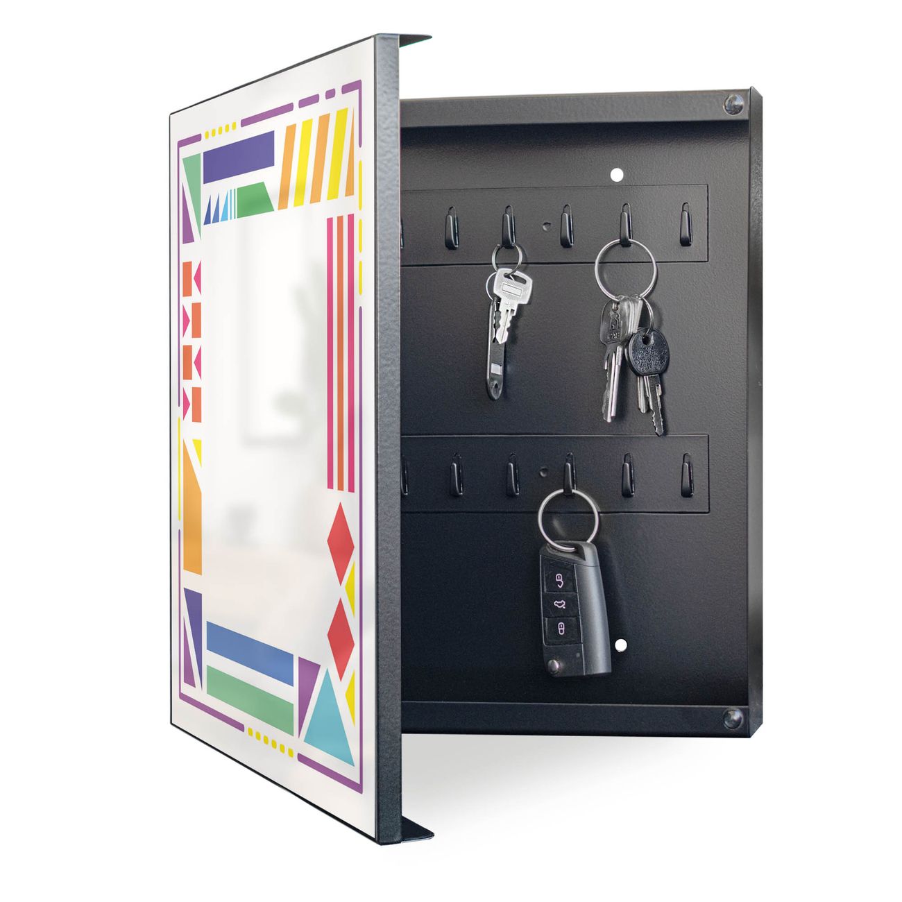 Bringe Ordnung und Eleganz in deinen Eingangsbereich mit dem banjado Schlüsselkasten Motiv Motiv Bunter Geometrischer Rahmen 2. Die moderne Schlüsselbox kombiniert funktionales Design mit hochwertiger Verarbeitung und wird so zu einem echten Hingucker in Flur, Büro oder Ferienwohnung. ✅ Stilvolle Schlüsselaufbewahrung mit Motiv Motiv Bunter Geometrischer Rahmen 2 Der Design-Schlüsselkasten Motiv Motiv Bunter Geometrischer Rahmen 2 bietet Platz für bis zu 32 Schlüssel, die auf 4 stabilen Reihen mit je 8 Haken übersichtlich verstaut werden. Mit seinen kompakten Maßen von 30 x 30 x 5 cm passt die Schlüsselbox perfekt auch in kleinere Räume. Der schwarz lackierte Stahlkorpus mit links angeschlagenem Türscharnier harmoniert mit gedruckten Folie auf der Front und fügt sich nahtlos in jedes Wohnambiente ein. Ob als Schlüsselorganizer für Zuhause oder als praktische Lösung für Büros, Praxen und Gewerbe, der banjado Schlüsselkasten sorgt für Ordnung und Übersicht. Dank der magnetischen, mit Kreidestiften beschreibbaren Folie auf der Front kannst du Notizen anheften oder Termine direkt auf der Oberfläche festhalten. Die Schlüsselbox Motiv Motiv Bunter Geometrischer Rahmen 2 zur Wandmontage wird inklusive Befestigungsmaterial geliefert und ist schnell angebracht. So hast du deine Schlüssel jederzeit griffbereit und zugleich stilvoll verstaut. Mit diesem banjado Schlüsselkasten Motiv Motiv Bunter Geometrischer Rahmen 2 kombinierst du praktische Aufbewahrung mit stilvollem Wohndesign. Ob privat oder geschäftlich, die Schlüsselbox sorgt für mehr Ordnung, Übersicht und ein wohnliches Ambiente.Vorteile im Überblick
