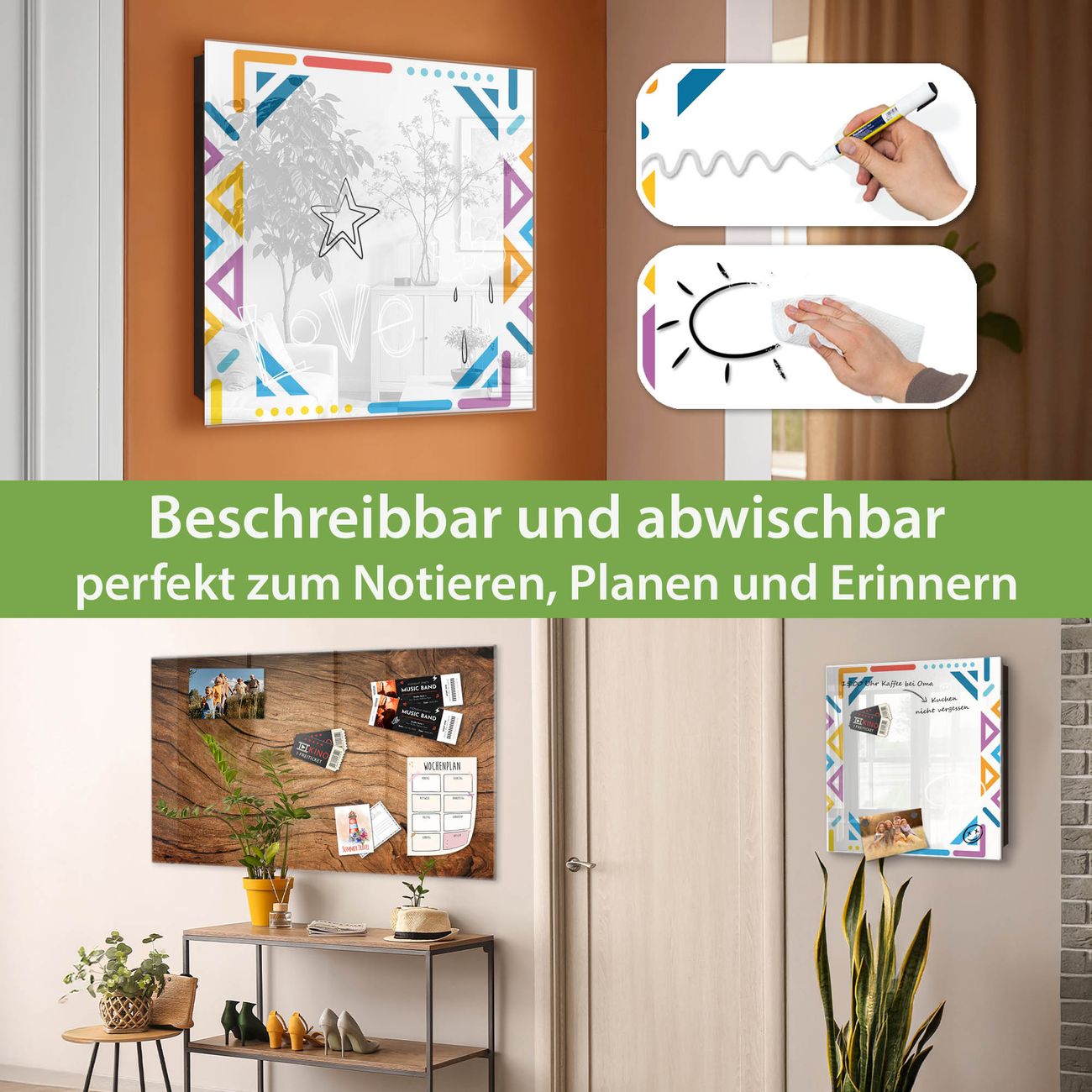 Bringe Ordnung und Eleganz in deinen Eingangsbereich mit dem banjado Schlüsselkasten Motiv Motiv Bunter Geometrischer Rahmen. Die moderne Schlüsselbox kombiniert funktionales Design mit hochwertiger Verarbeitung und wird so zu einem echten Hingucker in Flur, Büro oder Ferienwohnung. ✅ Stilvolle Schlüsselaufbewahrung mit Glasfront im Motiv Motiv Bunter Geometrischer Rahmen Der Design-Schlüsselkasten Motiv Motiv Bunter Geometrischer Rahmen bietet Platz für bis zu 50 Schlüssel, die auf 5 stabilen Reihen mit je 10 Haken übersichtlich verstaut werden. Mit seinen kompakten Maßen von 30 x 30 x 5 cm passt die Schlüsselbox perfekt auch in kleinere Räume. Der schwarz lackierte Stahlkorpus mit rechts angeschlagenem Türscharnier harmoniert mit der Glasfront und fügt sich nahtlos in jedes Wohnambiente ein. Ob als Schlüsselorganizer für Zuhause oder als praktische Lösung für Büros, Praxen und Gewerbe, der banjado Schlüsselkasten sorgt für Ordnung und Übersicht. Dank der magnetischen, mit Kreidestiften beschreibbaren Glasfront kannst du Notizen anheften oder Termine direkt auf der Oberfläche festhalten. Die Schlüsselbox Motiv Motiv Bunter Geometrischer Rahmen zur Wandmontage wird inklusive Befestigungsmaterial geliefert und ist schnell angebracht. So hast du deine Schlüssel jederzeit griffbereit und zugleich stilvoll verstaut. Mit diesem banjado Schlüsselkasten Motiv Motiv Bunter Geometrischer Rahmen kombinierst du praktische Aufbewahrung mit stilvollem Wohndesign. Ob privat oder geschäftlich, die Schlüsselbox sorgt für mehr Ordnung, Übersicht und ein wohnliches Ambiente.Vorteile im Überblick