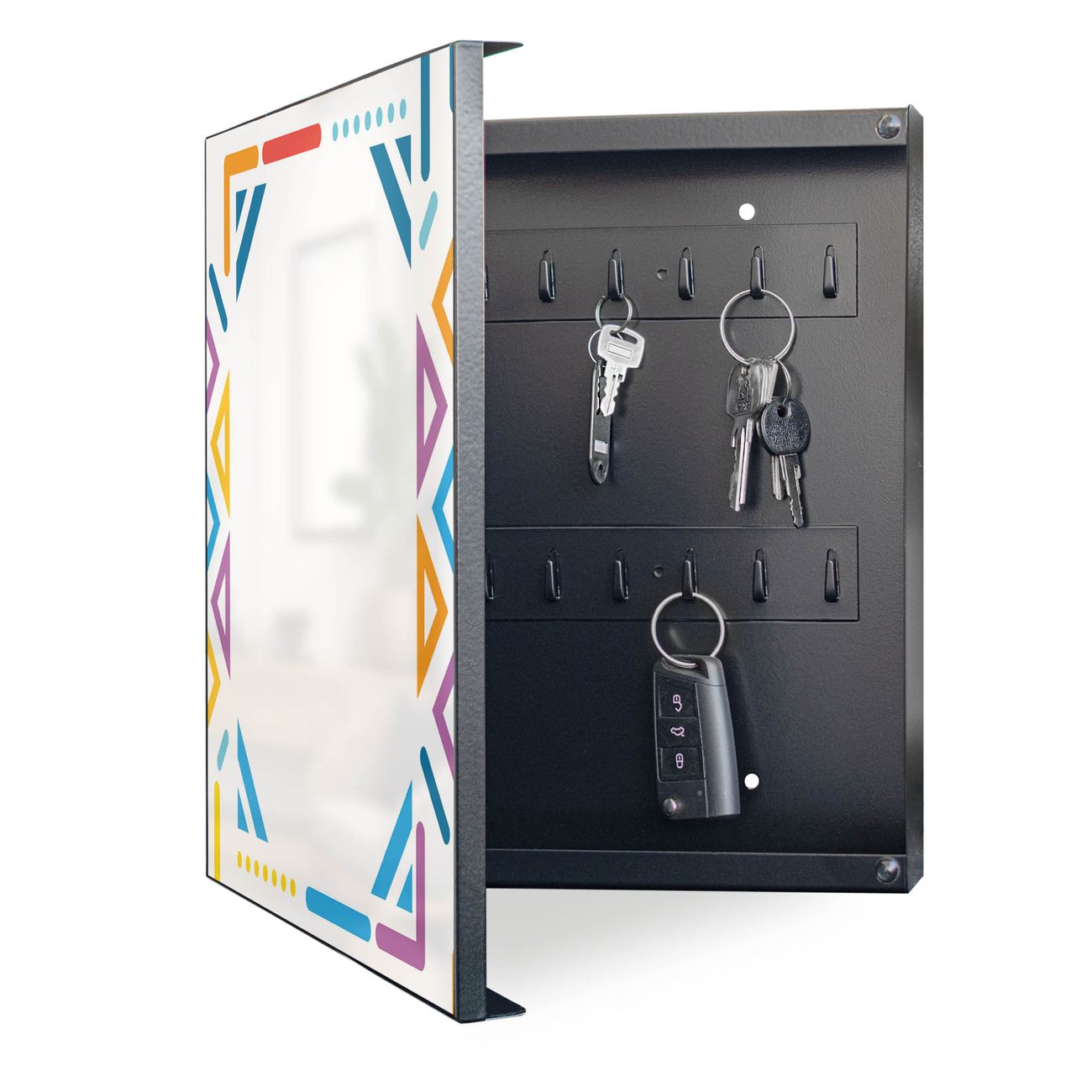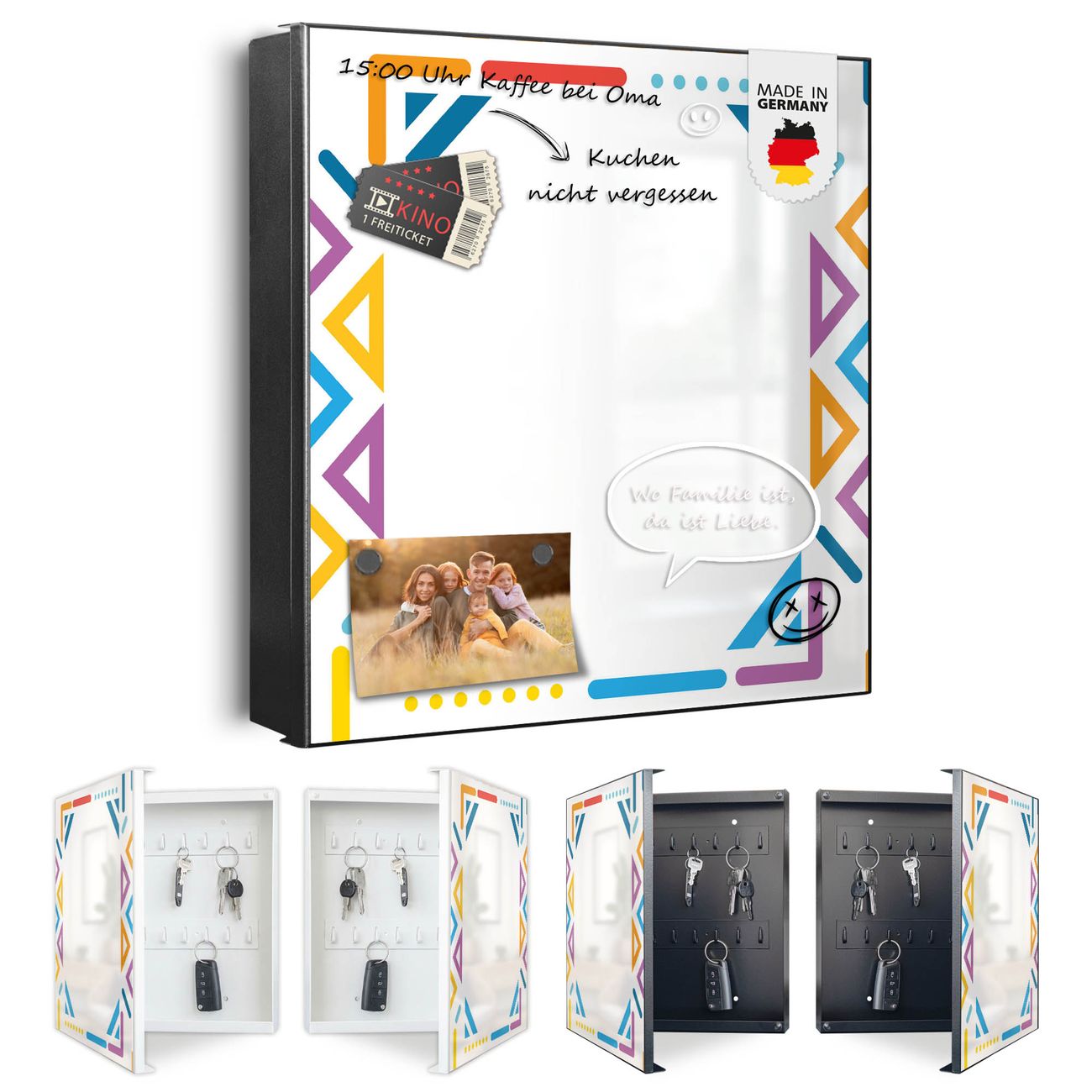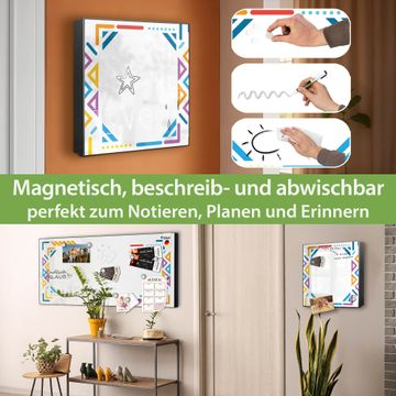 Bringe Ordnung und Eleganz in deinen Eingangsbereich mit dem banjado Schlüsselkasten Motiv Motiv Bunter Geometrischer Rahmen. Die moderne Schlüsselbox kombiniert funktionales Design mit hochwertiger Verarbeitung und wird so zu einem echten Hingucker in Flur, Büro oder Ferienwohnung. ✅ Stilvolle Schlüsselaufbewahrung mit Motiv Motiv Bunter Geometrischer Rahmen Der Design-Schlüsselkasten Motiv Motiv Bunter Geometrischer Rahmen bietet Platz für bis zu 32 Schlüssel, die auf 4 stabilen Reihen mit je 8 Haken übersichtlich verstaut werden. Mit seinen kompakten Maßen von 30 x 30 x 5 cm passt die Schlüsselbox perfekt auch in kleinere Räume. Der schwarz lackierte Stahlkorpus mit links angeschlagenem Türscharnier harmoniert mit gedruckten Folie auf der Front und fügt sich nahtlos in jedes Wohnambiente ein. Ob als Schlüsselorganizer für Zuhause oder als praktische Lösung für Büros, Praxen und Gewerbe, der banjado Schlüsselkasten sorgt für Ordnung und Übersicht. Dank der magnetischen, mit Kreidestiften beschreibbaren Folie auf der Front kannst du Notizen anheften oder Termine direkt auf der Oberfläche festhalten. Die Schlüsselbox Motiv Motiv Bunter Geometrischer Rahmen zur Wandmontage wird inklusive Befestigungsmaterial geliefert und ist schnell angebracht. So hast du deine Schlüssel jederzeit griffbereit und zugleich stilvoll verstaut. Mit diesem banjado Schlüsselkasten Motiv Motiv Bunter Geometrischer Rahmen kombinierst du praktische Aufbewahrung mit stilvollem Wohndesign. Ob privat oder geschäftlich, die Schlüsselbox sorgt für mehr Ordnung, Übersicht und ein wohnliches Ambiente.Vorteile im Überblick