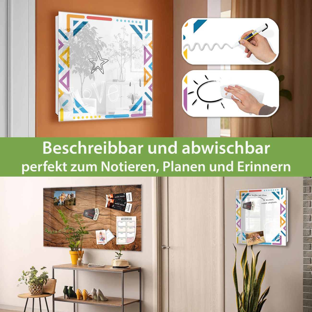 Bringe Ordnung und Eleganz in deinen Eingangsbereich mit dem banjado Schlüsselkasten Motiv Motiv Bunter Geometrischer Rahmen. Die moderne Schlüsselbox kombiniert funktionales Design mit hochwertiger Verarbeitung und wird so zu einem echten Hingucker in Flur, Büro oder Ferienwohnung. ✅ Stilvolle Schlüsselaufbewahrung mit Glasfront im Motiv Motiv Bunter Geometrischer Rahmen Der Design-Schlüsselkasten Motiv Motiv Bunter Geometrischer Rahmen bietet Platz für bis zu 50 Schlüssel, die auf 5 stabilen Reihen mit je 10 Haken übersichtlich verstaut werden. Mit seinen kompakten Maßen von 30 x 30 x 5 cm passt die Schlüsselbox perfekt auch in kleinere Räume. Der weiß lackierte Stahlkorpus mit rechts angeschlagenem Türscharnier harmoniert mit der Glasfront und fügt sich nahtlos in jedes Wohnambiente ein. Ob als Schlüsselorganizer für Zuhause oder als praktische Lösung für Büros, Praxen und Gewerbe, der banjado Schlüsselkasten sorgt für Ordnung und Übersicht. Dank der magnetischen, mit Kreidestiften beschreibbaren Glasfront kannst du Notizen anheften oder Termine direkt auf der Oberfläche festhalten. Die Schlüsselbox Motiv Motiv Bunter Geometrischer Rahmen zur Wandmontage wird inklusive Befestigungsmaterial geliefert und ist schnell angebracht. So hast du deine Schlüssel jederzeit griffbereit und zugleich stilvoll verstaut. Mit diesem banjado Schlüsselkasten Motiv Motiv Bunter Geometrischer Rahmen kombinierst du praktische Aufbewahrung mit stilvollem Wohndesign. Ob privat oder geschäftlich, die Schlüsselbox sorgt für mehr Ordnung, Übersicht und ein wohnliches Ambiente.Vorteile im Überblick