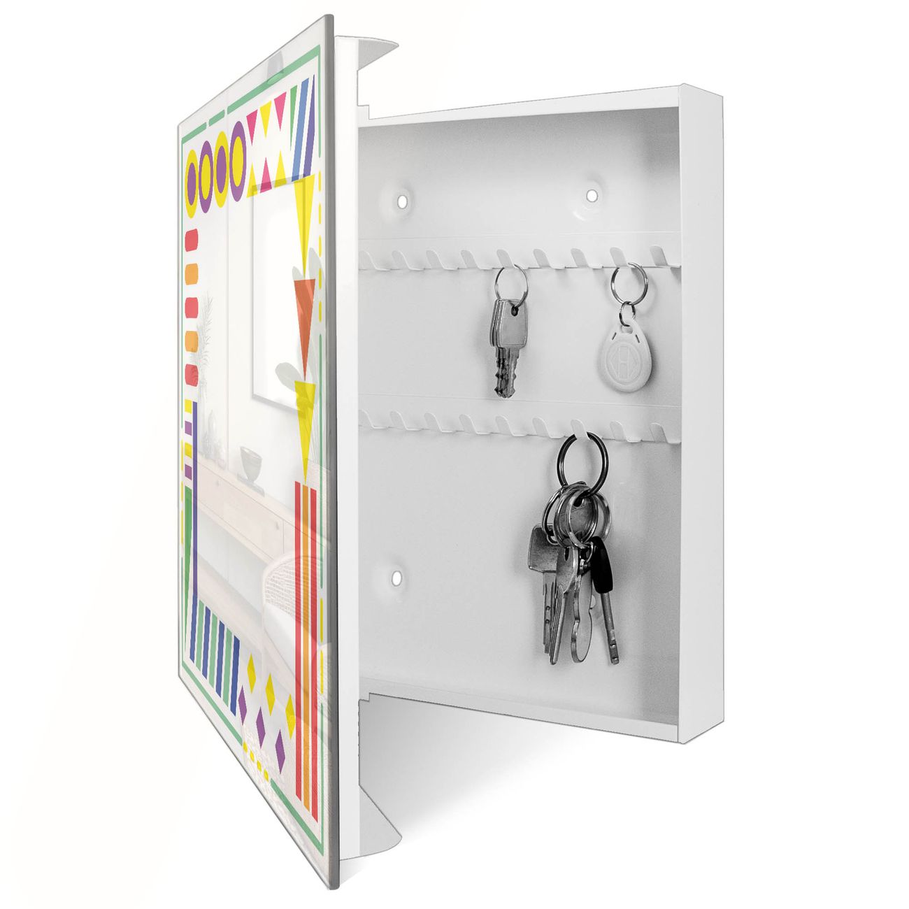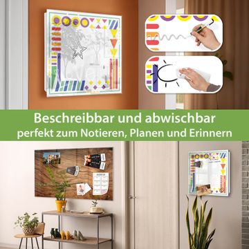 Bringe Ordnung und Eleganz in deinen Eingangsbereich mit dem banjado Schlüsselkasten Motiv Motiv Bunter Rahmen. Die moderne Schlüsselbox kombiniert funktionales Design mit hochwertiger Verarbeitung und wird so zu einem echten Hingucker in Flur, Büro oder Ferienwohnung. ✅ Stilvolle Schlüsselaufbewahrung mit Glasfront im Motiv Motiv Bunter Rahmen Der Design-Schlüsselkasten Motiv Motiv Bunter Rahmen bietet Platz für bis zu 50 Schlüssel, die auf 5 stabilen Reihen mit je 10 Haken übersichtlich verstaut werden. Mit seinen kompakten Maßen von 30 x 30 x 5 cm passt die Schlüsselbox perfekt auch in kleinere Räume. Der weiß lackierte Stahlkorpus mit rechts angeschlagenem Türscharnier harmoniert mit der Glasfront und fügt sich nahtlos in jedes Wohnambiente ein. Ob als Schlüsselorganizer für Zuhause oder als praktische Lösung für Büros, Praxen und Gewerbe, der banjado Schlüsselkasten sorgt für Ordnung und Übersicht. Dank der magnetischen, mit Kreidestiften beschreibbaren Glasfront kannst du Notizen anheften oder Termine direkt auf der Oberfläche festhalten. Die Schlüsselbox Motiv Motiv Bunter Rahmen zur Wandmontage wird inklusive Befestigungsmaterial geliefert und ist schnell angebracht. So hast du deine Schlüssel jederzeit griffbereit und zugleich stilvoll verstaut. Mit diesem banjado Schlüsselkasten Motiv Motiv Bunter Rahmen kombinierst du praktische Aufbewahrung mit stilvollem Wohndesign. Ob privat oder geschäftlich, die Schlüsselbox sorgt für mehr Ordnung, Übersicht und ein wohnliches Ambiente.Vorteile im Überblick