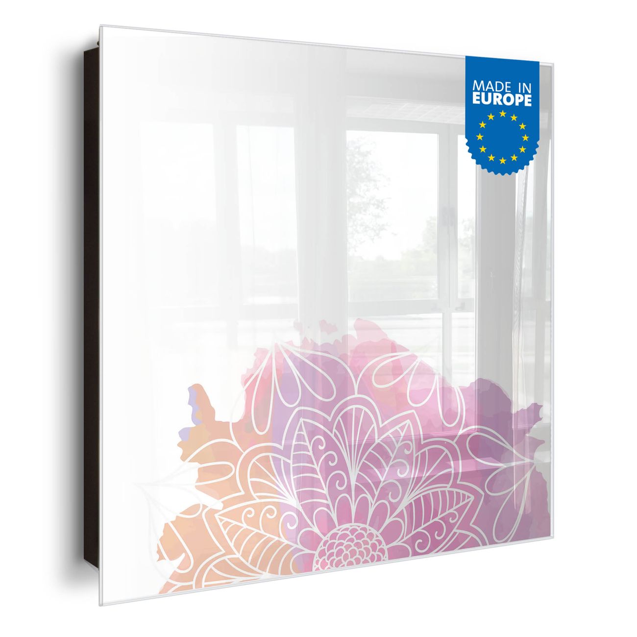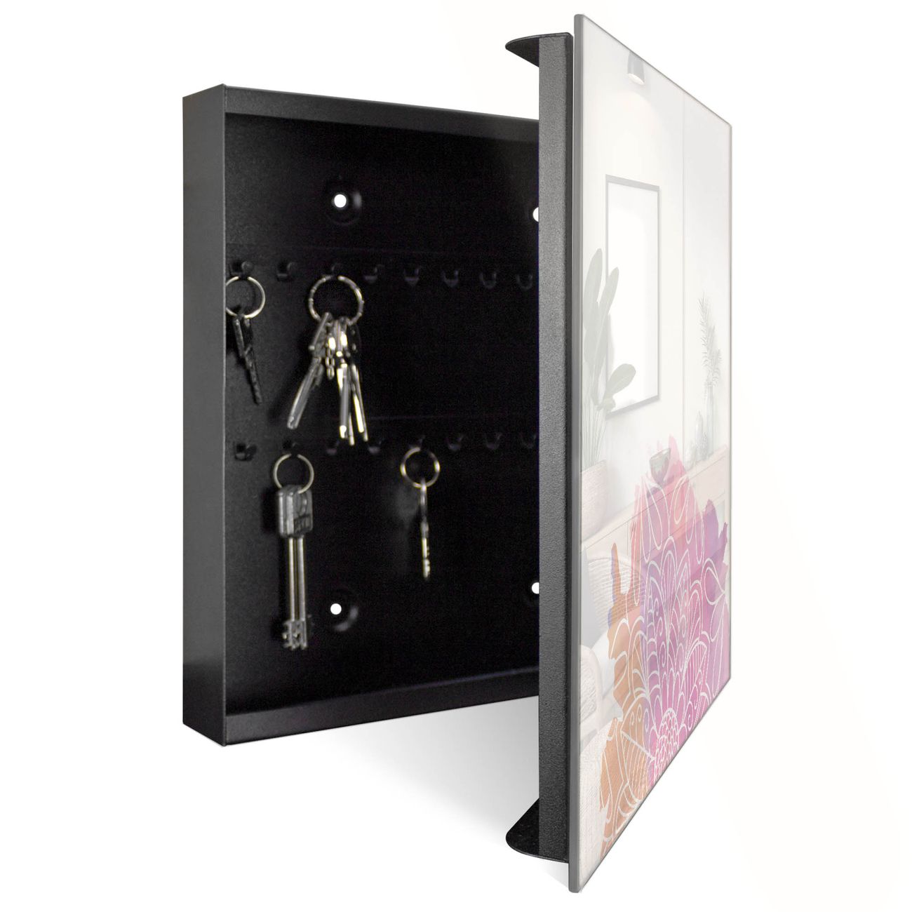 Bringe Ordnung und Eleganz in deinen Eingangsbereich mit dem banjado Schlüsselkasten Motiv Motiv Buntes Mandala. Die moderne Schlüsselbox kombiniert funktionales Design mit hochwertiger Verarbeitung und wird so zu einem echten Hingucker in Flur, Büro oder Ferienwohnung. ✅ Stilvolle Schlüsselaufbewahrung mit Glasfront im Motiv Motiv Buntes Mandala Der Design-Schlüsselkasten Motiv Motiv Buntes Mandala bietet Platz für bis zu 50 Schlüssel, die auf 5 stabilen Reihen mit je 10 Haken übersichtlich verstaut werden. Mit seinen kompakten Maßen von 30 x 30 x 5 cm passt die Schlüsselbox perfekt auch in kleinere Räume. Der schwarz lackierte Stahlkorpus mit rechts angeschlagenem Türscharnier harmoniert mit der Glasfront und fügt sich nahtlos in jedes Wohnambiente ein. Ob als Schlüsselorganizer für Zuhause oder als praktische Lösung für Büros, Praxen und Gewerbe, der banjado Schlüsselkasten sorgt für Ordnung und Übersicht. Dank der magnetischen, mit Kreidestiften beschreibbaren Glasfront kannst du Notizen anheften oder Termine direkt auf der Oberfläche festhalten. Die Schlüsselbox Motiv Motiv Buntes Mandala zur Wandmontage wird inklusive Befestigungsmaterial geliefert und ist schnell angebracht. So hast du deine Schlüssel jederzeit griffbereit und zugleich stilvoll verstaut. Mit diesem banjado Schlüsselkasten Motiv Motiv Buntes Mandala kombinierst du praktische Aufbewahrung mit stilvollem Wohndesign. Ob privat oder geschäftlich, die Schlüsselbox sorgt für mehr Ordnung, Übersicht und ein wohnliches Ambiente.Vorteile im Überblick