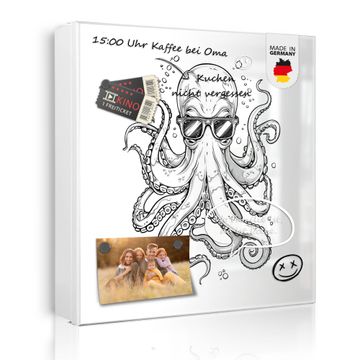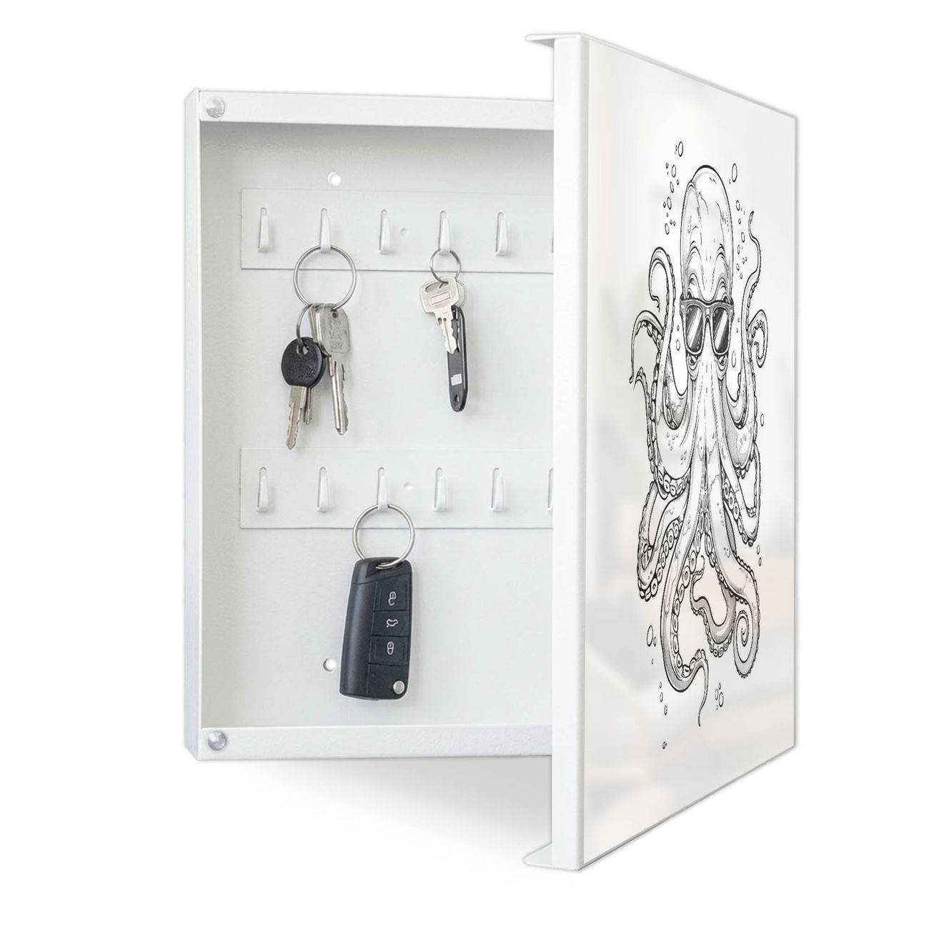 Bringe Ordnung und Eleganz in deinen Eingangsbereich mit dem banjado Schlüsselkasten Motiv Motiv Oktopus mit Brille. Die moderne Schlüsselbox kombiniert funktionales Design mit hochwertiger Verarbeitung und wird so zu einem echten Hingucker in Flur, Büro oder Ferienwohnung. ✅ Stilvolle Schlüsselaufbewahrung mit Motiv Motiv Oktopus mit Brille Der Design-Schlüsselkasten Motiv Motiv Oktopus mit Brille bietet Platz für bis zu 32 Schlüssel, die auf 4 stabilen Reihen mit je 8 Haken übersichtlich verstaut werden. Mit seinen kompakten Maßen von 30 x 30 x 5 cm passt die Schlüsselbox perfekt auch in kleinere Räume. Der weiß lackierte Stahlkorpus mit rechts angeschlagenem Türscharnier harmoniert mit gedruckten Folie auf der Front und fügt sich nahtlos in jedes Wohnambiente ein. Ob als Schlüsselorganizer für Zuhause oder als praktische Lösung für Büros, Praxen und Gewerbe, der banjado Schlüsselkasten sorgt für Ordnung und Übersicht. Dank der magnetischen, mit Kreidestiften beschreibbaren Folie auf der Front kannst du Notizen anheften oder Termine direkt auf der Oberfläche festhalten. Die Schlüsselbox Motiv Motiv Oktopus mit Brille zur Wandmontage wird inklusive Befestigungsmaterial geliefert und ist schnell angebracht. So hast du deine Schlüssel jederzeit griffbereit und zugleich stilvoll verstaut. Mit diesem banjado Schlüsselkasten Motiv Motiv Oktopus mit Brille kombinierst du praktische Aufbewahrung mit stilvollem Wohndesign. Ob privat oder geschäftlich, die Schlüsselbox sorgt für mehr Ordnung, Übersicht und ein wohnliches Ambiente.Vorteile im Überblick