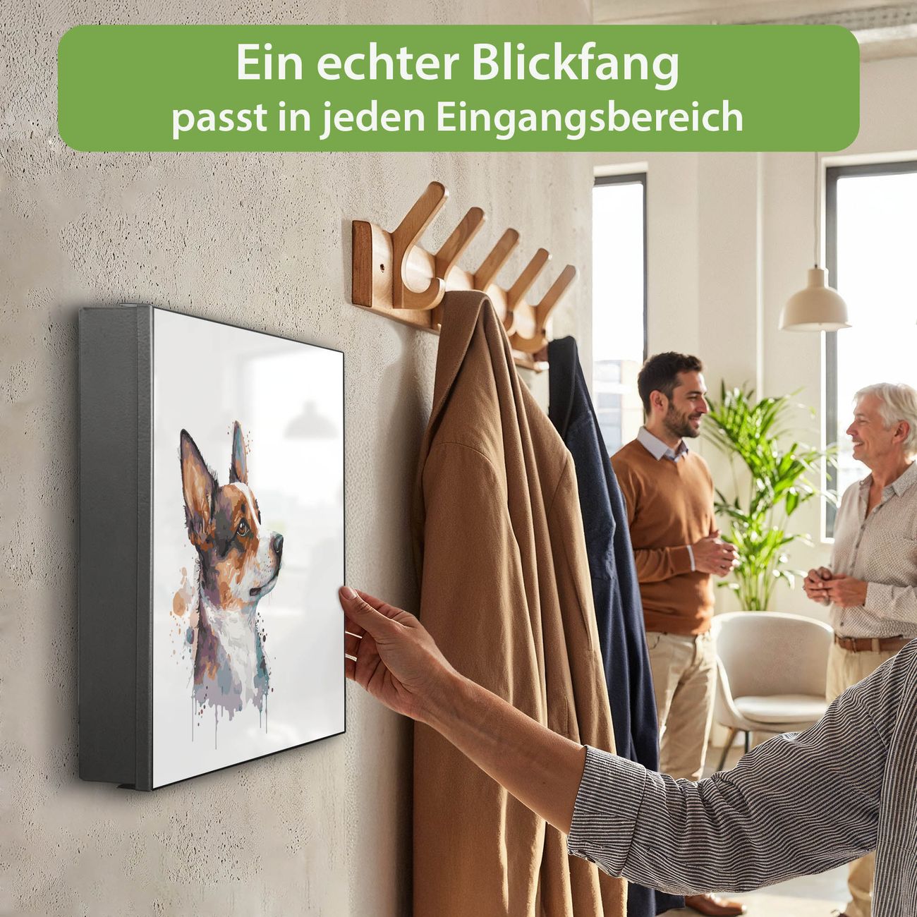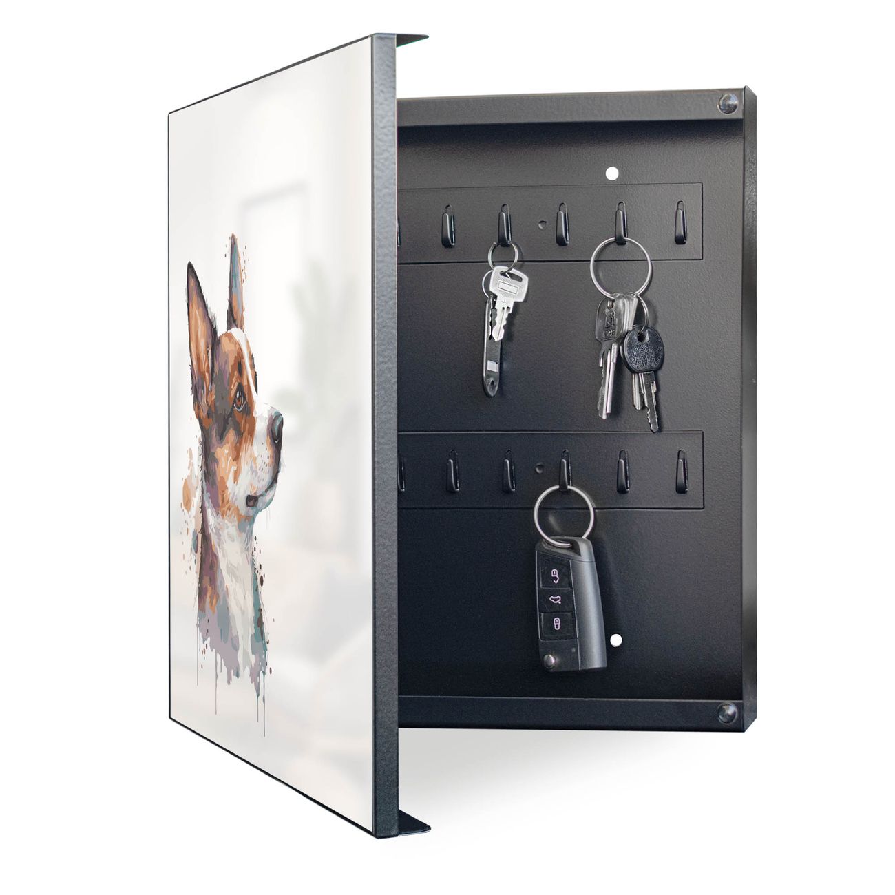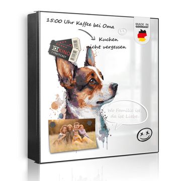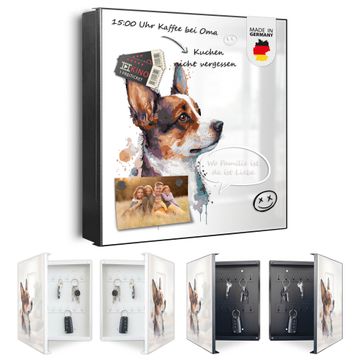 Bringe Ordnung und Eleganz in deinen Eingangsbereich mit dem banjado Schlüsselkasten Motiv Motiv Corgi Aquarell. Die moderne Schlüsselbox kombiniert funktionales Design mit hochwertiger Verarbeitung und wird so zu einem echten Hingucker in Flur, Büro oder Ferienwohnung. ✅ Stilvolle Schlüsselaufbewahrung mit Motiv Motiv Corgi Aquarell Der Design-Schlüsselkasten Motiv Motiv Corgi Aquarell bietet Platz für bis zu 32 Schlüssel, die auf 4 stabilen Reihen mit je 8 Haken übersichtlich verstaut werden. Mit seinen kompakten Maßen von 30 x 30 x 5 cm passt die Schlüsselbox perfekt auch in kleinere Räume. Der schwarz lackierte Stahlkorpus mit links angeschlagenem Türscharnier harmoniert mit gedruckten Folie auf der Front und fügt sich nahtlos in jedes Wohnambiente ein. Ob als Schlüsselorganizer für Zuhause oder als praktische Lösung für Büros, Praxen und Gewerbe, der banjado Schlüsselkasten sorgt für Ordnung und Übersicht. Dank der magnetischen, mit Kreidestiften beschreibbaren Folie auf der Front kannst du Notizen anheften oder Termine direkt auf der Oberfläche festhalten. Die Schlüsselbox Motiv Motiv Corgi Aquarell zur Wandmontage wird inklusive Befestigungsmaterial geliefert und ist schnell angebracht. So hast du deine Schlüssel jederzeit griffbereit und zugleich stilvoll verstaut. Mit diesem banjado Schlüsselkasten Motiv Motiv Corgi Aquarell kombinierst du praktische Aufbewahrung mit stilvollem Wohndesign. Ob privat oder geschäftlich, die Schlüsselbox sorgt für mehr Ordnung, Übersicht und ein wohnliches Ambiente.Vorteile im Überblick