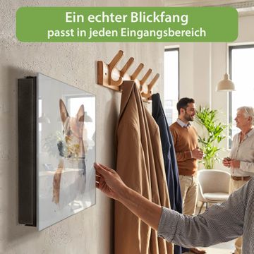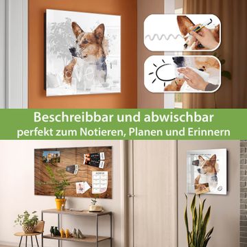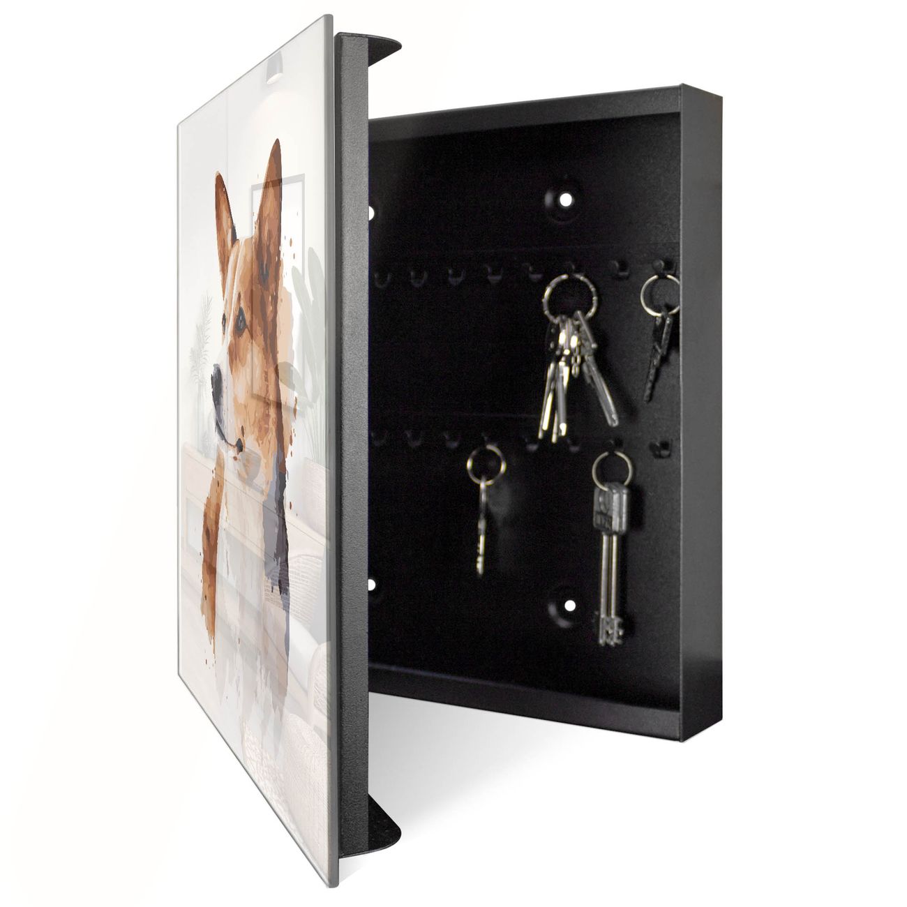 Bringe Ordnung und Eleganz in deinen Eingangsbereich mit dem banjado Schlüsselkasten Motiv Motiv Corgi Porträt. Die moderne Schlüsselbox kombiniert funktionales Design mit hochwertiger Verarbeitung und wird so zu einem echten Hingucker in Flur, Büro oder Ferienwohnung. ✅ Stilvolle Schlüsselaufbewahrung mit Glasfront im Motiv Motiv Corgi Porträt Der Design-Schlüsselkasten Motiv Motiv Corgi Porträt bietet Platz für bis zu 50 Schlüssel, die auf 5 stabilen Reihen mit je 10 Haken übersichtlich verstaut werden. Mit seinen kompakten Maßen von 30 x 30 x 5 cm passt die Schlüsselbox perfekt auch in kleinere Räume. Der schwarz lackierte Stahlkorpus mit rechts angeschlagenem Türscharnier harmoniert mit der Glasfront und fügt sich nahtlos in jedes Wohnambiente ein. Ob als Schlüsselorganizer für Zuhause oder als praktische Lösung für Büros, Praxen und Gewerbe, der banjado Schlüsselkasten sorgt für Ordnung und Übersicht. Dank der magnetischen, mit Kreidestiften beschreibbaren Glasfront kannst du Notizen anheften oder Termine direkt auf der Oberfläche festhalten. Die Schlüsselbox Motiv Motiv Corgi Porträt zur Wandmontage wird inklusive Befestigungsmaterial geliefert und ist schnell angebracht. So hast du deine Schlüssel jederzeit griffbereit und zugleich stilvoll verstaut. Mit diesem banjado Schlüsselkasten Motiv Motiv Corgi Porträt kombinierst du praktische Aufbewahrung mit stilvollem Wohndesign. Ob privat oder geschäftlich, die Schlüsselbox sorgt für mehr Ordnung, Übersicht und ein wohnliches Ambiente.Vorteile im Überblick