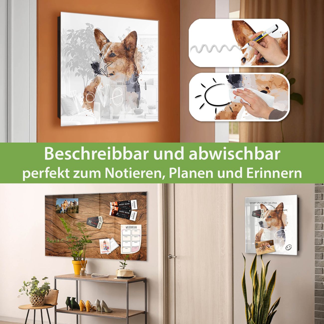 ✅ Magnetisch und mit Kreidestift beschreibbar, gehärtetes Glas, links angeschlagene TürOrdnung und Design in einem