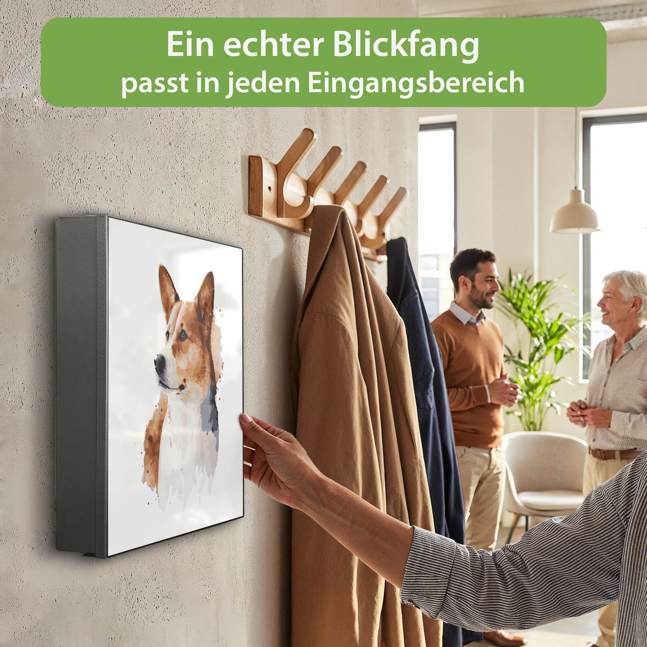 Bringe Ordnung und Eleganz in deinen Eingangsbereich mit dem banjado Schlüsselkasten Motiv Motiv Corgi Porträt Aquarell. Die moderne Schlüsselbox kombiniert funktionales Design mit hochwertiger Verarbeitung und wird so zu einem echten Hingucker in Flur, Büro oder Ferienwohnung. ✅ Stilvolle Schlüsselaufbewahrung mit Motiv Motiv Corgi Porträt Aquarell Der Design-Schlüsselkasten Motiv Motiv Corgi Porträt Aquarell bietet Platz für bis zu 32 Schlüssel, die auf 4 stabilen Reihen mit je 8 Haken übersichtlich verstaut werden. Mit seinen kompakten Maßen von 30 x 30 x 5 cm passt die Schlüsselbox perfekt auch in kleinere Räume. Der schwarz lackierte Stahlkorpus mit links angeschlagenem Türscharnier harmoniert mit gedruckten Folie auf der Front und fügt sich nahtlos in jedes Wohnambiente ein. Ob als Schlüsselorganizer für Zuhause oder als praktische Lösung für Büros, Praxen und Gewerbe, der banjado Schlüsselkasten sorgt für Ordnung und Übersicht. Dank der magnetischen, mit Kreidestiften beschreibbaren Folie auf der Front kannst du Notizen anheften oder Termine direkt auf der Oberfläche festhalten. Die Schlüsselbox Motiv Motiv Corgi Porträt Aquarell zur Wandmontage wird inklusive Befestigungsmaterial geliefert und ist schnell angebracht. So hast du deine Schlüssel jederzeit griffbereit und zugleich stilvoll verstaut. Mit diesem banjado Schlüsselkasten Motiv Motiv Corgi Porträt Aquarell kombinierst du praktische Aufbewahrung mit stilvollem Wohndesign. Ob privat oder geschäftlich, die Schlüsselbox sorgt für mehr Ordnung, Übersicht und ein wohnliches Ambiente.Vorteile im Überblick