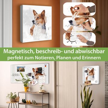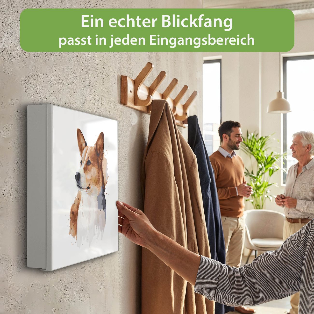 Bringe Ordnung und Eleganz in deinen Eingangsbereich mit dem banjado Schlüsselkasten Motiv Motiv Corgi Porträt Aquarell. Die moderne Schlüsselbox kombiniert funktionales Design mit hochwertiger Verarbeitung und wird so zu einem echten Hingucker in Flur, Büro oder Ferienwohnung. ✅ Stilvolle Schlüsselaufbewahrung mit Motiv Motiv Corgi Porträt Aquarell Der Design-Schlüsselkasten Motiv Motiv Corgi Porträt Aquarell bietet Platz für bis zu 32 Schlüssel, die auf 4 stabilen Reihen mit je 8 Haken übersichtlich verstaut werden. Mit seinen kompakten Maßen von 30 x 30 x 5 cm passt die Schlüsselbox perfekt auch in kleinere Räume. Der weiß lackierte Stahlkorpus mit links angeschlagenem Türscharnier harmoniert mit gedruckten Folie auf der Front und fügt sich nahtlos in jedes Wohnambiente ein. Ob als Schlüsselorganizer für Zuhause oder als praktische Lösung für Büros, Praxen und Gewerbe, der banjado Schlüsselkasten sorgt für Ordnung und Übersicht. Dank der magnetischen, mit Kreidestiften beschreibbaren Folie auf der Front kannst du Notizen anheften oder Termine direkt auf der Oberfläche festhalten. Die Schlüsselbox Motiv Motiv Corgi Porträt Aquarell zur Wandmontage wird inklusive Befestigungsmaterial geliefert und ist schnell angebracht. So hast du deine Schlüssel jederzeit griffbereit und zugleich stilvoll verstaut. Mit diesem banjado Schlüsselkasten Motiv Motiv Corgi Porträt Aquarell kombinierst du praktische Aufbewahrung mit stilvollem Wohndesign. Ob privat oder geschäftlich, die Schlüsselbox sorgt für mehr Ordnung, Übersicht und ein wohnliches Ambiente.Vorteile im Überblick