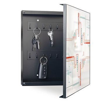 Bringe Ordnung und Eleganz in deinen Eingangsbereich mit dem banjado Schlüsselkasten Motiv Motiv Digitales Netzwerk 2. Die moderne Schlüsselbox kombiniert funktionales Design mit hochwertiger Verarbeitung und wird so zu einem echten Hingucker in Flur, Büro oder Ferienwohnung. ✅ Stilvolle Schlüsselaufbewahrung mit Motiv Motiv Digitales Netzwerk 2 Der Design-Schlüsselkasten Motiv Motiv Digitales Netzwerk 2 bietet Platz für bis zu 32 Schlüssel, die auf 4 stabilen Reihen mit je 8 Haken übersichtlich verstaut werden. Mit seinen kompakten Maßen von 30 x 30 x 5 cm passt die Schlüsselbox perfekt auch in kleinere Räume. Der schwarz lackierte Stahlkorpus mit rechts angeschlagenem Türscharnier harmoniert mit gedruckten Folie auf der Front und fügt sich nahtlos in jedes Wohnambiente ein. Ob als Schlüsselorganizer für Zuhause oder als praktische Lösung für Büros, Praxen und Gewerbe, der banjado Schlüsselkasten sorgt für Ordnung und Übersicht. Dank der magnetischen, mit Kreidestiften beschreibbaren Folie auf der Front kannst du Notizen anheften oder Termine direkt auf der Oberfläche festhalten. Die Schlüsselbox Motiv Motiv Digitales Netzwerk 2 zur Wandmontage wird inklusive Befestigungsmaterial geliefert und ist schnell angebracht. So hast du deine Schlüssel jederzeit griffbereit und zugleich stilvoll verstaut. Mit diesem banjado Schlüsselkasten Motiv Motiv Digitales Netzwerk 2 kombinierst du praktische Aufbewahrung mit stilvollem Wohndesign. Ob privat oder geschäftlich, die Schlüsselbox sorgt für mehr Ordnung, Übersicht und ein wohnliches Ambiente.Vorteile im Überblick