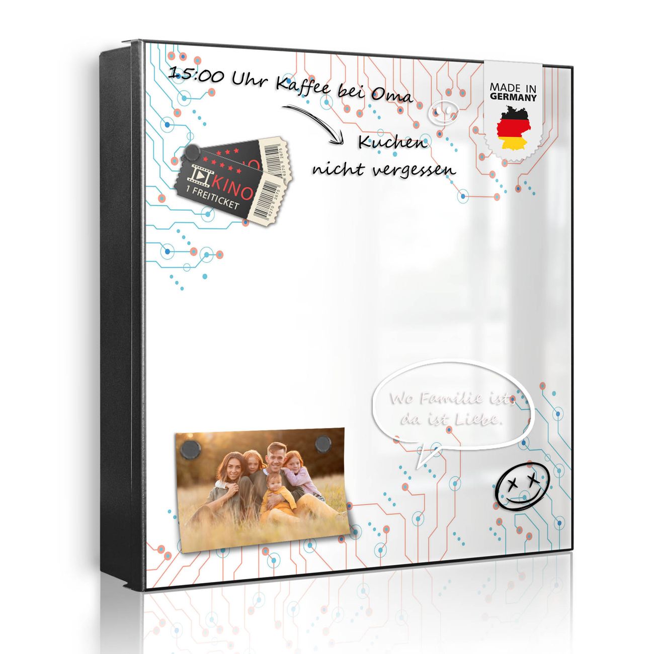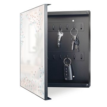 Bringe Ordnung und Eleganz in deinen Eingangsbereich mit dem banjado Schlüsselkasten Motiv Motiv Digitales Schaltkreismuster. Die moderne Schlüsselbox kombiniert funktionales Design mit hochwertiger Verarbeitung und wird so zu einem echten Hingucker in Flur, Büro oder Ferienwohnung. ✅ Stilvolle Schlüsselaufbewahrung mit Motiv Motiv Digitales Schaltkreismuster Der Design-Schlüsselkasten Motiv Motiv Digitales Schaltkreismuster bietet Platz für bis zu 32 Schlüssel, die auf 4 stabilen Reihen mit je 8 Haken übersichtlich verstaut werden. Mit seinen kompakten Maßen von 30 x 30 x 5 cm passt die Schlüsselbox perfekt auch in kleinere Räume. Der schwarz lackierte Stahlkorpus mit links angeschlagenem Türscharnier harmoniert mit gedruckten Folie auf der Front und fügt sich nahtlos in jedes Wohnambiente ein. Ob als Schlüsselorganizer für Zuhause oder als praktische Lösung für Büros, Praxen und Gewerbe, der banjado Schlüsselkasten sorgt für Ordnung und Übersicht. Dank der magnetischen, mit Kreidestiften beschreibbaren Folie auf der Front kannst du Notizen anheften oder Termine direkt auf der Oberfläche festhalten. Die Schlüsselbox Motiv Motiv Digitales Schaltkreismuster zur Wandmontage wird inklusive Befestigungsmaterial geliefert und ist schnell angebracht. So hast du deine Schlüssel jederzeit griffbereit und zugleich stilvoll verstaut. Mit diesem banjado Schlüsselkasten Motiv Motiv Digitales Schaltkreismuster kombinierst du praktische Aufbewahrung mit stilvollem Wohndesign. Ob privat oder geschäftlich, die Schlüsselbox sorgt für mehr Ordnung, Übersicht und ein wohnliches Ambiente.Vorteile im Überblick