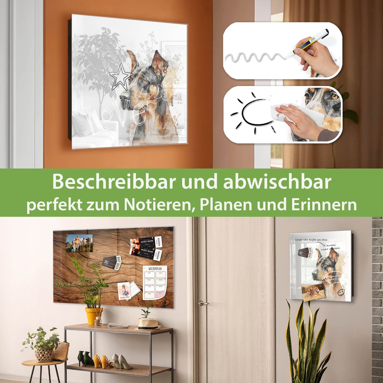 ✅ Magnetisch und mit Kreidestift beschreibbar, gehärtetes Glas, links angeschlagene TürOrdnung und Design in einem