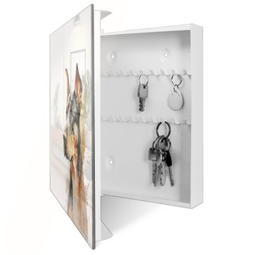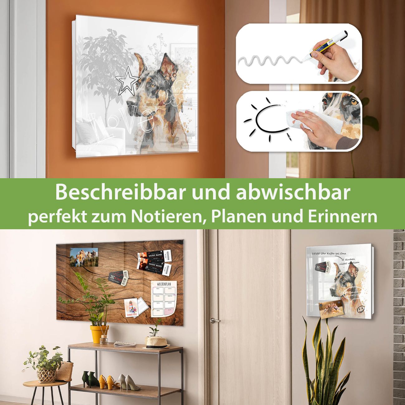 Bringe Ordnung und Eleganz in deinen Eingangsbereich mit dem banjado Schlüsselkasten Motiv Motiv Dobermann-Portrait. Die moderne Schlüsselbox kombiniert funktionales Design mit hochwertiger Verarbeitung und wird so zu einem echten Hingucker in Flur, Büro oder Ferienwohnung. ✅ Stilvolle Schlüsselaufbewahrung mit Glasfront im Motiv Motiv Dobermann-Portrait Der Design-Schlüsselkasten Motiv Motiv Dobermann-Portrait bietet Platz für bis zu 50 Schlüssel, die auf 5 stabilen Reihen mit je 10 Haken übersichtlich verstaut werden. Mit seinen kompakten Maßen von 30 x 30 x 5 cm passt die Schlüsselbox perfekt auch in kleinere Räume. Der weiß lackierte Stahlkorpus mit rechts angeschlagenem Türscharnier harmoniert mit der Glasfront und fügt sich nahtlos in jedes Wohnambiente ein. Ob als Schlüsselorganizer für Zuhause oder als praktische Lösung für Büros, Praxen und Gewerbe, der banjado Schlüsselkasten sorgt für Ordnung und Übersicht. Dank der magnetischen, mit Kreidestiften beschreibbaren Glasfront kannst du Notizen anheften oder Termine direkt auf der Oberfläche festhalten. Die Schlüsselbox Motiv Motiv Dobermann-Portrait zur Wandmontage wird inklusive Befestigungsmaterial geliefert und ist schnell angebracht. So hast du deine Schlüssel jederzeit griffbereit und zugleich stilvoll verstaut. Mit diesem banjado Schlüsselkasten Motiv Motiv Dobermann-Portrait kombinierst du praktische Aufbewahrung mit stilvollem Wohndesign. Ob privat oder geschäftlich, die Schlüsselbox sorgt für mehr Ordnung, Übersicht und ein wohnliches Ambiente.Vorteile im Überblick