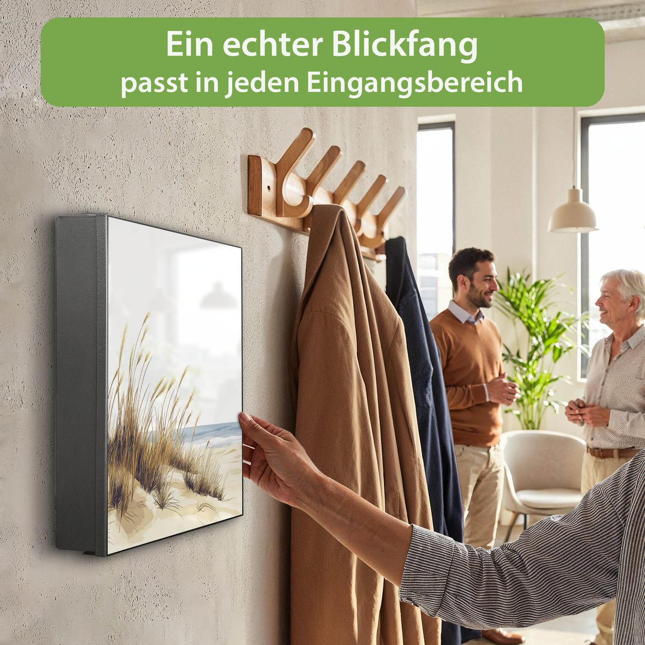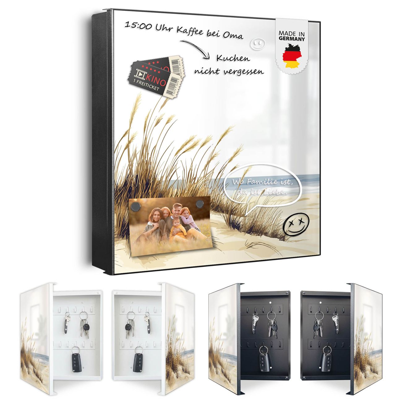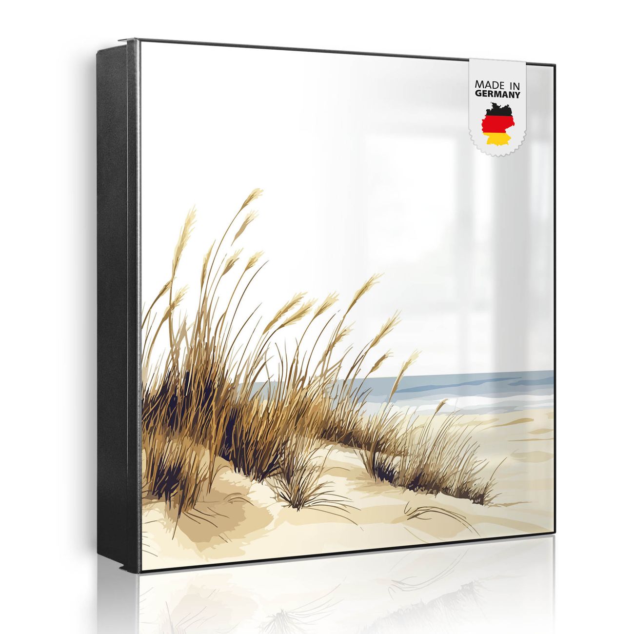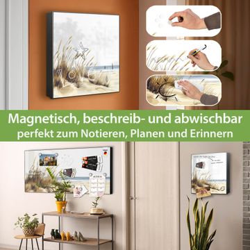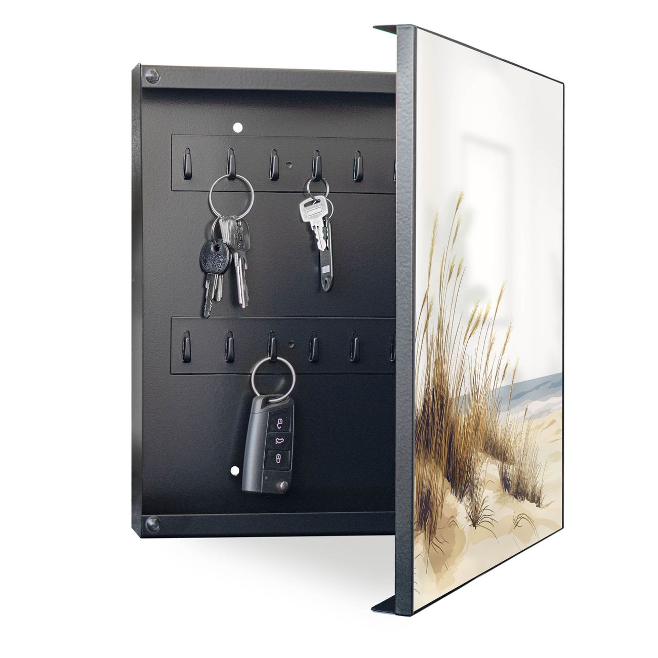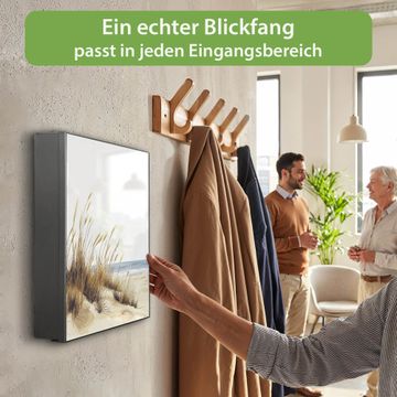Bringe Ordnung und Eleganz in deinen Eingangsbereich mit dem banjado Schlüsselkasten Motiv Motiv Dünenlandschaft am Meer. Die moderne Schlüsselbox kombiniert funktionales Design mit hochwertiger Verarbeitung und wird so zu einem echten Hingucker in Flur, Büro oder Ferienwohnung. ✅ Stilvolle Schlüsselaufbewahrung mit Motiv Motiv Dünenlandschaft am Meer Der Design-Schlüsselkasten Motiv Motiv Dünenlandschaft am Meer bietet Platz für bis zu 32 Schlüssel, die auf 4 stabilen Reihen mit je 8 Haken übersichtlich verstaut werden. Mit seinen kompakten Maßen von 30 x 30 x 5 cm passt die Schlüsselbox perfekt auch in kleinere Räume. Der schwarz lackierte Stahlkorpus mit rechts angeschlagenem Türscharnier harmoniert mit gedruckten Folie auf der Front und fügt sich nahtlos in jedes Wohnambiente ein. Ob als Schlüsselorganizer für Zuhause oder als praktische Lösung für Büros, Praxen und Gewerbe, der banjado Schlüsselkasten sorgt für Ordnung und Übersicht. Dank der magnetischen, mit Kreidestiften beschreibbaren Folie auf der Front kannst du Notizen anheften oder Termine direkt auf der Oberfläche festhalten. Die Schlüsselbox Motiv Motiv Dünenlandschaft am Meer zur Wandmontage wird inklusive Befestigungsmaterial geliefert und ist schnell angebracht. So hast du deine Schlüssel jederzeit griffbereit und zugleich stilvoll verstaut. Mit diesem banjado Schlüsselkasten Motiv Motiv Dünenlandschaft am Meer kombinierst du praktische Aufbewahrung mit stilvollem Wohndesign. Ob privat oder geschäftlich, die Schlüsselbox sorgt für mehr Ordnung, Übersicht und ein wohnliches Ambiente.Vorteile im Überblick