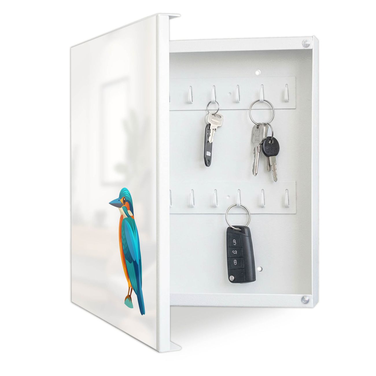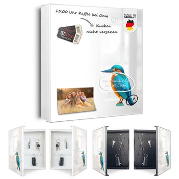 Bringe Ordnung und Eleganz in deinen Eingangsbereich mit dem banjado Schlüsselkasten Motiv Motiv Eisvogel Illustration. Die moderne Schlüsselbox kombiniert funktionales Design mit hochwertiger Verarbeitung und wird so zu einem echten Hingucker in Flur, Büro oder Ferienwohnung. ✅ Stilvolle Schlüsselaufbewahrung mit Motiv Motiv Eisvogel Illustration Der Design-Schlüsselkasten Motiv Motiv Eisvogel Illustration bietet Platz für bis zu 32 Schlüssel, die auf 4 stabilen Reihen mit je 8 Haken übersichtlich verstaut werden. Mit seinen kompakten Maßen von 30 x 30 x 5 cm passt die Schlüsselbox perfekt auch in kleinere Räume. Der weiß lackierte Stahlkorpus mit links angeschlagenem Türscharnier harmoniert mit gedruckten Folie auf der Front und fügt sich nahtlos in jedes Wohnambiente ein. Ob als Schlüsselorganizer für Zuhause oder als praktische Lösung für Büros, Praxen und Gewerbe, der banjado Schlüsselkasten sorgt für Ordnung und Übersicht. Dank der magnetischen, mit Kreidestiften beschreibbaren Folie auf der Front kannst du Notizen anheften oder Termine direkt auf der Oberfläche festhalten. Die Schlüsselbox Motiv Motiv Eisvogel Illustration zur Wandmontage wird inklusive Befestigungsmaterial geliefert und ist schnell angebracht. So hast du deine Schlüssel jederzeit griffbereit und zugleich stilvoll verstaut. Mit diesem banjado Schlüsselkasten Motiv Motiv Eisvogel Illustration kombinierst du praktische Aufbewahrung mit stilvollem Wohndesign. Ob privat oder geschäftlich, die Schlüsselbox sorgt für mehr Ordnung, Übersicht und ein wohnliches Ambiente.Vorteile im Überblick