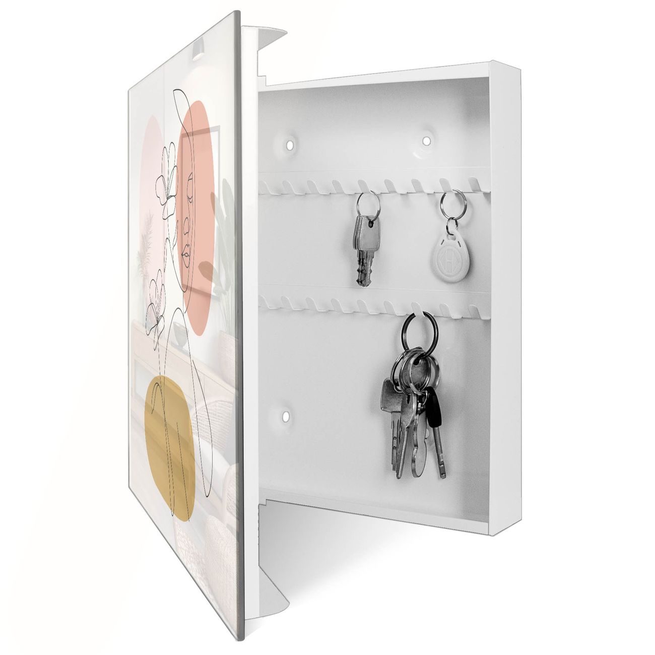 Bringe Ordnung und Eleganz in deinen Eingangsbereich mit dem banjado Schlüsselkasten Motiv Motiv Elegante Linienblüte. Die moderne Schlüsselbox kombiniert funktionales Design mit hochwertiger Verarbeitung und wird so zu einem echten Hingucker in Flur, Büro oder Ferienwohnung. ✅ Stilvolle Schlüsselaufbewahrung mit Glasfront im Motiv Motiv Elegante Linienblüte Der Design-Schlüsselkasten Motiv Motiv Elegante Linienblüte bietet Platz für bis zu 50 Schlüssel, die auf 5 stabilen Reihen mit je 10 Haken übersichtlich verstaut werden. Mit seinen kompakten Maßen von 30 x 30 x 5 cm passt die Schlüsselbox perfekt auch in kleinere Räume. Der weiß lackierte Stahlkorpus mit rechts angeschlagenem Türscharnier harmoniert mit der Glasfront und fügt sich nahtlos in jedes Wohnambiente ein. Ob als Schlüsselorganizer für Zuhause oder als praktische Lösung für Büros, Praxen und Gewerbe, der banjado Schlüsselkasten sorgt für Ordnung und Übersicht. Dank der magnetischen, mit Kreidestiften beschreibbaren Glasfront kannst du Notizen anheften oder Termine direkt auf der Oberfläche festhalten. Die Schlüsselbox Motiv Motiv Elegante Linienblüte zur Wandmontage wird inklusive Befestigungsmaterial geliefert und ist schnell angebracht. So hast du deine Schlüssel jederzeit griffbereit und zugleich stilvoll verstaut. Mit diesem banjado Schlüsselkasten Motiv Motiv Elegante Linienblüte kombinierst du praktische Aufbewahrung mit stilvollem Wohndesign. Ob privat oder geschäftlich, die Schlüsselbox sorgt für mehr Ordnung, Übersicht und ein wohnliches Ambiente.Vorteile im Überblick