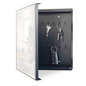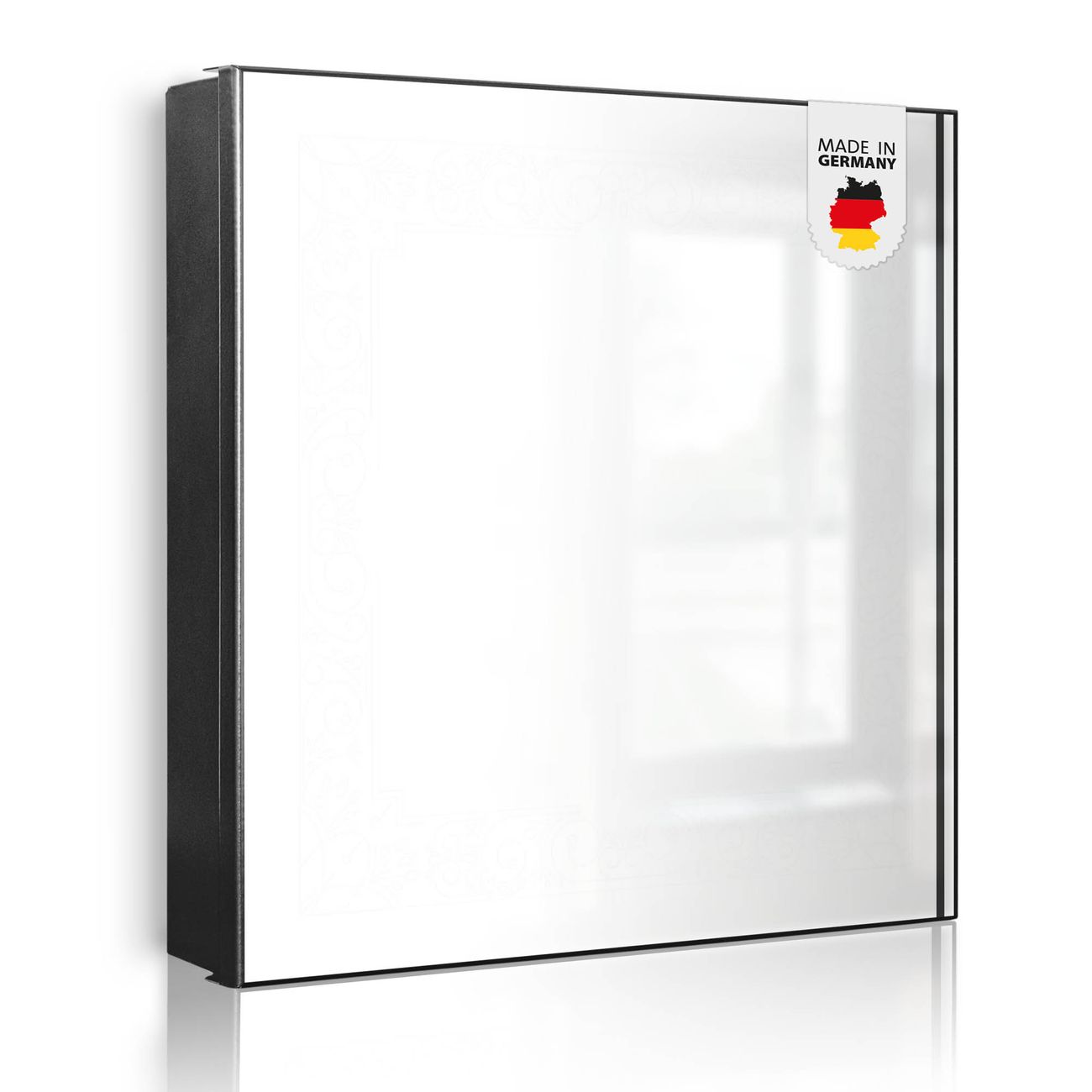 Bringe Ordnung und Eleganz in deinen Eingangsbereich mit dem banjado Schlüsselkasten Motiv Motiv Elegantes Ornament. Die moderne Schlüsselbox kombiniert funktionales Design mit hochwertiger Verarbeitung und wird so zu einem echten Hingucker in Flur, Büro oder Ferienwohnung. ✅ Stilvolle Schlüsselaufbewahrung mit Motiv Motiv Elegantes Ornament Der Design-Schlüsselkasten Motiv Motiv Elegantes Ornament bietet Platz für bis zu 32 Schlüssel, die auf 4 stabilen Reihen mit je 8 Haken übersichtlich verstaut werden. Mit seinen kompakten Maßen von 30 x 30 x 5 cm passt die Schlüsselbox perfekt auch in kleinere Räume. Der schwarz lackierte Stahlkorpus mit links angeschlagenem Türscharnier harmoniert mit gedruckten Folie auf der Front und fügt sich nahtlos in jedes Wohnambiente ein. Ob als Schlüsselorganizer für Zuhause oder als praktische Lösung für Büros, Praxen und Gewerbe, der banjado Schlüsselkasten sorgt für Ordnung und Übersicht. Dank der magnetischen, mit Kreidestiften beschreibbaren Folie auf der Front kannst du Notizen anheften oder Termine direkt auf der Oberfläche festhalten. Die Schlüsselbox Motiv Motiv Elegantes Ornament zur Wandmontage wird inklusive Befestigungsmaterial geliefert und ist schnell angebracht. So hast du deine Schlüssel jederzeit griffbereit und zugleich stilvoll verstaut. Mit diesem banjado Schlüsselkasten Motiv Motiv Elegantes Ornament kombinierst du praktische Aufbewahrung mit stilvollem Wohndesign. Ob privat oder geschäftlich, die Schlüsselbox sorgt für mehr Ordnung, Übersicht und ein wohnliches Ambiente.Vorteile im Überblick
