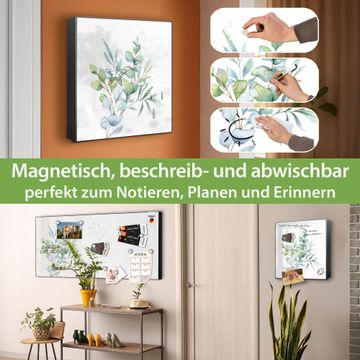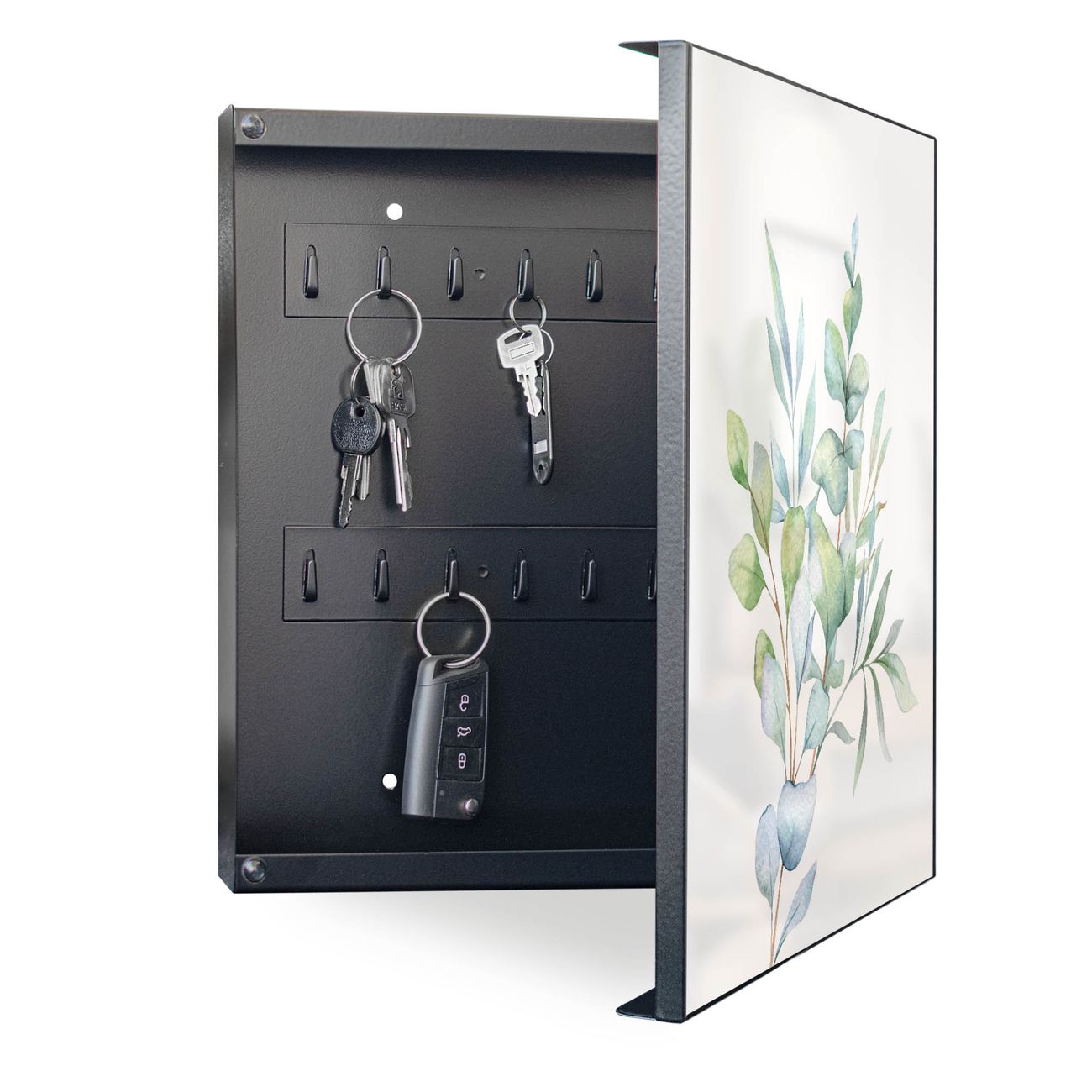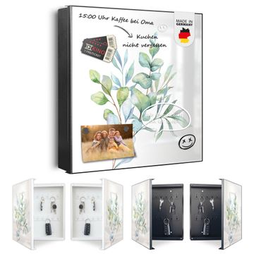 Bringe Ordnung und Eleganz in deinen Eingangsbereich mit dem banjado Schlüsselkasten Motiv Motiv Eukalyptus Aquarell. Die moderne Schlüsselbox kombiniert funktionales Design mit hochwertiger Verarbeitung und wird so zu einem echten Hingucker in Flur, Büro oder Ferienwohnung. ✅ Stilvolle Schlüsselaufbewahrung mit Motiv Motiv Eukalyptus Aquarell Der Design-Schlüsselkasten Motiv Motiv Eukalyptus Aquarell bietet Platz für bis zu 32 Schlüssel, die auf 4 stabilen Reihen mit je 8 Haken übersichtlich verstaut werden. Mit seinen kompakten Maßen von 30 x 30 x 5 cm passt die Schlüsselbox perfekt auch in kleinere Räume. Der schwarz lackierte Stahlkorpus mit rechts angeschlagenem Türscharnier harmoniert mit gedruckten Folie auf der Front und fügt sich nahtlos in jedes Wohnambiente ein. Ob als Schlüsselorganizer für Zuhause oder als praktische Lösung für Büros, Praxen und Gewerbe, der banjado Schlüsselkasten sorgt für Ordnung und Übersicht. Dank der magnetischen, mit Kreidestiften beschreibbaren Folie auf der Front kannst du Notizen anheften oder Termine direkt auf der Oberfläche festhalten. Die Schlüsselbox Motiv Motiv Eukalyptus Aquarell zur Wandmontage wird inklusive Befestigungsmaterial geliefert und ist schnell angebracht. So hast du deine Schlüssel jederzeit griffbereit und zugleich stilvoll verstaut. Mit diesem banjado Schlüsselkasten Motiv Motiv Eukalyptus Aquarell kombinierst du praktische Aufbewahrung mit stilvollem Wohndesign. Ob privat oder geschäftlich, die Schlüsselbox sorgt für mehr Ordnung, Übersicht und ein wohnliches Ambiente.Vorteile im Überblick
