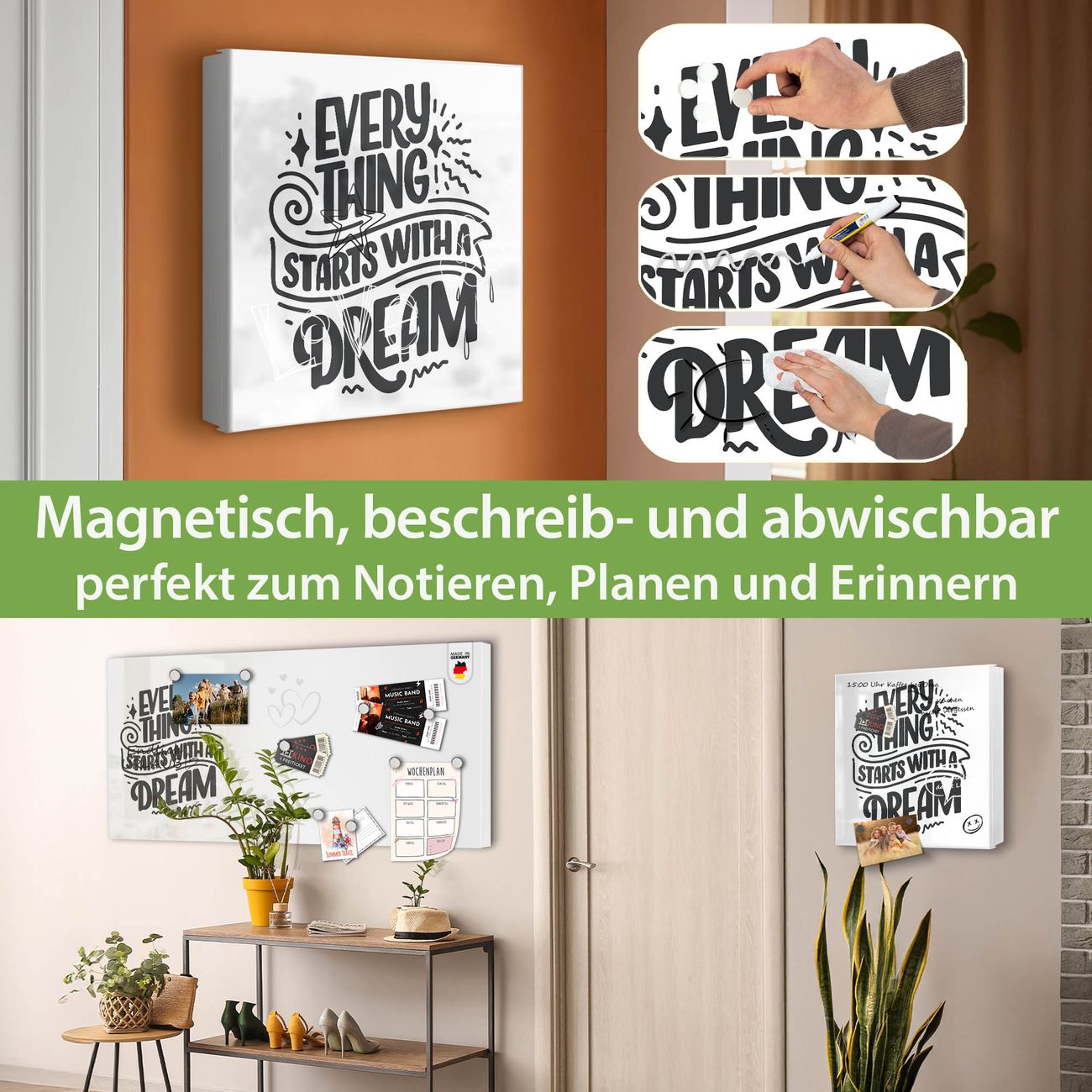 Bringe Ordnung und Eleganz in deinen Eingangsbereich mit dem banjado Schlüsselkasten Motiv Motiv Everything starts with a Dream 2. Die moderne Schlüsselbox kombiniert funktionales Design mit hochwertiger Verarbeitung und wird so zu einem echten Hingucker in Flur, Büro oder Ferienwohnung. ✅ Stilvolle Schlüsselaufbewahrung mit Motiv Motiv Everything starts with a Dream 2 Der Design-Schlüsselkasten Motiv Motiv Everything starts with a Dream 2 bietet Platz für bis zu 32 Schlüssel, die auf 4 stabilen Reihen mit je 8 Haken übersichtlich verstaut werden. Mit seinen kompakten Maßen von 30 x 30 x 5 cm passt die Schlüsselbox perfekt auch in kleinere Räume. Der weiß lackierte Stahlkorpus mit links angeschlagenem Türscharnier harmoniert mit gedruckten Folie auf der Front und fügt sich nahtlos in jedes Wohnambiente ein. Ob als Schlüsselorganizer für Zuhause oder als praktische Lösung für Büros, Praxen und Gewerbe, der banjado Schlüsselkasten sorgt für Ordnung und Übersicht. Dank der magnetischen, mit Kreidestiften beschreibbaren Folie auf der Front kannst du Notizen anheften oder Termine direkt auf der Oberfläche festhalten. Die Schlüsselbox Motiv Motiv Everything starts with a Dream 2 zur Wandmontage wird inklusive Befestigungsmaterial geliefert und ist schnell angebracht. So hast du deine Schlüssel jederzeit griffbereit und zugleich stilvoll verstaut. Mit diesem banjado Schlüsselkasten Motiv Motiv Everything starts with a Dream 2 kombinierst du praktische Aufbewahrung mit stilvollem Wohndesign. Ob privat oder geschäftlich, die Schlüsselbox sorgt für mehr Ordnung, Übersicht und ein wohnliches Ambiente.Vorteile im Überblick