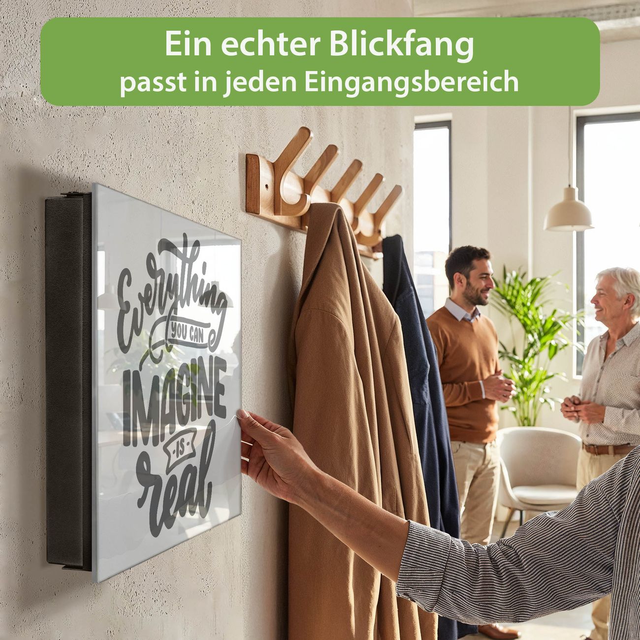 Bringe Ordnung und Eleganz in deinen Eingangsbereich mit dem banjado Schlüsselkasten Motiv Motiv Everything you can imagine is real 2. Die moderne Schlüsselbox kombiniert funktionales Design mit hochwertiger Verarbeitung und wird so zu einem echten Hingucker in Flur, Büro oder Ferienwohnung. ✅ Stilvolle Schlüsselaufbewahrung mit Glasfront im Motiv Motiv Everything you can imagine is real 2 Der Design-Schlüsselkasten Motiv Motiv Everything you can imagine is real 2 bietet Platz für bis zu 50 Schlüssel, die auf 5 stabilen Reihen mit je 10 Haken übersichtlich verstaut werden. Mit seinen kompakten Maßen von 30 x 30 x 5 cm passt die Schlüsselbox perfekt auch in kleinere Räume. Der schwarz lackierte Stahlkorpus mit rechts angeschlagenem Türscharnier harmoniert mit der Glasfront und fügt sich nahtlos in jedes Wohnambiente ein. Ob als Schlüsselorganizer für Zuhause oder als praktische Lösung für Büros, Praxen und Gewerbe, der banjado Schlüsselkasten sorgt für Ordnung und Übersicht. Dank der magnetischen, mit Kreidestiften beschreibbaren Glasfront kannst du Notizen anheften oder Termine direkt auf der Oberfläche festhalten. Die Schlüsselbox Motiv Motiv Everything you can imagine is real 2 zur Wandmontage wird inklusive Befestigungsmaterial geliefert und ist schnell angebracht. So hast du deine Schlüssel jederzeit griffbereit und zugleich stilvoll verstaut. Mit diesem banjado Schlüsselkasten Motiv Motiv Everything you can imagine is real 2 kombinierst du praktische Aufbewahrung mit stilvollem Wohndesign. Ob privat oder geschäftlich, die Schlüsselbox sorgt für mehr Ordnung, Übersicht und ein wohnliches Ambiente.Vorteile im Überblick