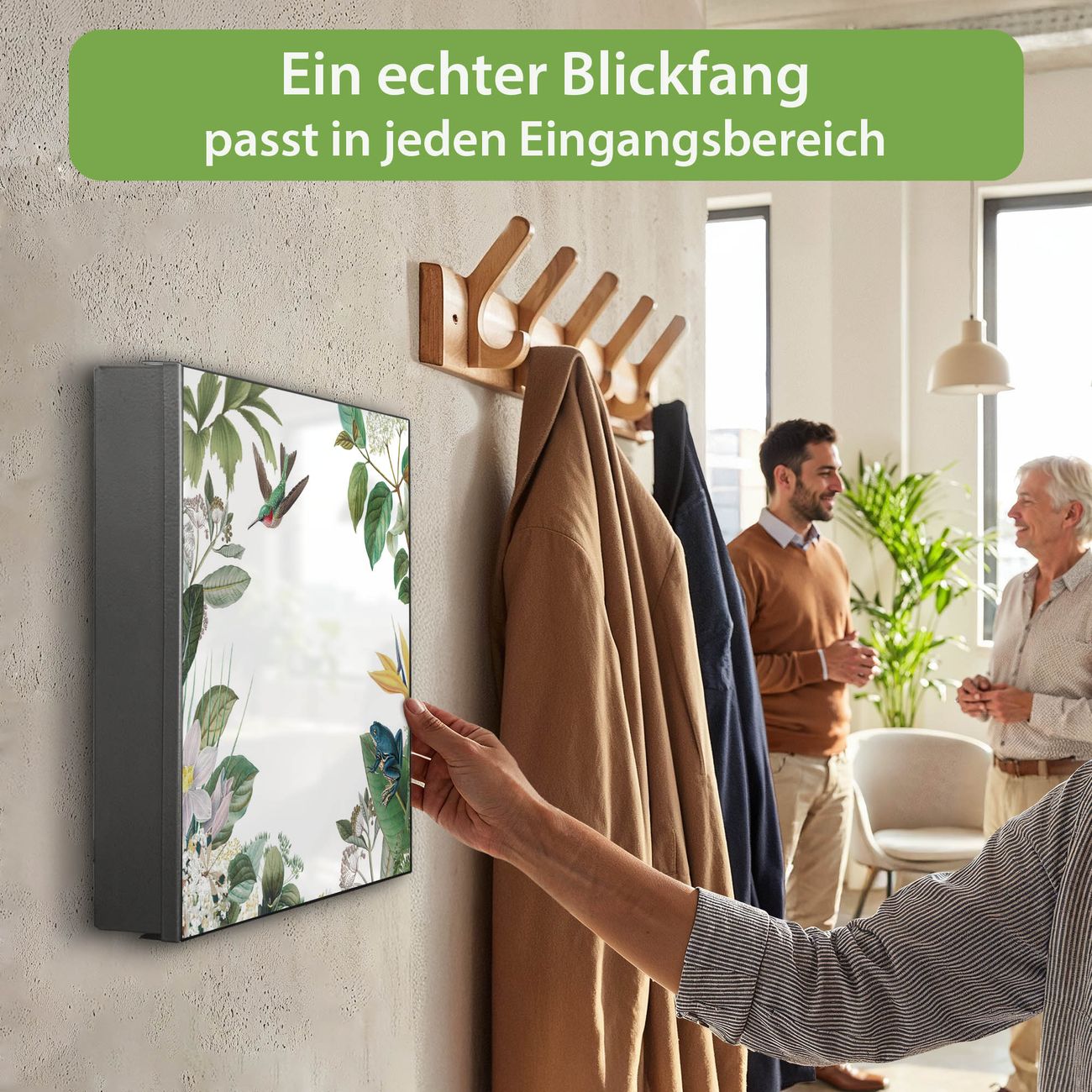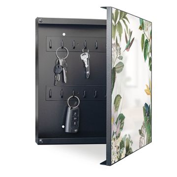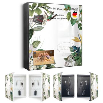 Bringe Ordnung und Eleganz in deinen Eingangsbereich mit dem banjado Schlüsselkasten Motiv Motiv Exotisches Paradies. Die moderne Schlüsselbox kombiniert funktionales Design mit hochwertiger Verarbeitung und wird so zu einem echten Hingucker in Flur, Büro oder Ferienwohnung. ✅ Stilvolle Schlüsselaufbewahrung mit Motiv Motiv Exotisches Paradies Der Design-Schlüsselkasten Motiv Motiv Exotisches Paradies bietet Platz für bis zu 32 Schlüssel, die auf 4 stabilen Reihen mit je 8 Haken übersichtlich verstaut werden. Mit seinen kompakten Maßen von 30 x 30 x 5 cm passt die Schlüsselbox perfekt auch in kleinere Räume. Der schwarz lackierte Stahlkorpus mit rechts angeschlagenem Türscharnier harmoniert mit gedruckten Folie auf der Front und fügt sich nahtlos in jedes Wohnambiente ein. Ob als Schlüsselorganizer für Zuhause oder als praktische Lösung für Büros, Praxen und Gewerbe, der banjado Schlüsselkasten sorgt für Ordnung und Übersicht. Dank der magnetischen, mit Kreidestiften beschreibbaren Folie auf der Front kannst du Notizen anheften oder Termine direkt auf der Oberfläche festhalten. Die Schlüsselbox Motiv Motiv Exotisches Paradies zur Wandmontage wird inklusive Befestigungsmaterial geliefert und ist schnell angebracht. So hast du deine Schlüssel jederzeit griffbereit und zugleich stilvoll verstaut. Mit diesem banjado Schlüsselkasten Motiv Motiv Exotisches Paradies kombinierst du praktische Aufbewahrung mit stilvollem Wohndesign. Ob privat oder geschäftlich, die Schlüsselbox sorgt für mehr Ordnung, Übersicht und ein wohnliches Ambiente.Vorteile im Überblick