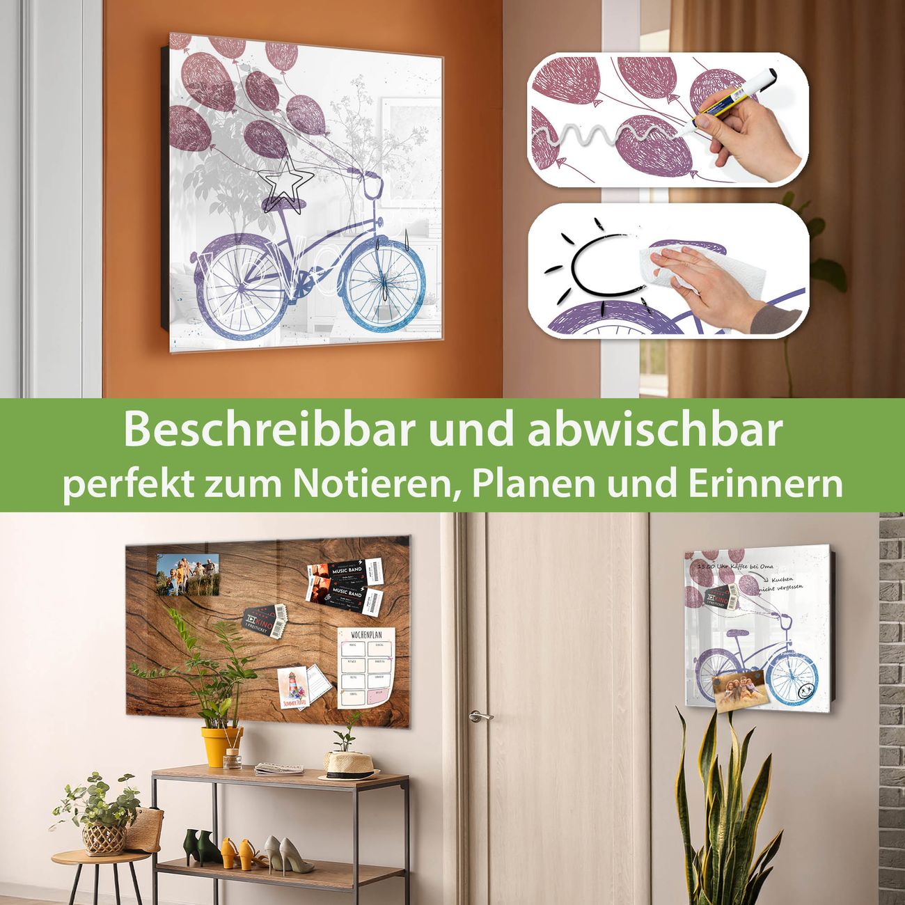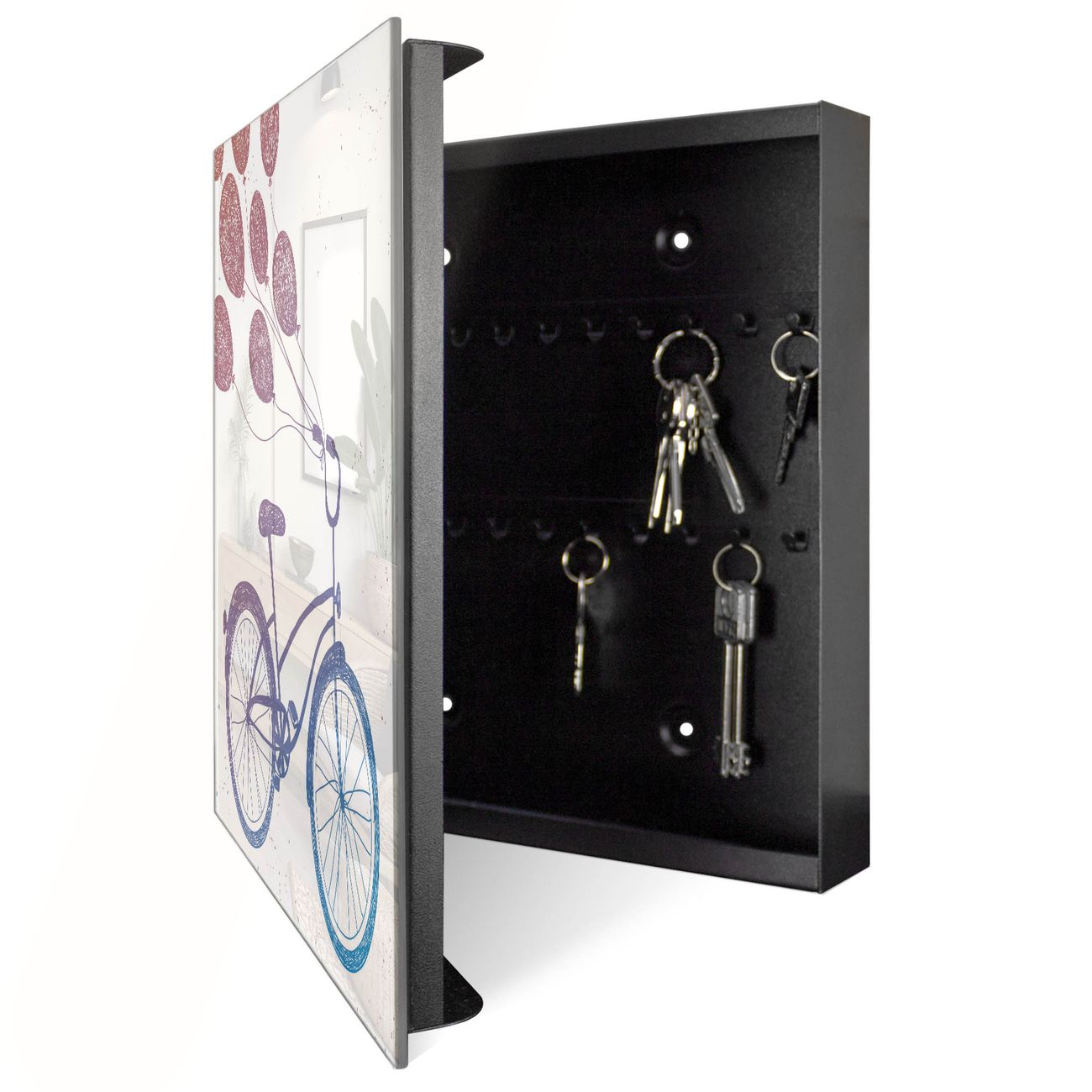 Bringe Ordnung und Eleganz in deinen Eingangsbereich mit dem banjado Schlüsselkasten Motiv Motiv Fahrrad mit Luftballons. Die moderne Schlüsselbox kombiniert funktionales Design mit hochwertiger Verarbeitung und wird so zu einem echten Hingucker in Flur, Büro oder Ferienwohnung. ✅ Stilvolle Schlüsselaufbewahrung mit Glasfront im Motiv Motiv Fahrrad mit Luftballons Der Design-Schlüsselkasten Motiv Motiv Fahrrad mit Luftballons bietet Platz für bis zu 50 Schlüssel, die auf 5 stabilen Reihen mit je 10 Haken übersichtlich verstaut werden. Mit seinen kompakten Maßen von 30 x 30 x 5 cm passt die Schlüsselbox perfekt auch in kleinere Räume. Der schwarz lackierte Stahlkorpus mit rechts angeschlagenem Türscharnier harmoniert mit der Glasfront und fügt sich nahtlos in jedes Wohnambiente ein. Ob als Schlüsselorganizer für Zuhause oder als praktische Lösung für Büros, Praxen und Gewerbe, der banjado Schlüsselkasten sorgt für Ordnung und Übersicht. Dank der magnetischen, mit Kreidestiften beschreibbaren Glasfront kannst du Notizen anheften oder Termine direkt auf der Oberfläche festhalten. Die Schlüsselbox Motiv Motiv Fahrrad mit Luftballons zur Wandmontage wird inklusive Befestigungsmaterial geliefert und ist schnell angebracht. So hast du deine Schlüssel jederzeit griffbereit und zugleich stilvoll verstaut. Mit diesem banjado Schlüsselkasten Motiv Motiv Fahrrad mit Luftballons kombinierst du praktische Aufbewahrung mit stilvollem Wohndesign. Ob privat oder geschäftlich, die Schlüsselbox sorgt für mehr Ordnung, Übersicht und ein wohnliches Ambiente.Vorteile im Überblick