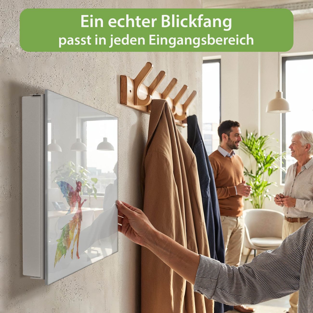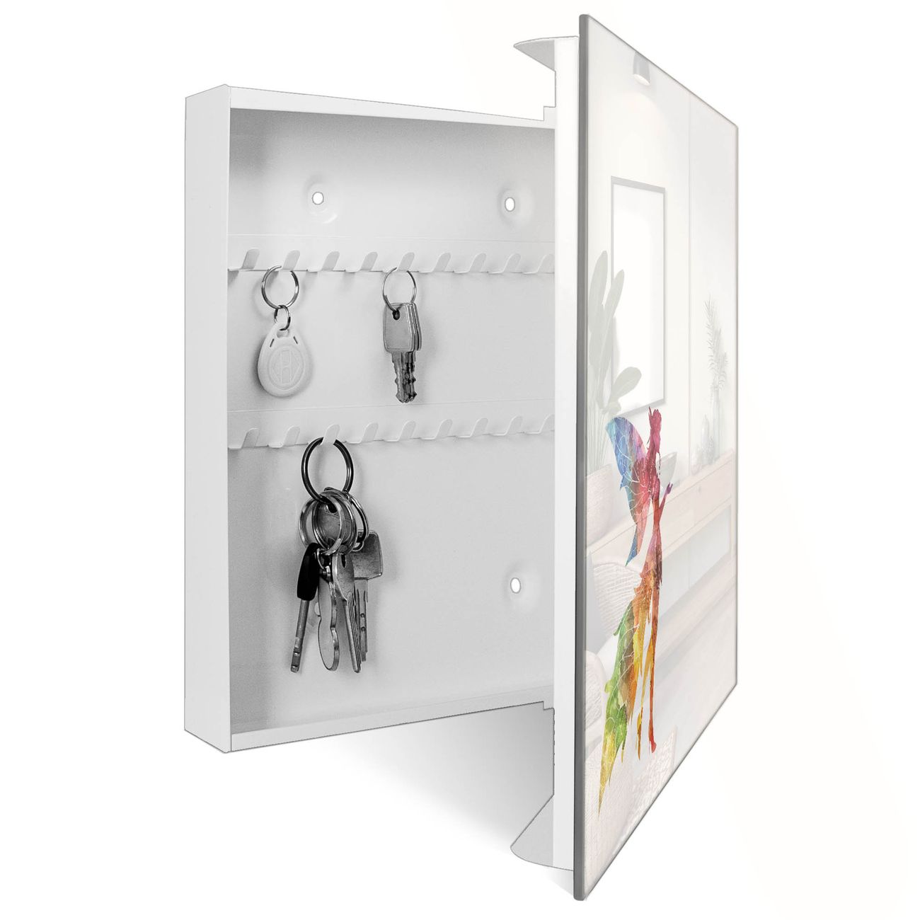 Bringe Ordnung und Eleganz in deinen Eingangsbereich mit dem banjado Schlüsselkasten Motiv Motiv Fantasievolle Fee. Die moderne Schlüsselbox kombiniert funktionales Design mit hochwertiger Verarbeitung und wird so zu einem echten Hingucker in Flur, Büro oder Ferienwohnung. ✅ Stilvolle Schlüsselaufbewahrung mit Glasfront im Motiv Motiv Fantasievolle Fee Der Design-Schlüsselkasten Motiv Motiv Fantasievolle Fee bietet Platz für bis zu 50 Schlüssel, die auf 5 stabilen Reihen mit je 10 Haken übersichtlich verstaut werden. Mit seinen kompakten Maßen von 30 x 30 x 5 cm passt die Schlüsselbox perfekt auch in kleinere Räume. Der weiß lackierte Stahlkorpus mit rechts angeschlagenem Türscharnier harmoniert mit der Glasfront und fügt sich nahtlos in jedes Wohnambiente ein. Ob als Schlüsselorganizer für Zuhause oder als praktische Lösung für Büros, Praxen und Gewerbe, der banjado Schlüsselkasten sorgt für Ordnung und Übersicht. Dank der magnetischen, mit Kreidestiften beschreibbaren Glasfront kannst du Notizen anheften oder Termine direkt auf der Oberfläche festhalten. Die Schlüsselbox Motiv Motiv Fantasievolle Fee zur Wandmontage wird inklusive Befestigungsmaterial geliefert und ist schnell angebracht. So hast du deine Schlüssel jederzeit griffbereit und zugleich stilvoll verstaut. Mit diesem banjado Schlüsselkasten Motiv Motiv Fantasievolle Fee kombinierst du praktische Aufbewahrung mit stilvollem Wohndesign. Ob privat oder geschäftlich, die Schlüsselbox sorgt für mehr Ordnung, Übersicht und ein wohnliches Ambiente.Vorteile im Überblick