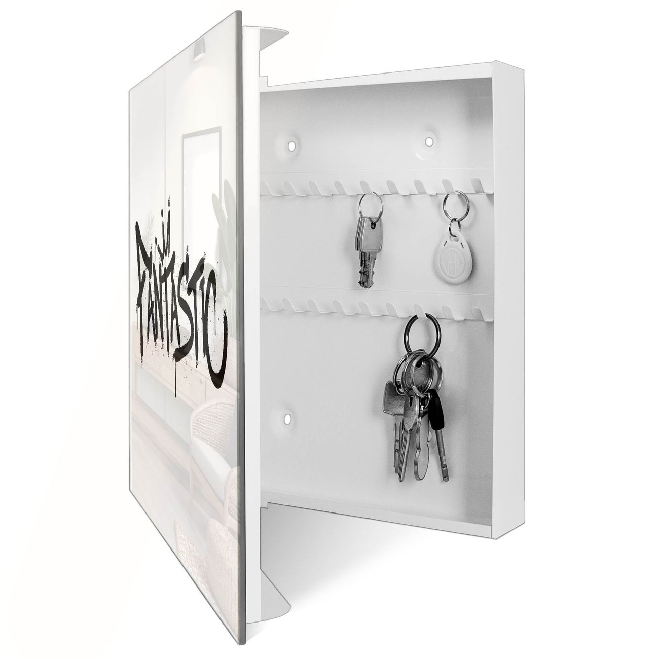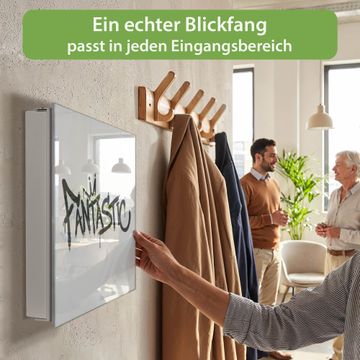 Bringe Ordnung und Eleganz in deinen Eingangsbereich mit dem banjado Schlüsselkasten Motiv Motiv Fantastic Graffiti. Die moderne Schlüsselbox kombiniert funktionales Design mit hochwertiger Verarbeitung und wird so zu einem echten Hingucker in Flur, Büro oder Ferienwohnung. ✅ Stilvolle Schlüsselaufbewahrung mit Glasfront im Motiv Motiv Fantastic Graffiti Der Design-Schlüsselkasten Motiv Motiv Fantastic Graffiti bietet Platz für bis zu 50 Schlüssel, die auf 5 stabilen Reihen mit je 10 Haken übersichtlich verstaut werden. Mit seinen kompakten Maßen von 30 x 30 x 5 cm passt die Schlüsselbox perfekt auch in kleinere Räume. Der weiß lackierte Stahlkorpus mit rechts angeschlagenem Türscharnier harmoniert mit der Glasfront und fügt sich nahtlos in jedes Wohnambiente ein. Ob als Schlüsselorganizer für Zuhause oder als praktische Lösung für Büros, Praxen und Gewerbe, der banjado Schlüsselkasten sorgt für Ordnung und Übersicht. Dank der magnetischen, mit Kreidestiften beschreibbaren Glasfront kannst du Notizen anheften oder Termine direkt auf der Oberfläche festhalten. Die Schlüsselbox Motiv Motiv Fantastic Graffiti zur Wandmontage wird inklusive Befestigungsmaterial geliefert und ist schnell angebracht. So hast du deine Schlüssel jederzeit griffbereit und zugleich stilvoll verstaut. Mit diesem banjado Schlüsselkasten Motiv Motiv Fantastic Graffiti kombinierst du praktische Aufbewahrung mit stilvollem Wohndesign. Ob privat oder geschäftlich, die Schlüsselbox sorgt für mehr Ordnung, Übersicht und ein wohnliches Ambiente.Vorteile im Überblick