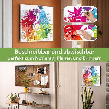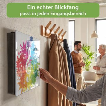 Bringe Ordnung und Eleganz in deinen Eingangsbereich mit dem banjado Schlüsselkasten Motiv Motiv Farbensymphonie. Die moderne Schlüsselbox kombiniert funktionales Design mit hochwertiger Verarbeitung und wird so zu einem echten Hingucker in Flur, Büro oder Ferienwohnung. ✅ Stilvolle Schlüsselaufbewahrung mit Glasfront im Motiv Motiv Farbensymphonie Der Design-Schlüsselkasten Motiv Motiv Farbensymphonie bietet Platz für bis zu 50 Schlüssel, die auf 5 stabilen Reihen mit je 10 Haken übersichtlich verstaut werden. Mit seinen kompakten Maßen von 30 x 30 x 5 cm passt die Schlüsselbox perfekt auch in kleinere Räume. Der schwarz lackierte Stahlkorpus mit rechts angeschlagenem Türscharnier harmoniert mit der Glasfront und fügt sich nahtlos in jedes Wohnambiente ein. Ob als Schlüsselorganizer für Zuhause oder als praktische Lösung für Büros, Praxen und Gewerbe, der banjado Schlüsselkasten sorgt für Ordnung und Übersicht. Dank der magnetischen, mit Kreidestiften beschreibbaren Glasfront kannst du Notizen anheften oder Termine direkt auf der Oberfläche festhalten. Die Schlüsselbox Motiv Motiv Farbensymphonie zur Wandmontage wird inklusive Befestigungsmaterial geliefert und ist schnell angebracht. So hast du deine Schlüssel jederzeit griffbereit und zugleich stilvoll verstaut. Mit diesem banjado Schlüsselkasten Motiv Motiv Farbensymphonie kombinierst du praktische Aufbewahrung mit stilvollem Wohndesign. Ob privat oder geschäftlich, die Schlüsselbox sorgt für mehr Ordnung, Übersicht und ein wohnliches Ambiente.Vorteile im Überblick