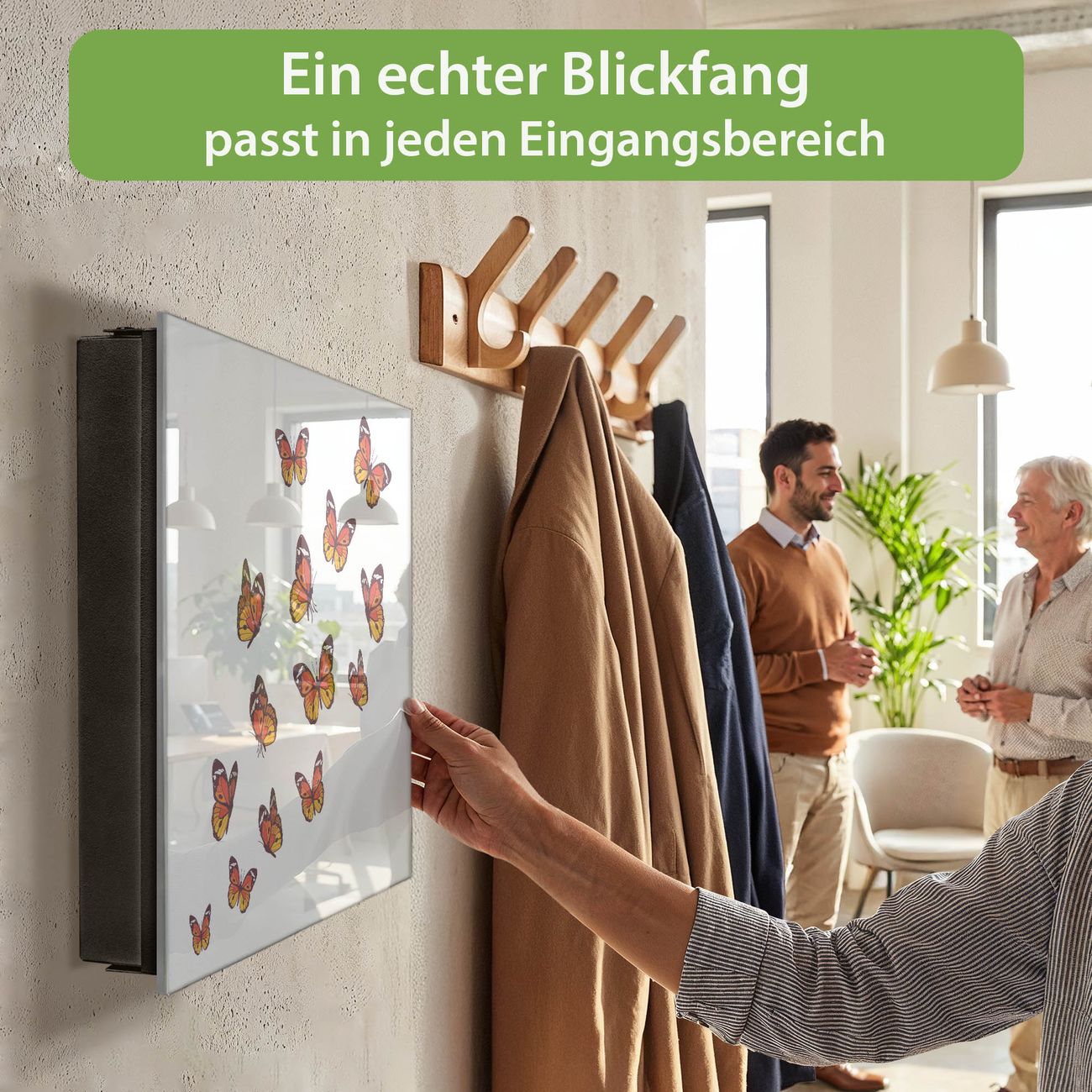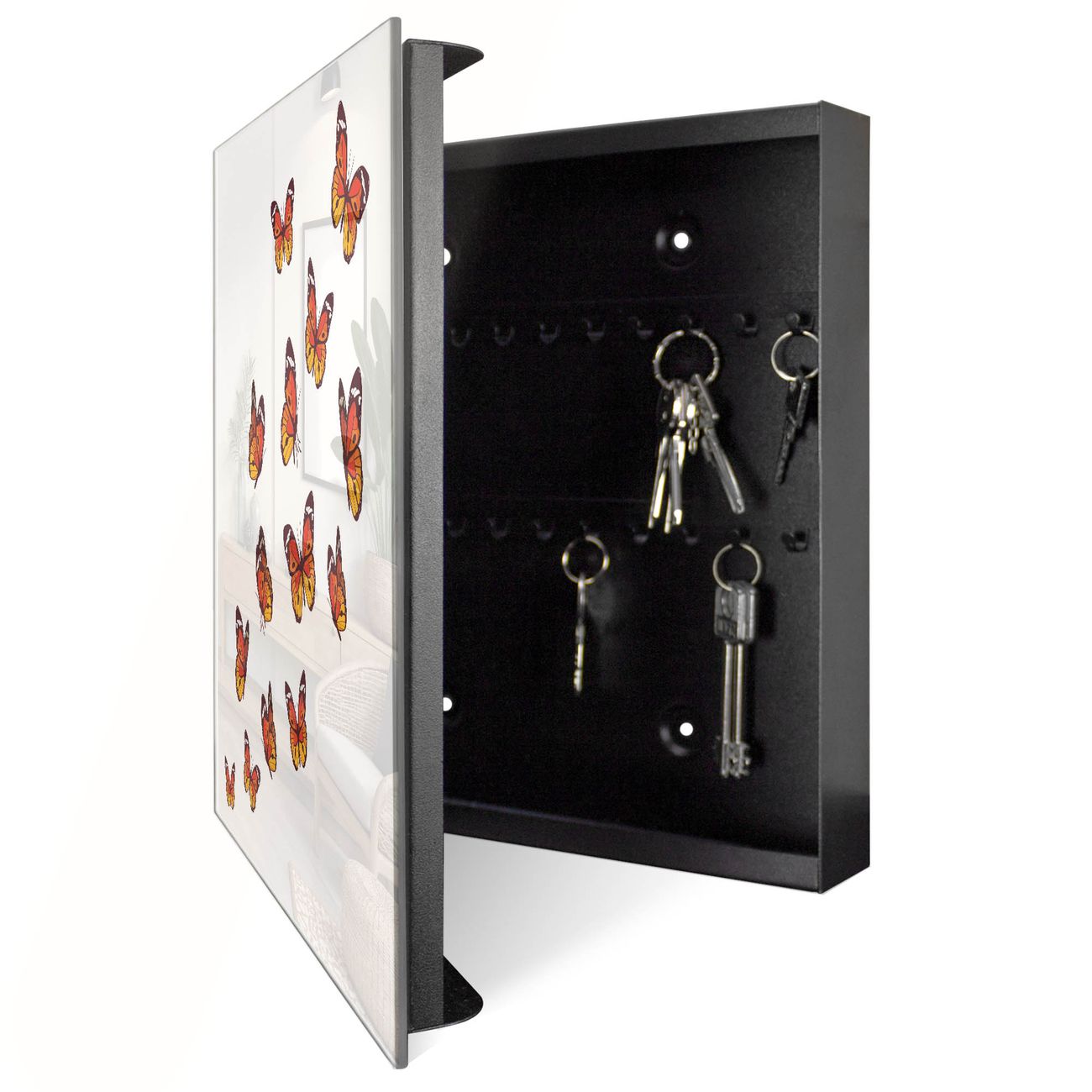 Bringe Ordnung und Eleganz in deinen Eingangsbereich mit dem banjado Schlüsselkasten Motiv Motiv Farbige Schmetterlinge. Die moderne Schlüsselbox kombiniert funktionales Design mit hochwertiger Verarbeitung und wird so zu einem echten Hingucker in Flur, Büro oder Ferienwohnung. ✅ Stilvolle Schlüsselaufbewahrung mit Glasfront im Motiv Motiv Farbige Schmetterlinge Der Design-Schlüsselkasten Motiv Motiv Farbige Schmetterlinge bietet Platz für bis zu 50 Schlüssel, die auf 5 stabilen Reihen mit je 10 Haken übersichtlich verstaut werden. Mit seinen kompakten Maßen von 30 x 30 x 5 cm passt die Schlüsselbox perfekt auch in kleinere Räume. Der schwarz lackierte Stahlkorpus mit rechts angeschlagenem Türscharnier harmoniert mit der Glasfront und fügt sich nahtlos in jedes Wohnambiente ein. Ob als Schlüsselorganizer für Zuhause oder als praktische Lösung für Büros, Praxen und Gewerbe, der banjado Schlüsselkasten sorgt für Ordnung und Übersicht. Dank der magnetischen, mit Kreidestiften beschreibbaren Glasfront kannst du Notizen anheften oder Termine direkt auf der Oberfläche festhalten. Die Schlüsselbox Motiv Motiv Farbige Schmetterlinge zur Wandmontage wird inklusive Befestigungsmaterial geliefert und ist schnell angebracht. So hast du deine Schlüssel jederzeit griffbereit und zugleich stilvoll verstaut. Mit diesem banjado Schlüsselkasten Motiv Motiv Farbige Schmetterlinge kombinierst du praktische Aufbewahrung mit stilvollem Wohndesign. Ob privat oder geschäftlich, die Schlüsselbox sorgt für mehr Ordnung, Übersicht und ein wohnliches Ambiente.Vorteile im Überblick