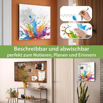 Bringe Ordnung und Eleganz in deinen Eingangsbereich mit dem banjado Schlüsselkasten Motiv Motiv Farbspritzer-Explosion. Die moderne Schlüsselbox kombiniert funktionales Design mit hochwertiger Verarbeitung und wird so zu einem echten Hingucker in Flur, Büro oder Ferienwohnung. ✅ Stilvolle Schlüsselaufbewahrung mit Glasfront im Motiv Motiv Farbspritzer-Explosion Der Design-Schlüsselkasten Motiv Motiv Farbspritzer-Explosion bietet Platz für bis zu 50 Schlüssel, die auf 5 stabilen Reihen mit je 10 Haken übersichtlich verstaut werden. Mit seinen kompakten Maßen von 30 x 30 x 5 cm passt die Schlüsselbox perfekt auch in kleinere Räume. Der schwarz lackierte Stahlkorpus mit rechts angeschlagenem Türscharnier harmoniert mit der Glasfront und fügt sich nahtlos in jedes Wohnambiente ein. Ob als Schlüsselorganizer für Zuhause oder als praktische Lösung für Büros, Praxen und Gewerbe, der banjado Schlüsselkasten sorgt für Ordnung und Übersicht. Dank der magnetischen, mit Kreidestiften beschreibbaren Glasfront kannst du Notizen anheften oder Termine direkt auf der Oberfläche festhalten. Die Schlüsselbox Motiv Motiv Farbspritzer-Explosion zur Wandmontage wird inklusive Befestigungsmaterial geliefert und ist schnell angebracht. So hast du deine Schlüssel jederzeit griffbereit und zugleich stilvoll verstaut. Mit diesem banjado Schlüsselkasten Motiv Motiv Farbspritzer-Explosion kombinierst du praktische Aufbewahrung mit stilvollem Wohndesign. Ob privat oder geschäftlich, die Schlüsselbox sorgt für mehr Ordnung, Übersicht und ein wohnliches Ambiente.Vorteile im Überblick