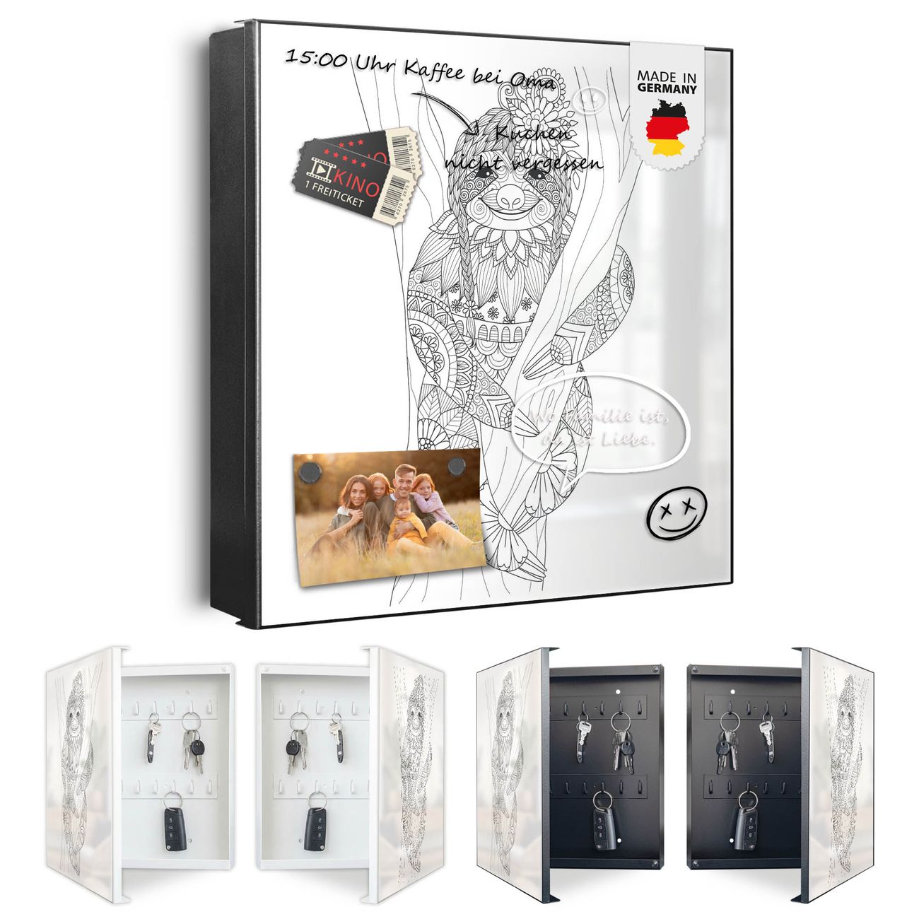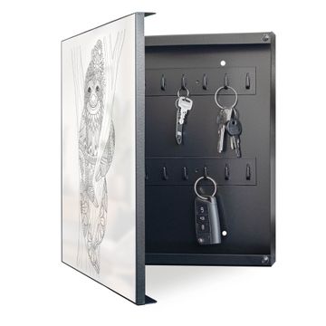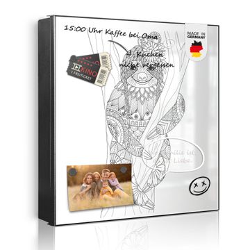 Bringe Ordnung und Eleganz in deinen Eingangsbereich mit dem banjado Schlüsselkasten Motiv Motiv Faultier gezeichnet 2. Die moderne Schlüsselbox kombiniert funktionales Design mit hochwertiger Verarbeitung und wird so zu einem echten Hingucker in Flur, Büro oder Ferienwohnung. ✅ Stilvolle Schlüsselaufbewahrung mit Motiv Motiv Faultier gezeichnet 2 Der Design-Schlüsselkasten Motiv Motiv Faultier gezeichnet 2 bietet Platz für bis zu 32 Schlüssel, die auf 4 stabilen Reihen mit je 8 Haken übersichtlich verstaut werden. Mit seinen kompakten Maßen von 30 x 30 x 5 cm passt die Schlüsselbox perfekt auch in kleinere Räume. Der schwarz lackierte Stahlkorpus mit links angeschlagenem Türscharnier harmoniert mit gedruckten Folie auf der Front und fügt sich nahtlos in jedes Wohnambiente ein. Ob als Schlüsselorganizer für Zuhause oder als praktische Lösung für Büros, Praxen und Gewerbe, der banjado Schlüsselkasten sorgt für Ordnung und Übersicht. Dank der magnetischen, mit Kreidestiften beschreibbaren Folie auf der Front kannst du Notizen anheften oder Termine direkt auf der Oberfläche festhalten. Die Schlüsselbox Motiv Motiv Faultier gezeichnet 2 zur Wandmontage wird inklusive Befestigungsmaterial geliefert und ist schnell angebracht. So hast du deine Schlüssel jederzeit griffbereit und zugleich stilvoll verstaut. Mit diesem banjado Schlüsselkasten Motiv Motiv Faultier gezeichnet 2 kombinierst du praktische Aufbewahrung mit stilvollem Wohndesign. Ob privat oder geschäftlich, die Schlüsselbox sorgt für mehr Ordnung, Übersicht und ein wohnliches Ambiente.Vorteile im Überblick