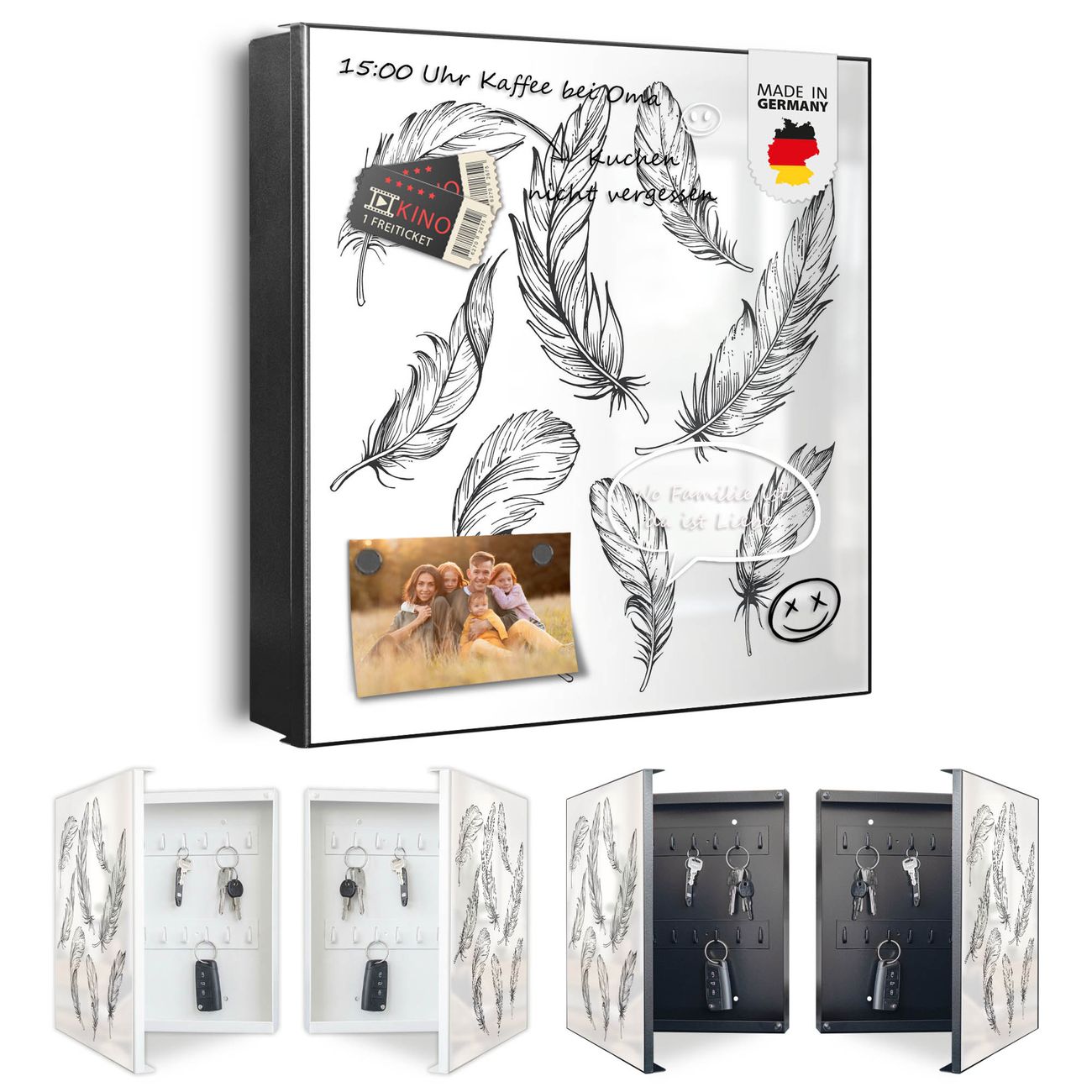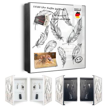 Bringe Ordnung und Eleganz in deinen Eingangsbereich mit dem banjado Schlüsselkasten Motiv Motiv Federn 2. Die moderne Schlüsselbox kombiniert funktionales Design mit hochwertiger Verarbeitung und wird so zu einem echten Hingucker in Flur, Büro oder Ferienwohnung. ✅ Stilvolle Schlüsselaufbewahrung mit Motiv Motiv Federn 2 Der Design-Schlüsselkasten Motiv Motiv Federn 2 bietet Platz für bis zu 32 Schlüssel, die auf 4 stabilen Reihen mit je 8 Haken übersichtlich verstaut werden. Mit seinen kompakten Maßen von 30 x 30 x 5 cm passt die Schlüsselbox perfekt auch in kleinere Räume. Der schwarz lackierte Stahlkorpus mit rechts angeschlagenem Türscharnier harmoniert mit gedruckten Folie auf der Front und fügt sich nahtlos in jedes Wohnambiente ein. Ob als Schlüsselorganizer für Zuhause oder als praktische Lösung für Büros, Praxen und Gewerbe, der banjado Schlüsselkasten sorgt für Ordnung und Übersicht. Dank der magnetischen, mit Kreidestiften beschreibbaren Folie auf der Front kannst du Notizen anheften oder Termine direkt auf der Oberfläche festhalten. Die Schlüsselbox Motiv Motiv Federn 2 zur Wandmontage wird inklusive Befestigungsmaterial geliefert und ist schnell angebracht. So hast du deine Schlüssel jederzeit griffbereit und zugleich stilvoll verstaut. Mit diesem banjado Schlüsselkasten Motiv Motiv Federn 2 kombinierst du praktische Aufbewahrung mit stilvollem Wohndesign. Ob privat oder geschäftlich, die Schlüsselbox sorgt für mehr Ordnung, Übersicht und ein wohnliches Ambiente.Vorteile im Überblick