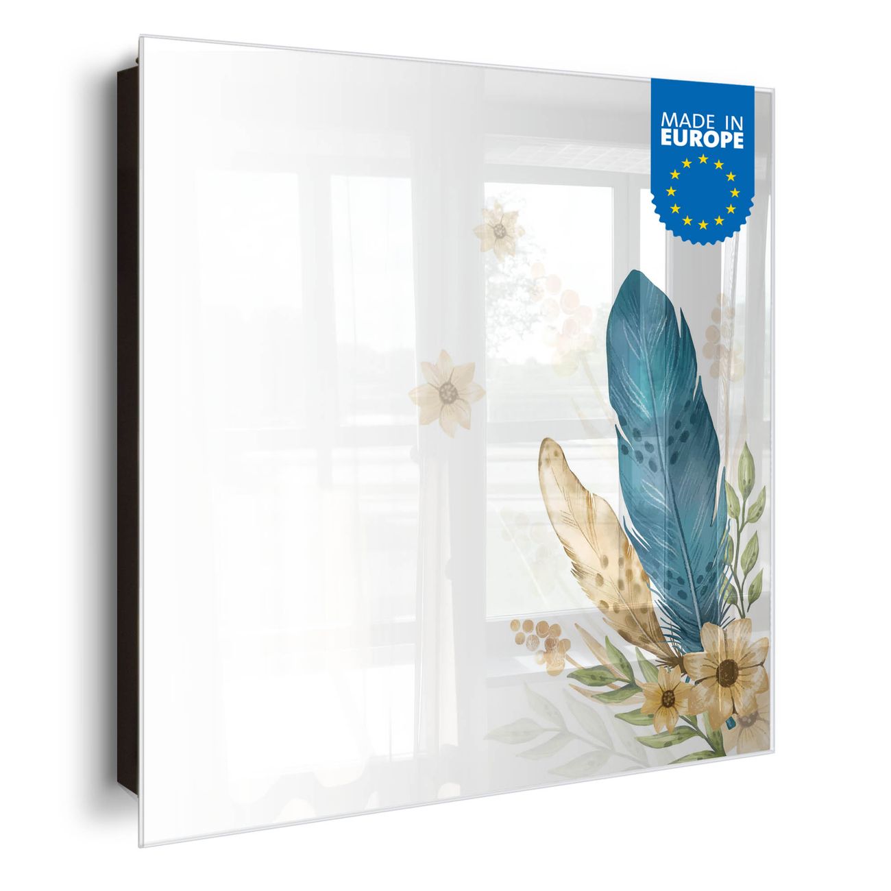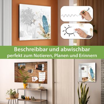 Bringe Ordnung und Eleganz in deinen Eingangsbereich mit dem banjado Schlüsselkasten Motiv Motiv Federn und Blüten. Die moderne Schlüsselbox kombiniert funktionales Design mit hochwertiger Verarbeitung und wird so zu einem echten Hingucker in Flur, Büro oder Ferienwohnung. ✅ Stilvolle Schlüsselaufbewahrung mit Glasfront im Motiv Motiv Federn und Blüten Der Design-Schlüsselkasten Motiv Motiv Federn und Blüten bietet Platz für bis zu 50 Schlüssel, die auf 5 stabilen Reihen mit je 10 Haken übersichtlich verstaut werden. Mit seinen kompakten Maßen von 30 x 30 x 5 cm passt die Schlüsselbox perfekt auch in kleinere Räume. Der schwarz lackierte Stahlkorpus mit rechts angeschlagenem Türscharnier harmoniert mit der Glasfront und fügt sich nahtlos in jedes Wohnambiente ein. Ob als Schlüsselorganizer für Zuhause oder als praktische Lösung für Büros, Praxen und Gewerbe, der banjado Schlüsselkasten sorgt für Ordnung und Übersicht. Dank der magnetischen, mit Kreidestiften beschreibbaren Glasfront kannst du Notizen anheften oder Termine direkt auf der Oberfläche festhalten. Die Schlüsselbox Motiv Motiv Federn und Blüten zur Wandmontage wird inklusive Befestigungsmaterial geliefert und ist schnell angebracht. So hast du deine Schlüssel jederzeit griffbereit und zugleich stilvoll verstaut. Mit diesem banjado Schlüsselkasten Motiv Motiv Federn und Blüten kombinierst du praktische Aufbewahrung mit stilvollem Wohndesign. Ob privat oder geschäftlich, die Schlüsselbox sorgt für mehr Ordnung, Übersicht und ein wohnliches Ambiente.Vorteile im Überblick