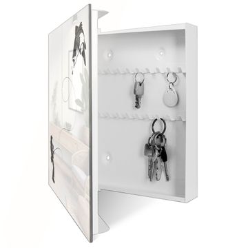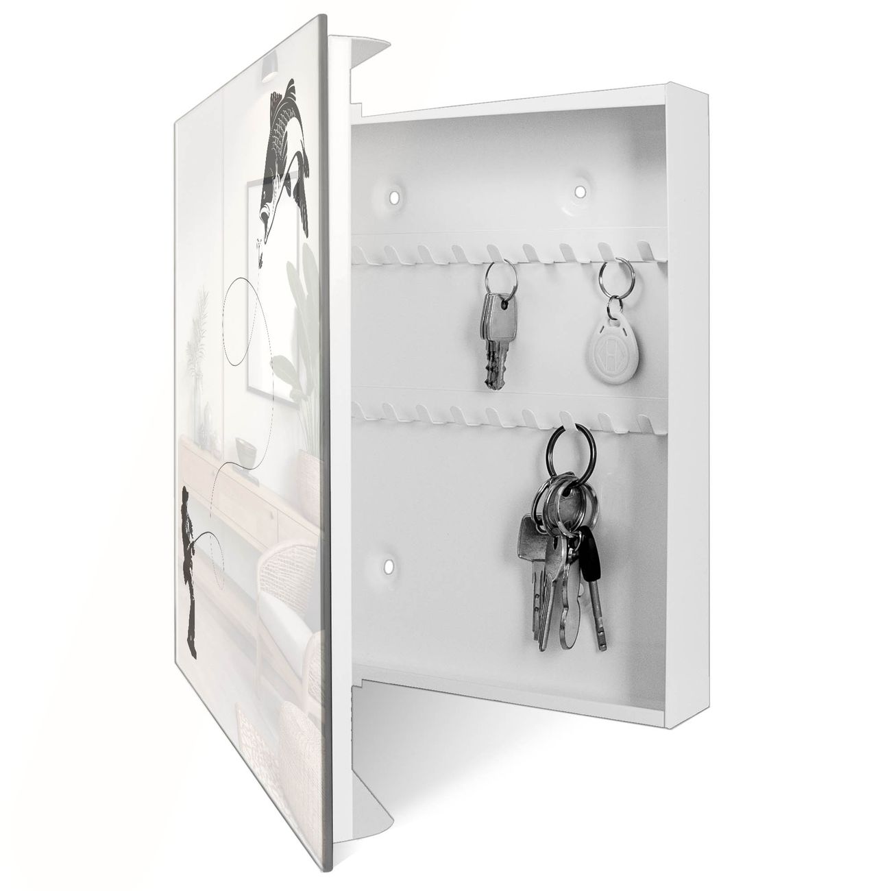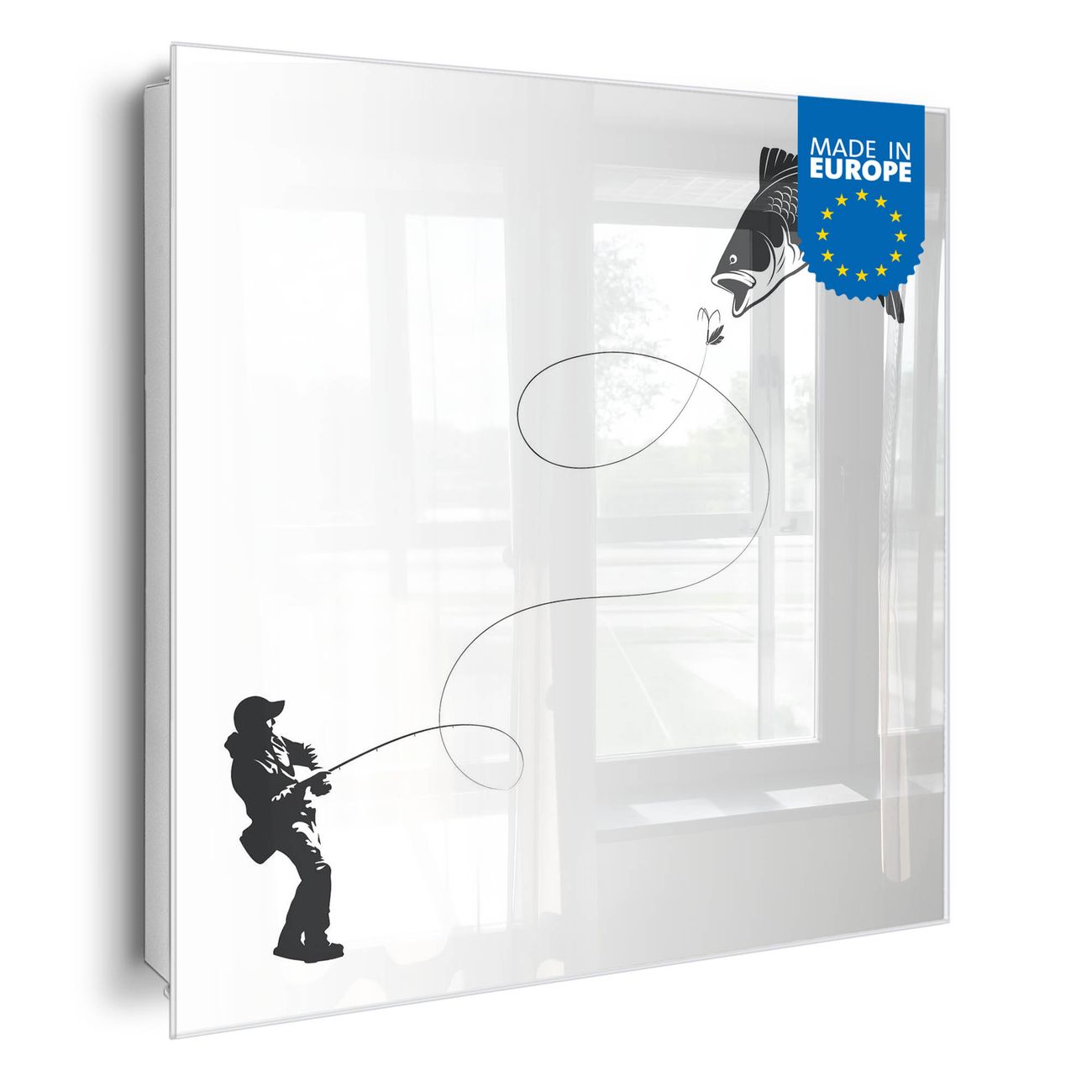 Bringe Ordnung und Eleganz in deinen Eingangsbereich mit dem banjado Schlüsselkasten Motiv Motiv Fischerfreude. Die moderne Schlüsselbox kombiniert funktionales Design mit hochwertiger Verarbeitung und wird so zu einem echten Hingucker in Flur, Büro oder Ferienwohnung. ✅ Stilvolle Schlüsselaufbewahrung mit Glasfront im Motiv Motiv Fischerfreude Der Design-Schlüsselkasten Motiv Motiv Fischerfreude bietet Platz für bis zu 50 Schlüssel, die auf 5 stabilen Reihen mit je 10 Haken übersichtlich verstaut werden. Mit seinen kompakten Maßen von 30 x 30 x 5 cm passt die Schlüsselbox perfekt auch in kleinere Räume. Der weiß lackierte Stahlkorpus mit rechts angeschlagenem Türscharnier harmoniert mit der Glasfront und fügt sich nahtlos in jedes Wohnambiente ein. Ob als Schlüsselorganizer für Zuhause oder als praktische Lösung für Büros, Praxen und Gewerbe, der banjado Schlüsselkasten sorgt für Ordnung und Übersicht. Dank der magnetischen, mit Kreidestiften beschreibbaren Glasfront kannst du Notizen anheften oder Termine direkt auf der Oberfläche festhalten. Die Schlüsselbox Motiv Motiv Fischerfreude zur Wandmontage wird inklusive Befestigungsmaterial geliefert und ist schnell angebracht. So hast du deine Schlüssel jederzeit griffbereit und zugleich stilvoll verstaut. Mit diesem banjado Schlüsselkasten Motiv Motiv Fischerfreude kombinierst du praktische Aufbewahrung mit stilvollem Wohndesign. Ob privat oder geschäftlich, die Schlüsselbox sorgt für mehr Ordnung, Übersicht und ein wohnliches Ambiente.Vorteile im Überblick