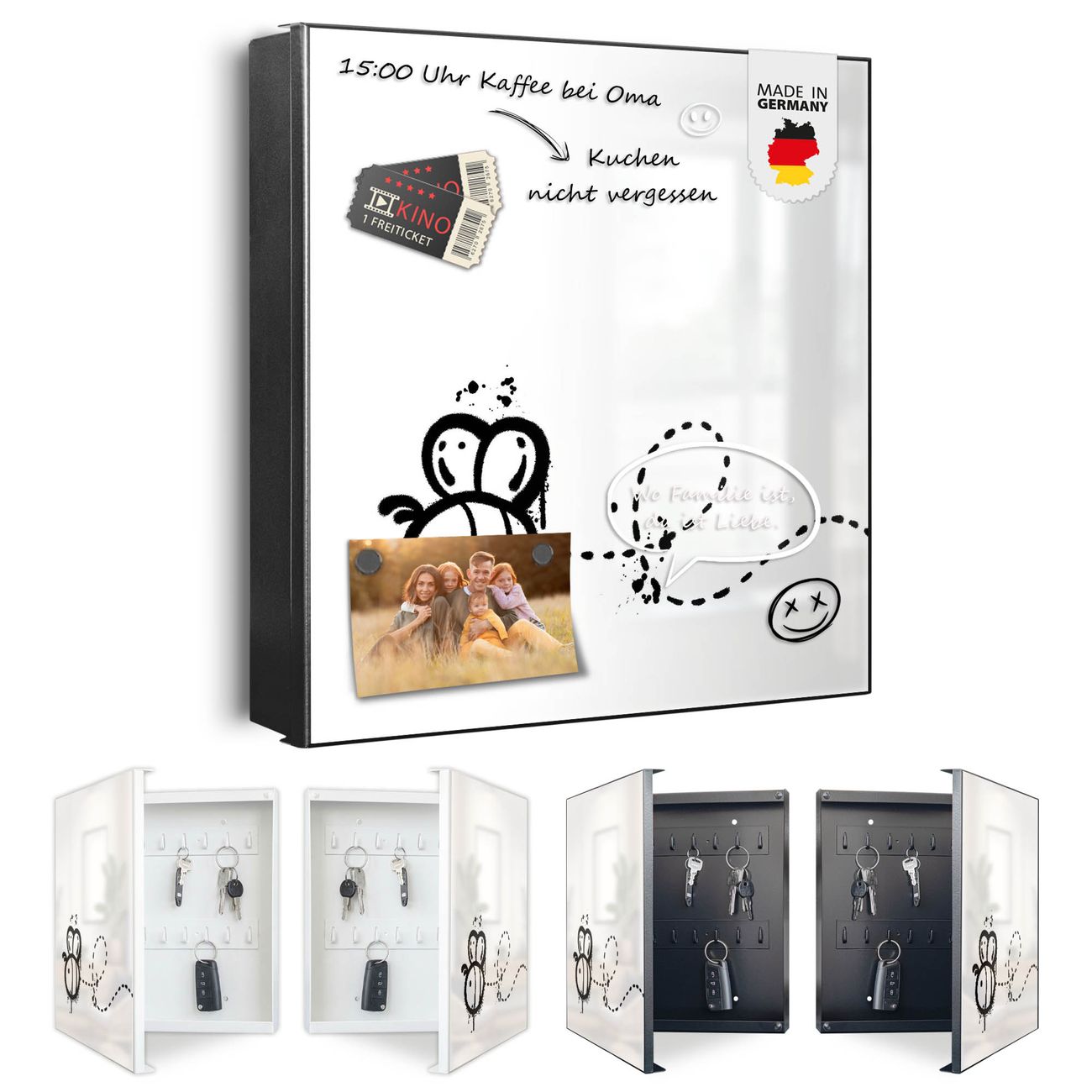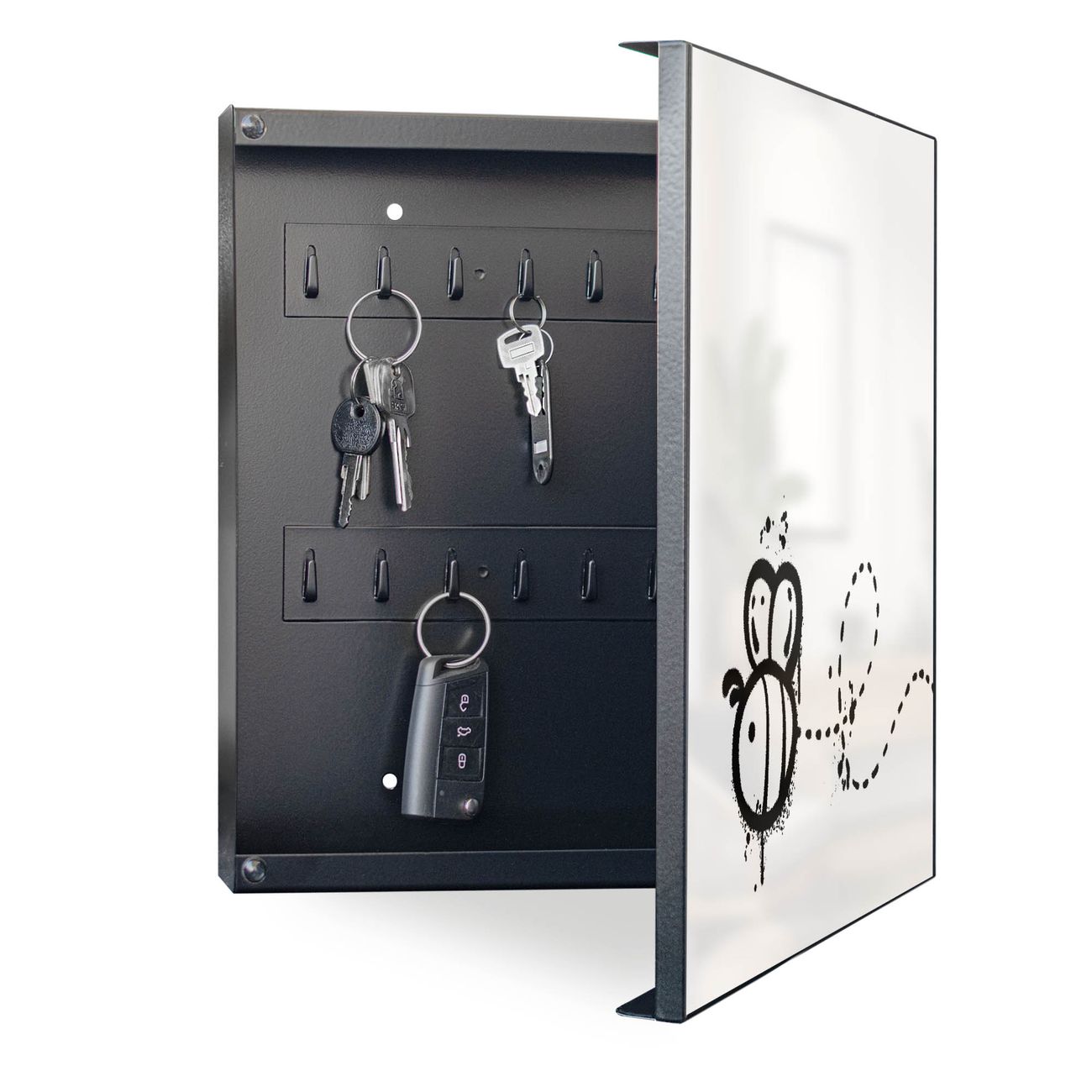 Bringe Ordnung und Eleganz in deinen Eingangsbereich mit dem banjado Schlüsselkasten Motiv Motiv Fliegende Biene Graffiti. Die moderne Schlüsselbox kombiniert funktionales Design mit hochwertiger Verarbeitung und wird so zu einem echten Hingucker in Flur, Büro oder Ferienwohnung. ✅ Stilvolle Schlüsselaufbewahrung mit Motiv Motiv Fliegende Biene Graffiti Der Design-Schlüsselkasten Motiv Motiv Fliegende Biene Graffiti bietet Platz für bis zu 32 Schlüssel, die auf 4 stabilen Reihen mit je 8 Haken übersichtlich verstaut werden. Mit seinen kompakten Maßen von 30 x 30 x 5 cm passt die Schlüsselbox perfekt auch in kleinere Räume. Der schwarz lackierte Stahlkorpus mit rechts angeschlagenem Türscharnier harmoniert mit gedruckten Folie auf der Front und fügt sich nahtlos in jedes Wohnambiente ein. Ob als Schlüsselorganizer für Zuhause oder als praktische Lösung für Büros, Praxen und Gewerbe, der banjado Schlüsselkasten sorgt für Ordnung und Übersicht. Dank der magnetischen, mit Kreidestiften beschreibbaren Folie auf der Front kannst du Notizen anheften oder Termine direkt auf der Oberfläche festhalten. Die Schlüsselbox Motiv Motiv Fliegende Biene Graffiti zur Wandmontage wird inklusive Befestigungsmaterial geliefert und ist schnell angebracht. So hast du deine Schlüssel jederzeit griffbereit und zugleich stilvoll verstaut. Mit diesem banjado Schlüsselkasten Motiv Motiv Fliegende Biene Graffiti kombinierst du praktische Aufbewahrung mit stilvollem Wohndesign. Ob privat oder geschäftlich, die Schlüsselbox sorgt für mehr Ordnung, Übersicht und ein wohnliches Ambiente.Vorteile im Überblick