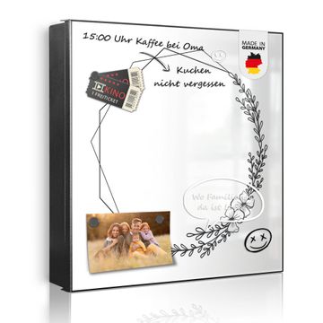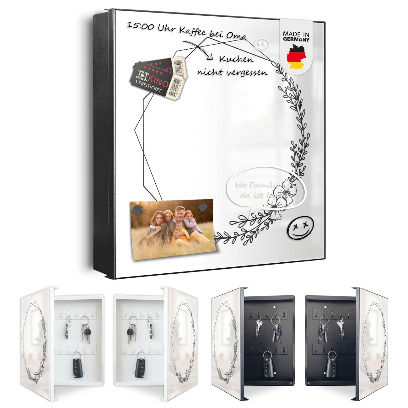 Bringe Ordnung und Eleganz in deinen Eingangsbereich mit dem banjado Schlüsselkasten Motiv Motiv Floral Geometric Frame. Die moderne Schlüsselbox kombiniert funktionales Design mit hochwertiger Verarbeitung und wird so zu einem echten Hingucker in Flur, Büro oder Ferienwohnung. ✅ Stilvolle Schlüsselaufbewahrung mit Motiv Motiv Floral Geometric Frame Der Design-Schlüsselkasten Motiv Motiv Floral Geometric Frame bietet Platz für bis zu 32 Schlüssel, die auf 4 stabilen Reihen mit je 8 Haken übersichtlich verstaut werden. Mit seinen kompakten Maßen von 30 x 30 x 5 cm passt die Schlüsselbox perfekt auch in kleinere Räume. Der schwarz lackierte Stahlkorpus mit rechts angeschlagenem Türscharnier harmoniert mit gedruckten Folie auf der Front und fügt sich nahtlos in jedes Wohnambiente ein. Ob als Schlüsselorganizer für Zuhause oder als praktische Lösung für Büros, Praxen und Gewerbe, der banjado Schlüsselkasten sorgt für Ordnung und Übersicht. Dank der magnetischen, mit Kreidestiften beschreibbaren Folie auf der Front kannst du Notizen anheften oder Termine direkt auf der Oberfläche festhalten. Die Schlüsselbox Motiv Motiv Floral Geometric Frame zur Wandmontage wird inklusive Befestigungsmaterial geliefert und ist schnell angebracht. So hast du deine Schlüssel jederzeit griffbereit und zugleich stilvoll verstaut. Mit diesem banjado Schlüsselkasten Motiv Motiv Floral Geometric Frame kombinierst du praktische Aufbewahrung mit stilvollem Wohndesign. Ob privat oder geschäftlich, die Schlüsselbox sorgt für mehr Ordnung, Übersicht und ein wohnliches Ambiente.Vorteile im Überblick