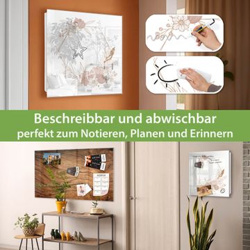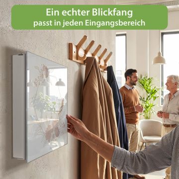 Bringe Ordnung und Eleganz in deinen Eingangsbereich mit dem banjado Schlüsselkasten Motiv Motiv Floral Geometrie. Die moderne Schlüsselbox kombiniert funktionales Design mit hochwertiger Verarbeitung und wird so zu einem echten Hingucker in Flur, Büro oder Ferienwohnung. ✅ Stilvolle Schlüsselaufbewahrung mit Glasfront im Motiv Motiv Floral Geometrie Der Design-Schlüsselkasten Motiv Motiv Floral Geometrie bietet Platz für bis zu 50 Schlüssel, die auf 5 stabilen Reihen mit je 10 Haken übersichtlich verstaut werden. Mit seinen kompakten Maßen von 30 x 30 x 5 cm passt die Schlüsselbox perfekt auch in kleinere Räume. Der weiß lackierte Stahlkorpus mit rechts angeschlagenem Türscharnier harmoniert mit der Glasfront und fügt sich nahtlos in jedes Wohnambiente ein. Ob als Schlüsselorganizer für Zuhause oder als praktische Lösung für Büros, Praxen und Gewerbe, der banjado Schlüsselkasten sorgt für Ordnung und Übersicht. Dank der magnetischen, mit Kreidestiften beschreibbaren Glasfront kannst du Notizen anheften oder Termine direkt auf der Oberfläche festhalten. Die Schlüsselbox Motiv Motiv Floral Geometrie zur Wandmontage wird inklusive Befestigungsmaterial geliefert und ist schnell angebracht. So hast du deine Schlüssel jederzeit griffbereit und zugleich stilvoll verstaut. Mit diesem banjado Schlüsselkasten Motiv Motiv Floral Geometrie kombinierst du praktische Aufbewahrung mit stilvollem Wohndesign. Ob privat oder geschäftlich, die Schlüsselbox sorgt für mehr Ordnung, Übersicht und ein wohnliches Ambiente.Vorteile im Überblick